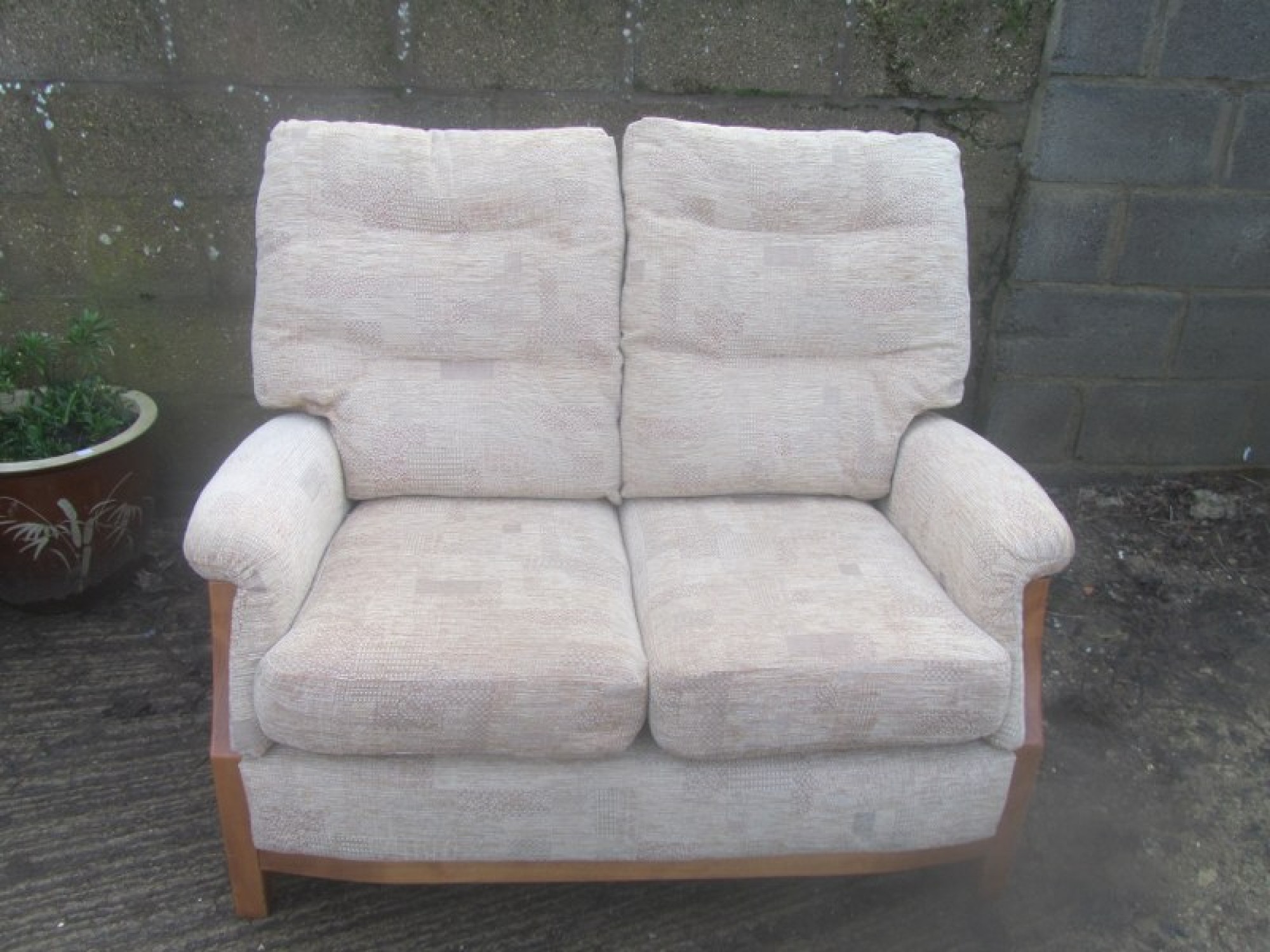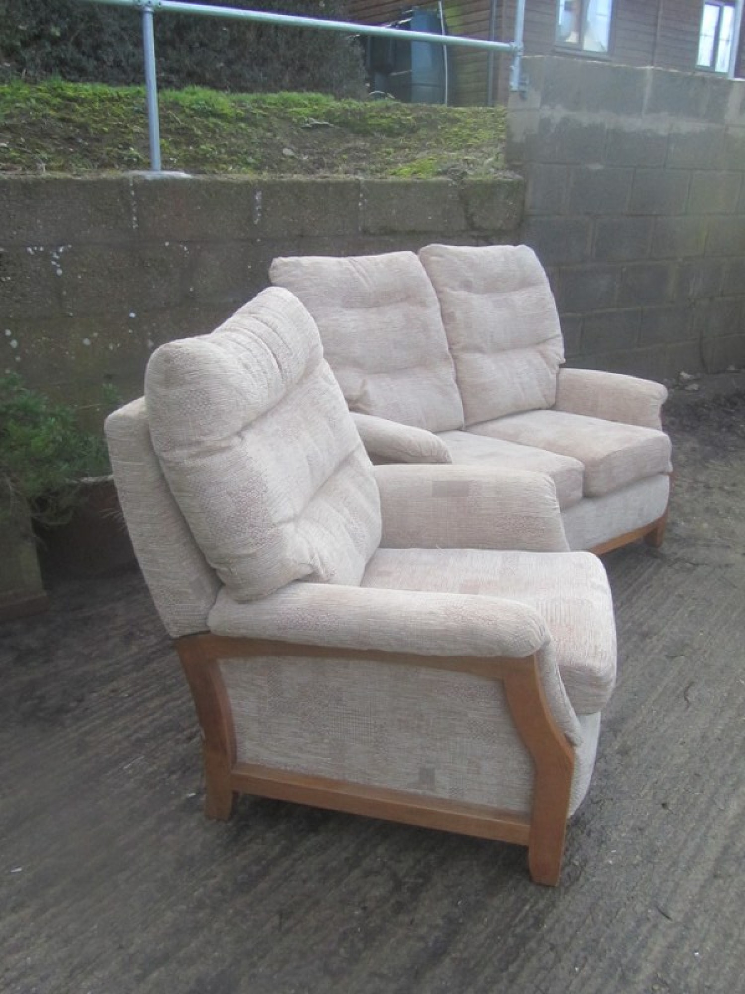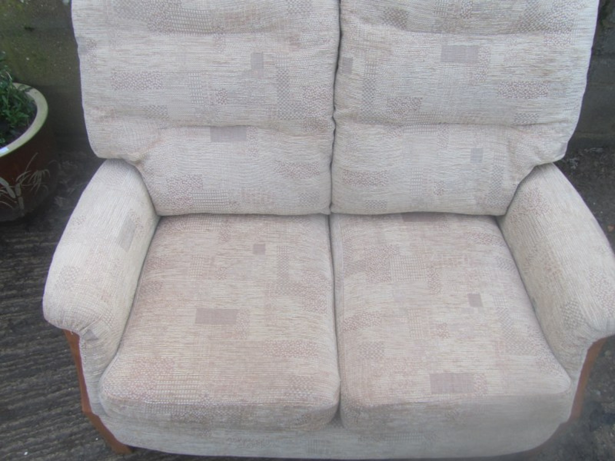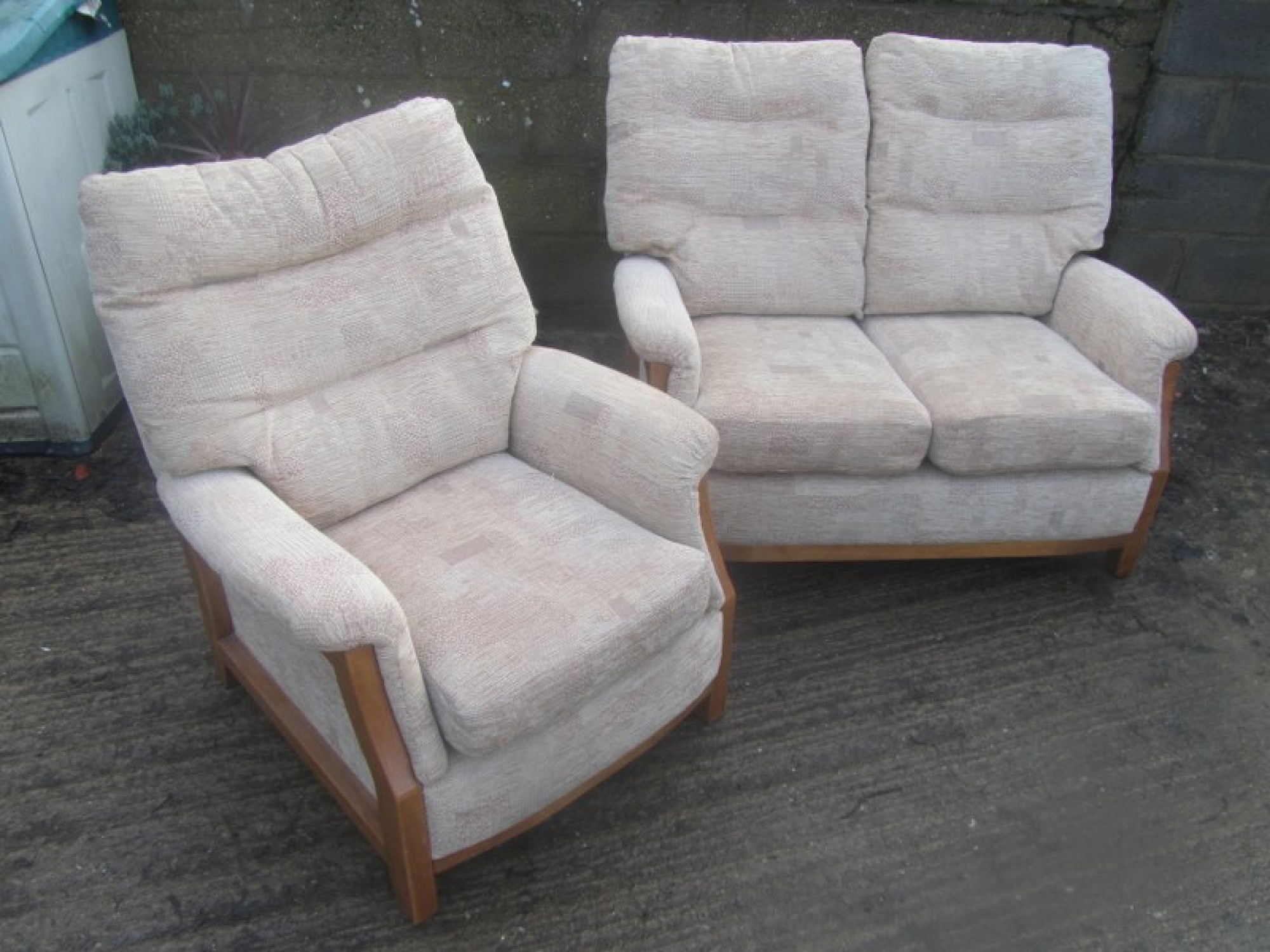 THIS IS A 2 PIECE SUITE, THERE IS A 3 SEATER SOFA AND 1 ARMCHAIR. THE SUITE IS COVERED IN CREAM COLOURED MATERIAL, REMOVABLE COVERS. IT IS COMFORTABLE, AVERAGE CONDITION. THE SOFA SIZES ARE BELOW. SEAT HEIGHT ON SOFA & CHAIRS IS 46cm. FOR SALE AS A SET.
