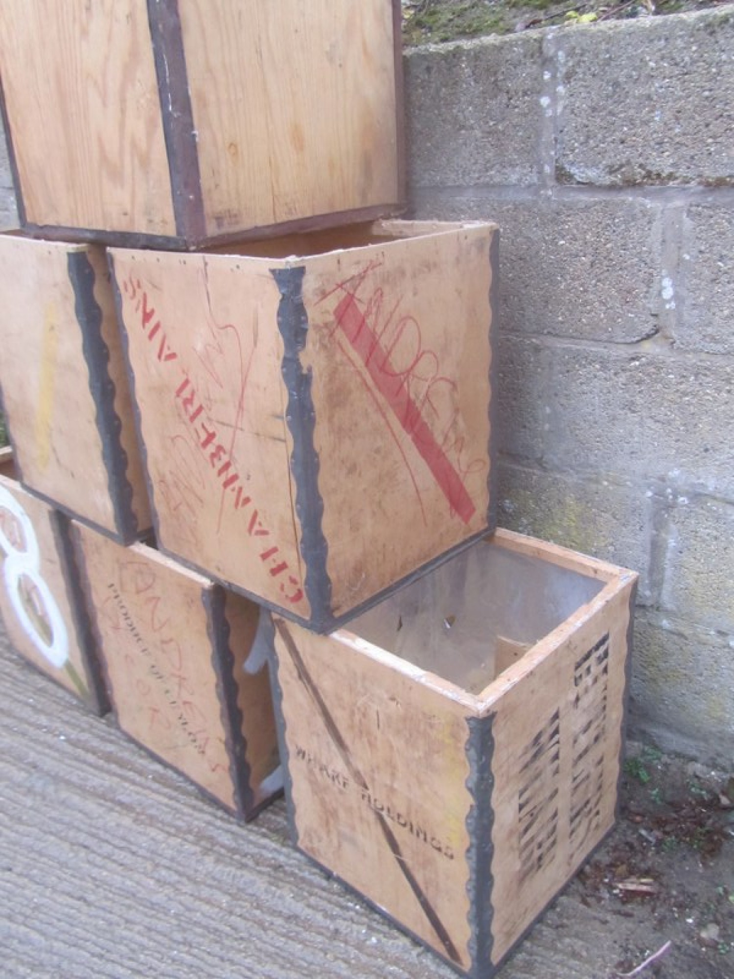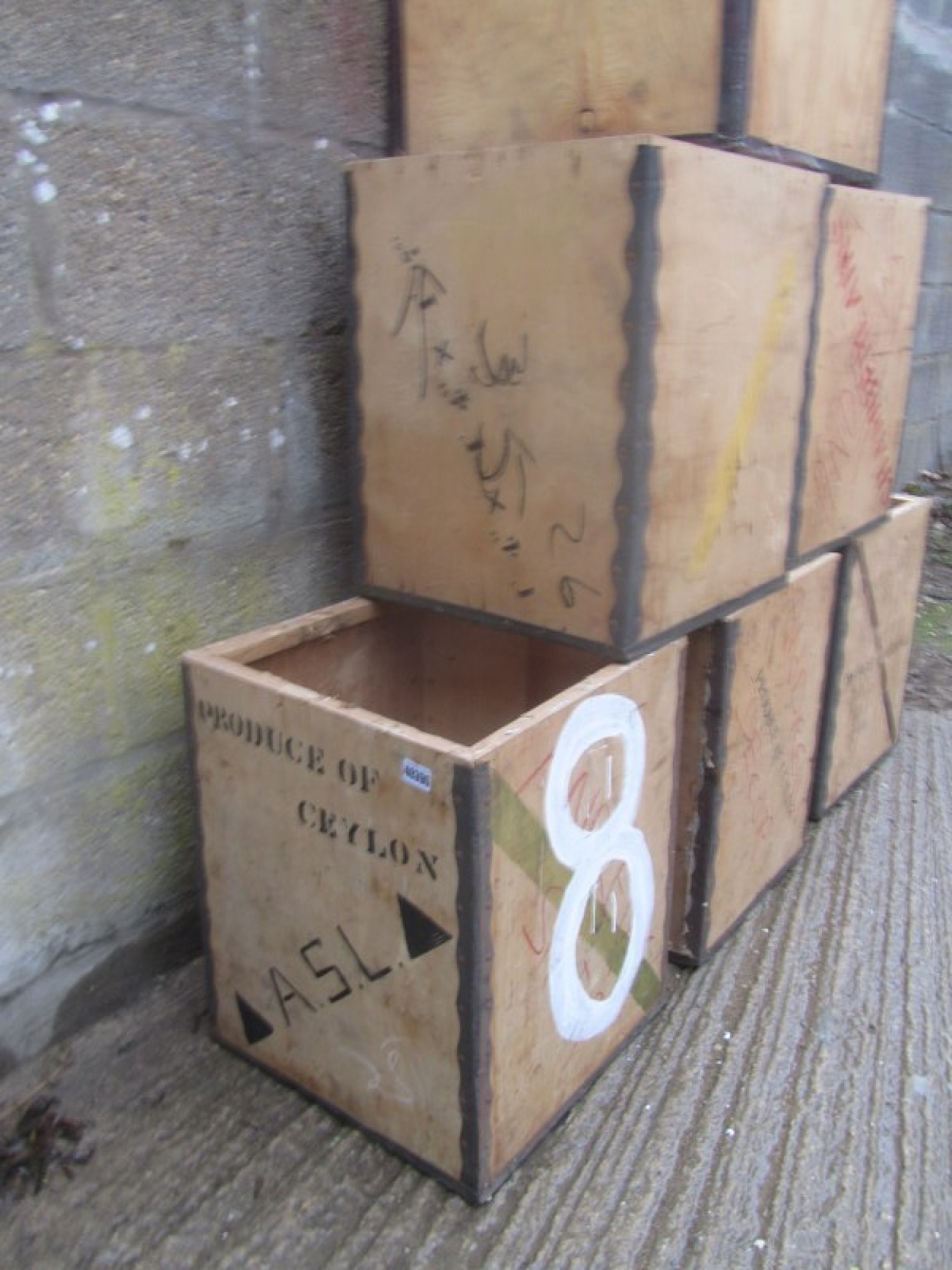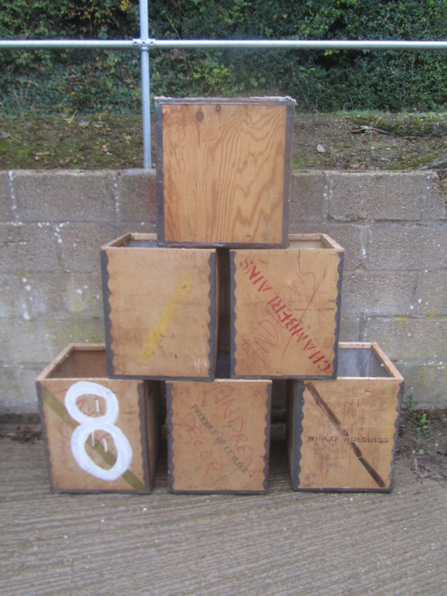 Items for Sale JOB LOT OF 6 x VINTAGE WOODEN TEA CHESTS / BOXES Share: View Larger Image View Larger Image View Larger Image View Larger Image View Larger Image Select to enlarge Swipe £ 50 - THE LOT 6 VINTAGE PLYWOOD TEA CHESTS. IN WORN CONDITION, THEY HAVE SAT IN A LOFT FOR YEARS. IDEAL FOR STORAGE OR DISPLAY. PRINTED LOGOS AND PAINTED NUMBERS ON THE SIDES. ADDITIONAL DETAILS RESERVE ITEM Condition:WORN Manufacture Date:1950s Height:51 cms Length:40 cms Depth:40 cms Item Number:40396 * Please complete all the fields below to send an enquiry about this product. Please reserve this item for me… Reset Send