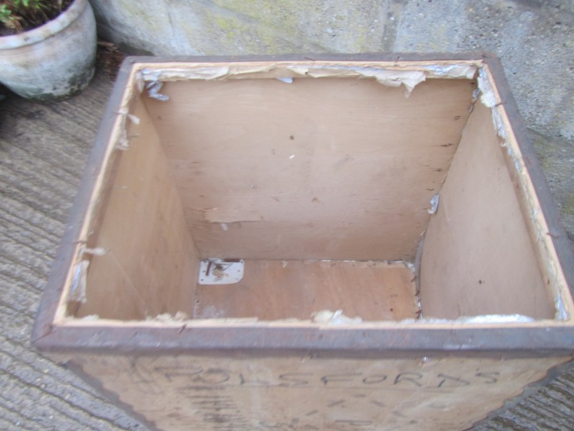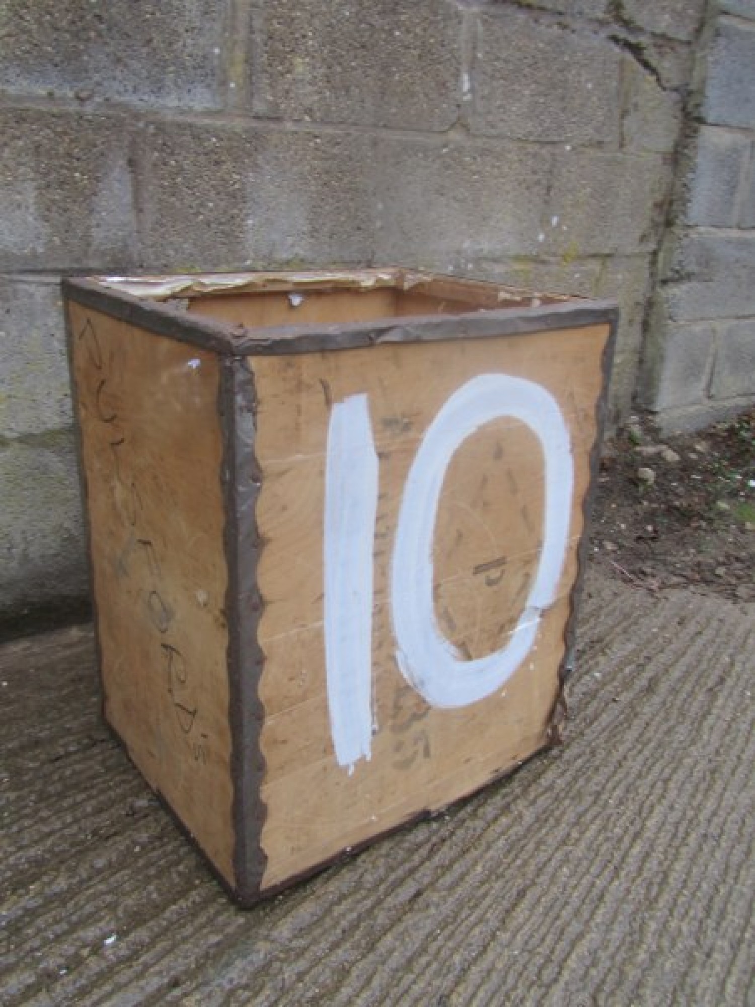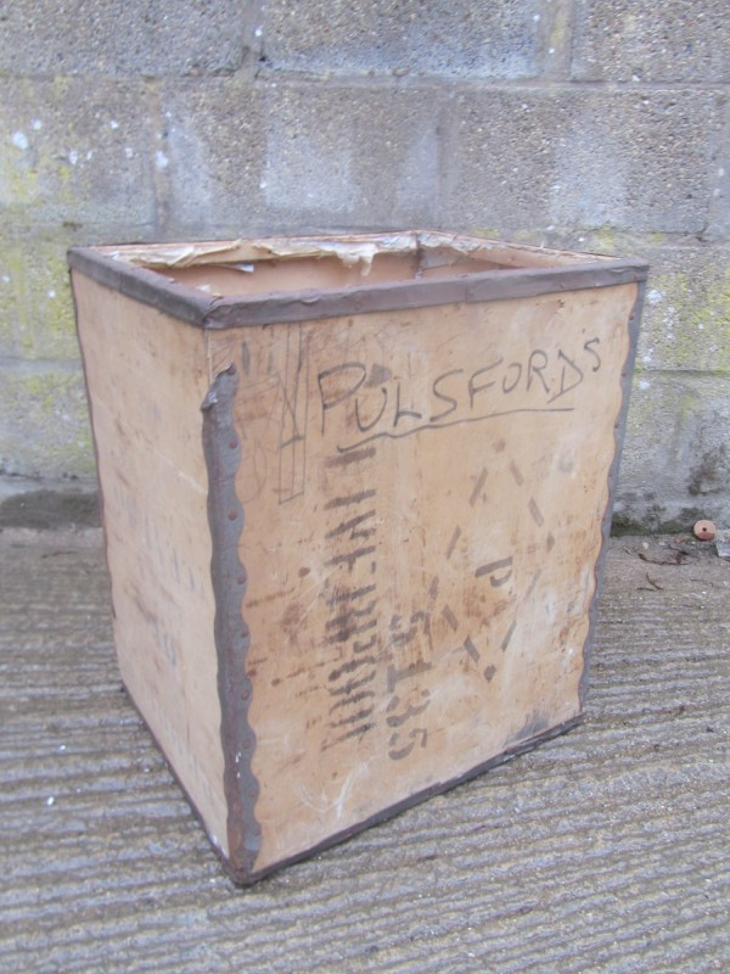 VINTAGE PLYWOOD TEA CHEST. IN WORN CONDITION, THEY HAVE SAT IN A LOFT FOR YEARS. IDEAL FOR STORAGE OR DISPLAY. PRINTED LOGOS AND PAINTED NUMBERS ON THE SIDES.