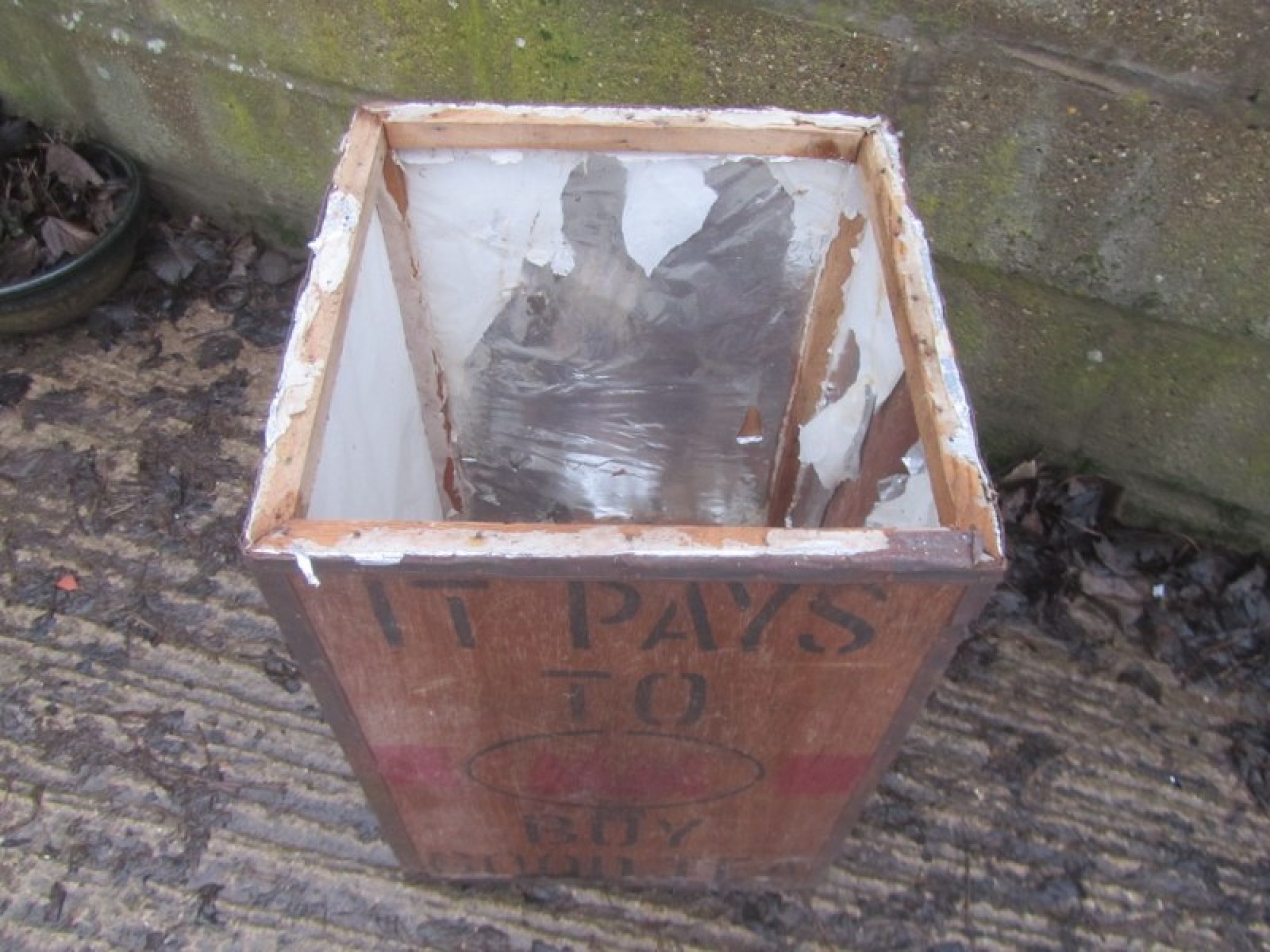 VINTAGE PLYWOOD TEA CHEST. IN WORN CONDITION, THEY HAVE SAT IN A LOFT FOR YEARS. IDEAL FOR STORAGE OR DISPLAY. PRINTED LOGOS ON THE SIDES.