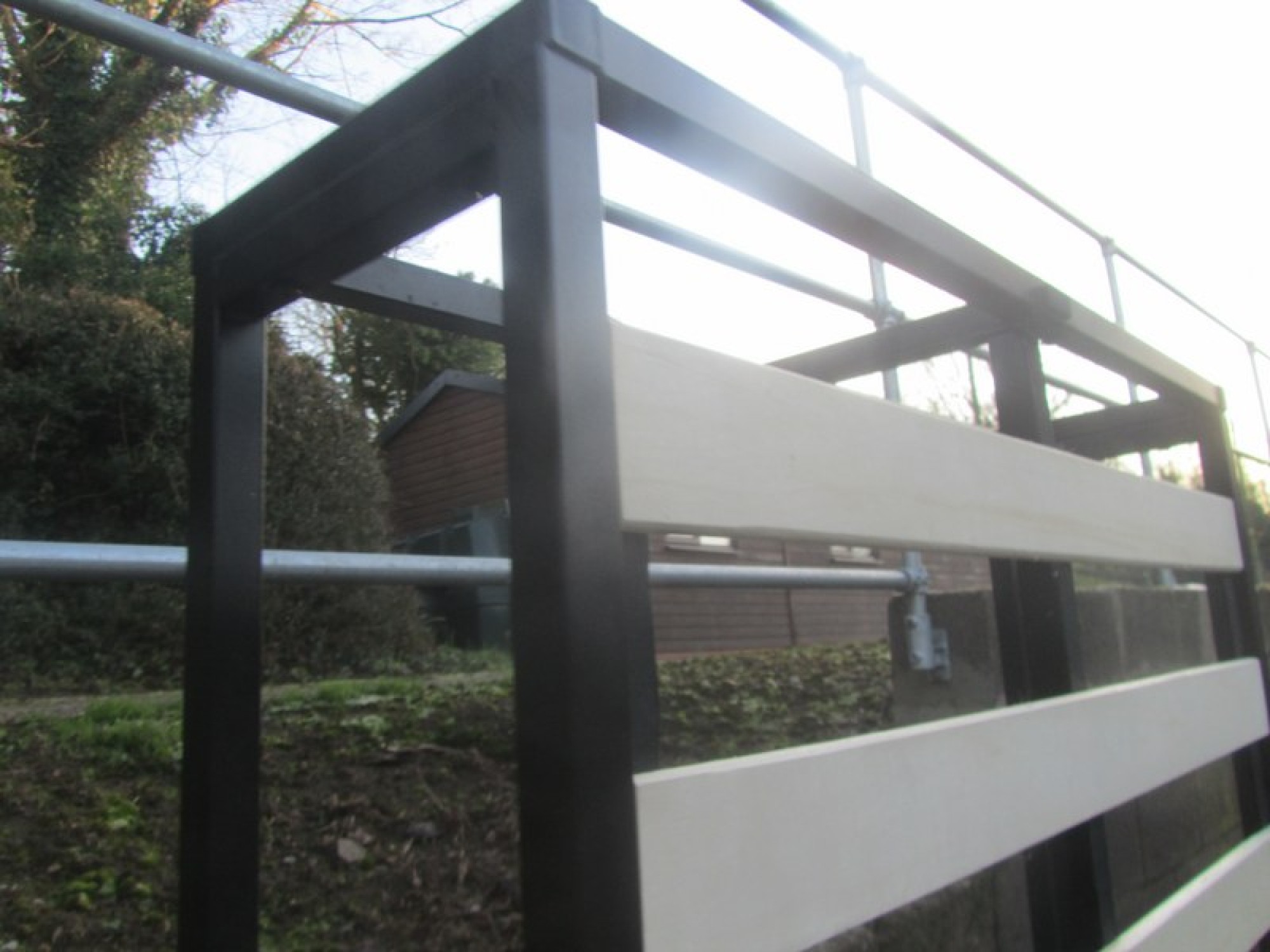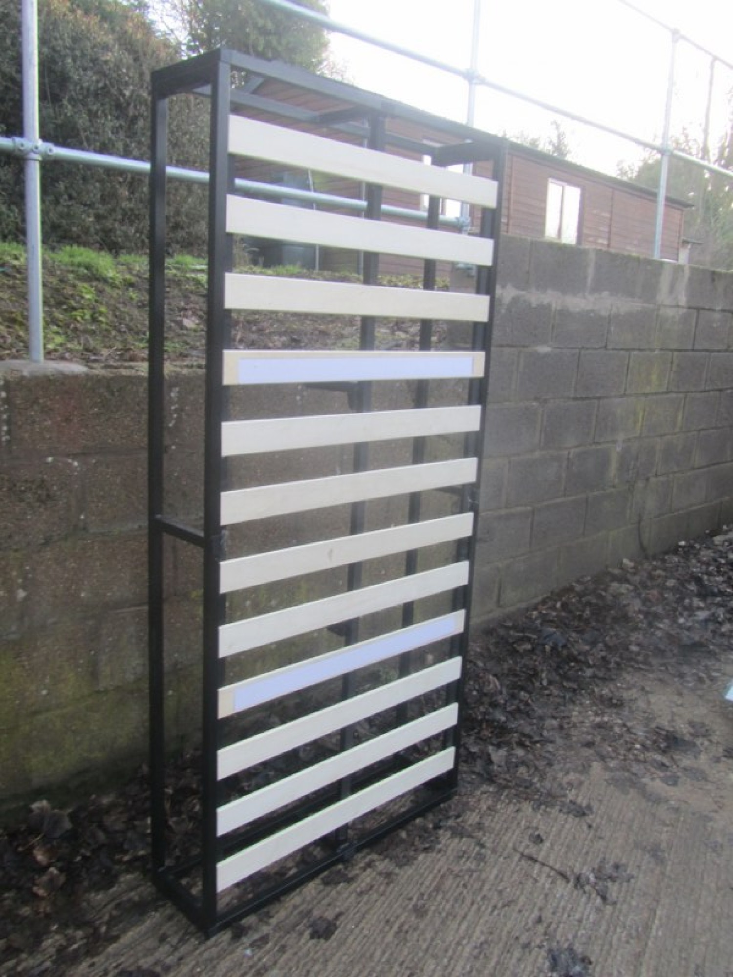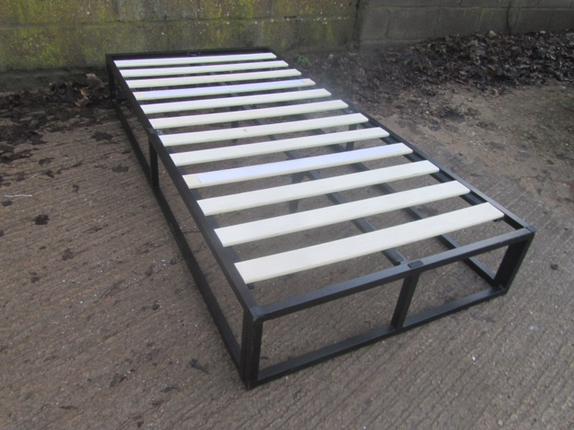 A BLACK COLOURED METAL BED FRAME, IT IS A SIMPLE METAL FRAME. IT WILL FIT A STANDARD 3' MATTRESS.