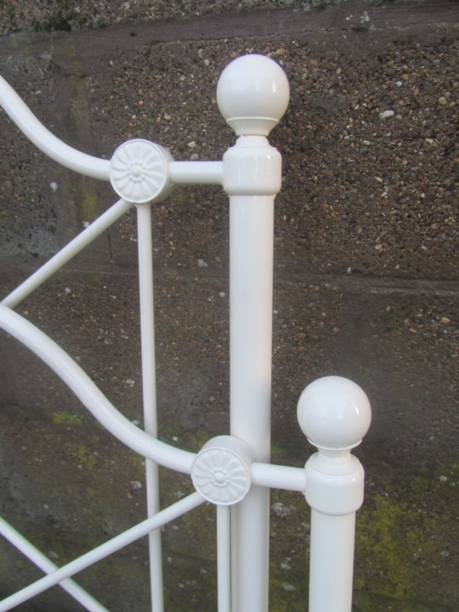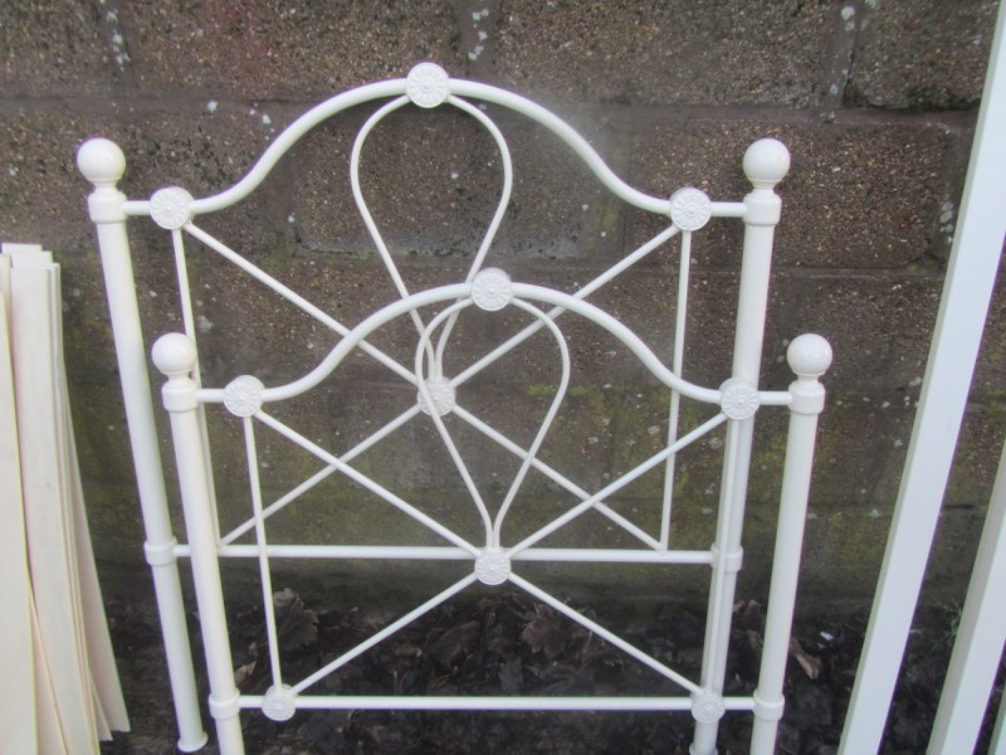 A CREAM COLOURED METAL BED FRAME, IT IS FLATPACKED READY FOR COLLECTION, EASY TO ASSEMBLE. IT WILL FIT A STANDARD 3' MATTRESS.