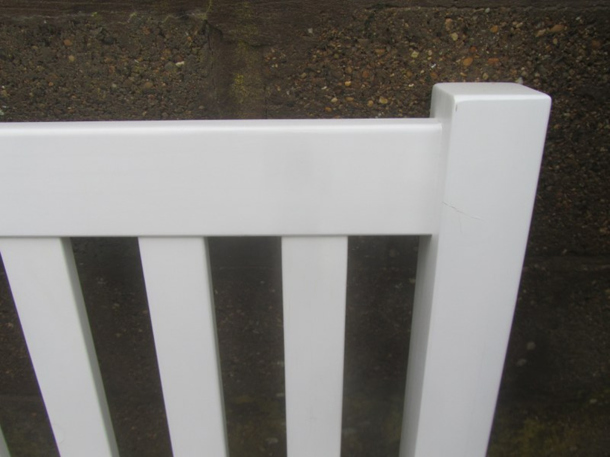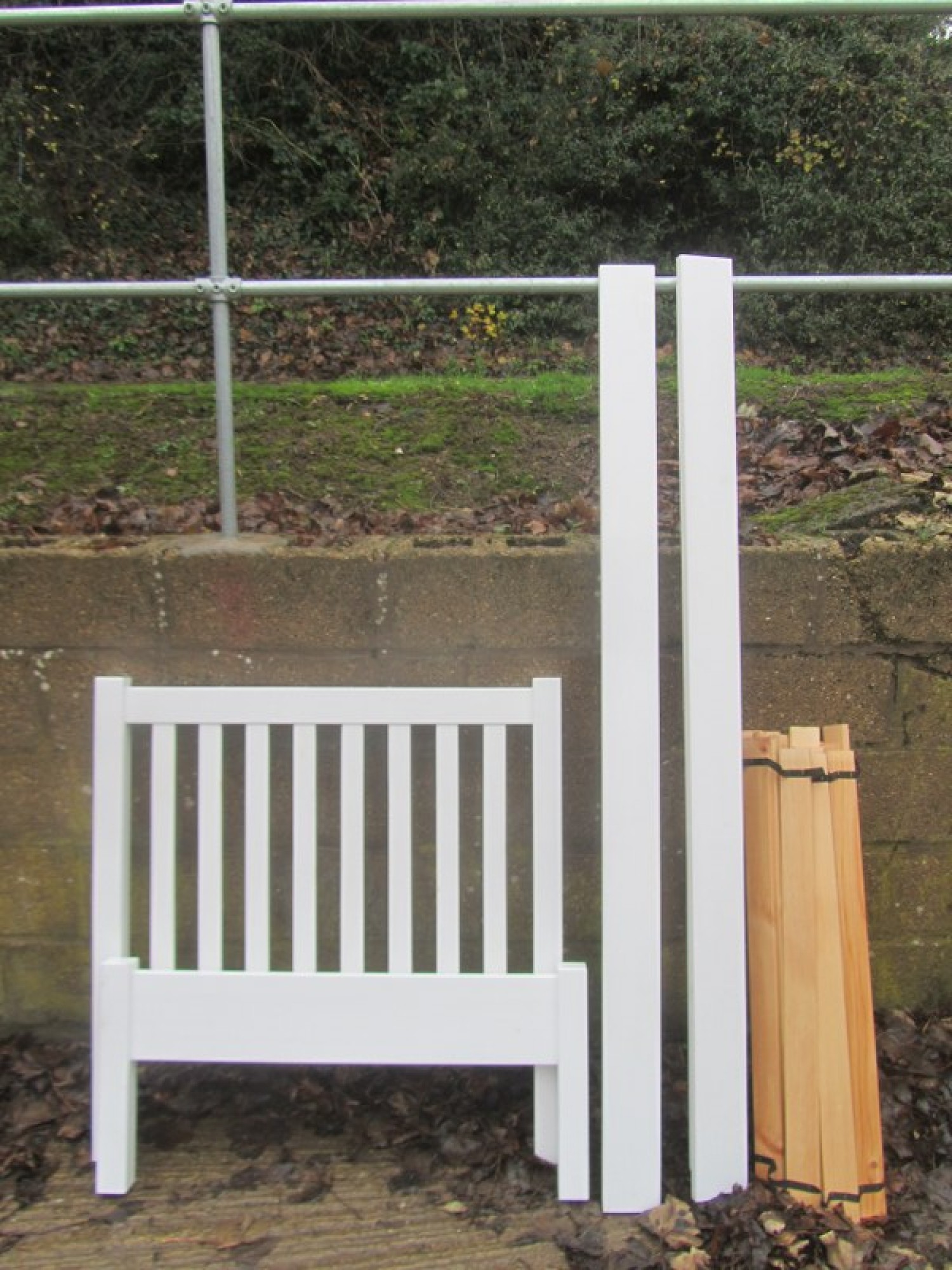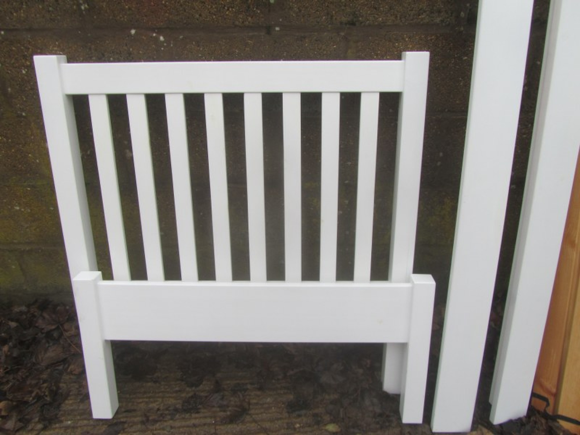 A WHITE COLOURED BED FRAME WITH SLATS, IT IS FLATPACKED READY FOR COLLECTION.