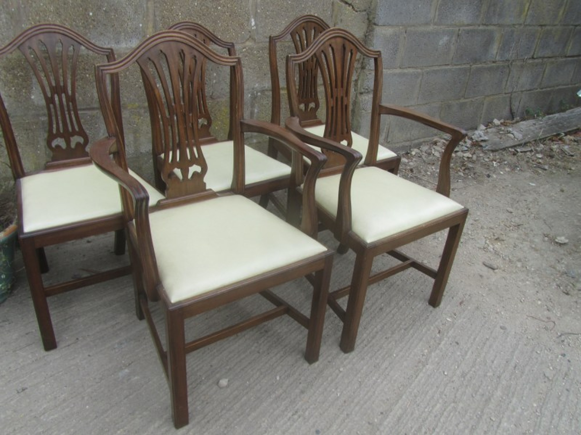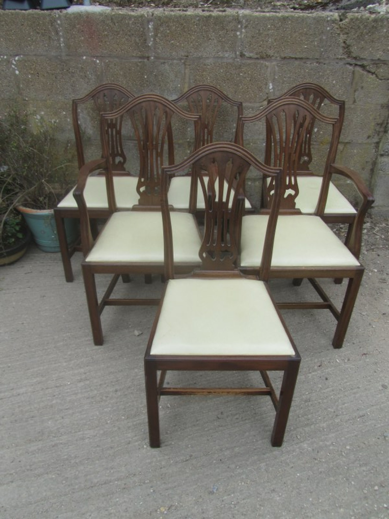 THIS IS A SET OF 6 DINING CHAIRS. THEY DATE FROM AROUND THE 1900s. DECORATIVE BACK RESTS. THE UPHOLSTERY IS MATERIAL, THEY ARE WELL PADDED AND STURDY.