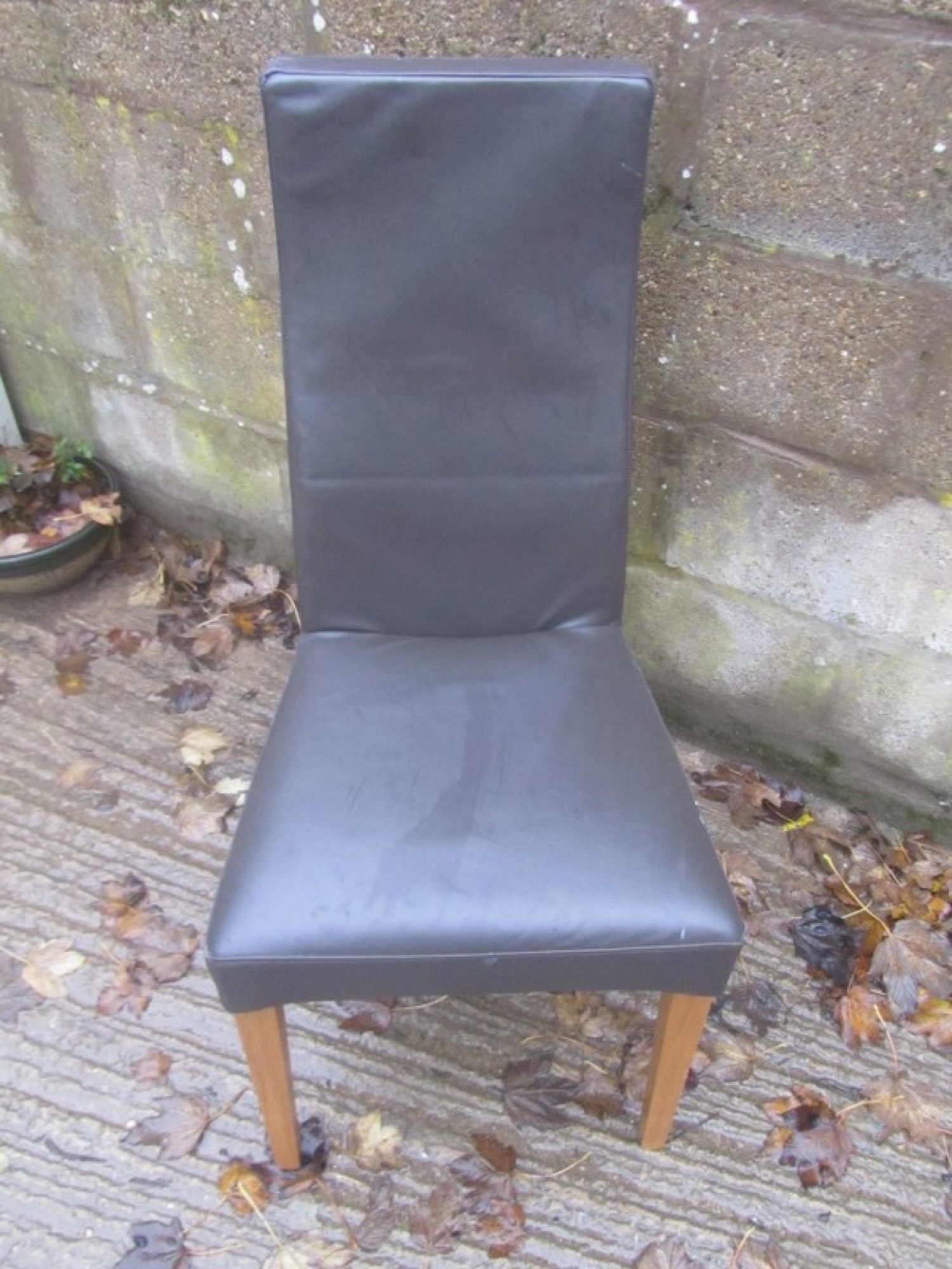 A MODERN DINING CHAIR IN BROWN LEATHER EFFECT UPHOLSTERY. OAK LEGS. IN AVERAGE CONDITION, SOME SCUFFS. SEAT HEIGHT IS 47cm.