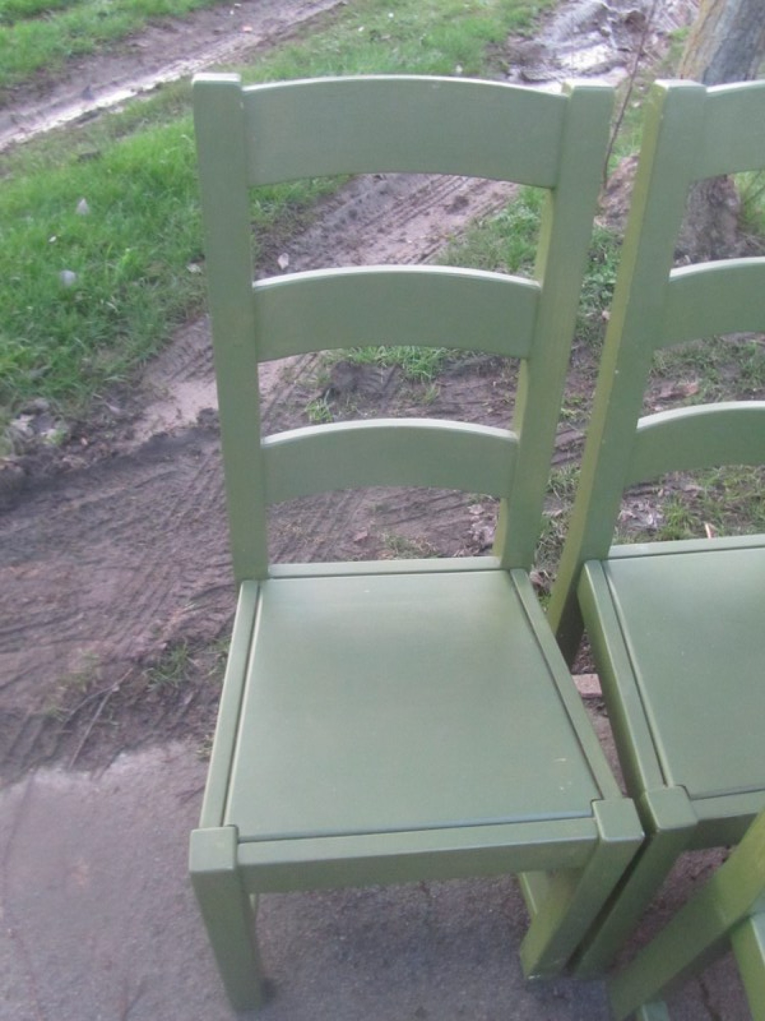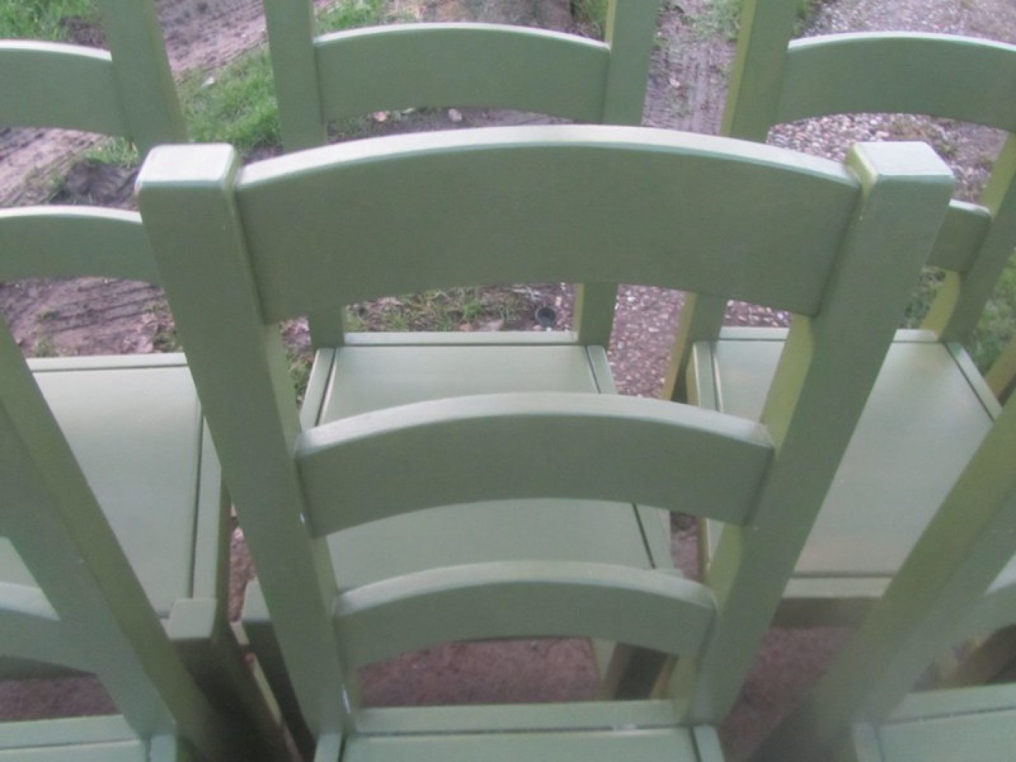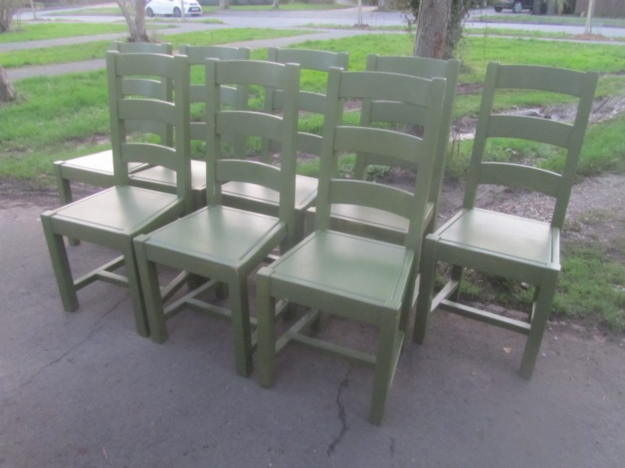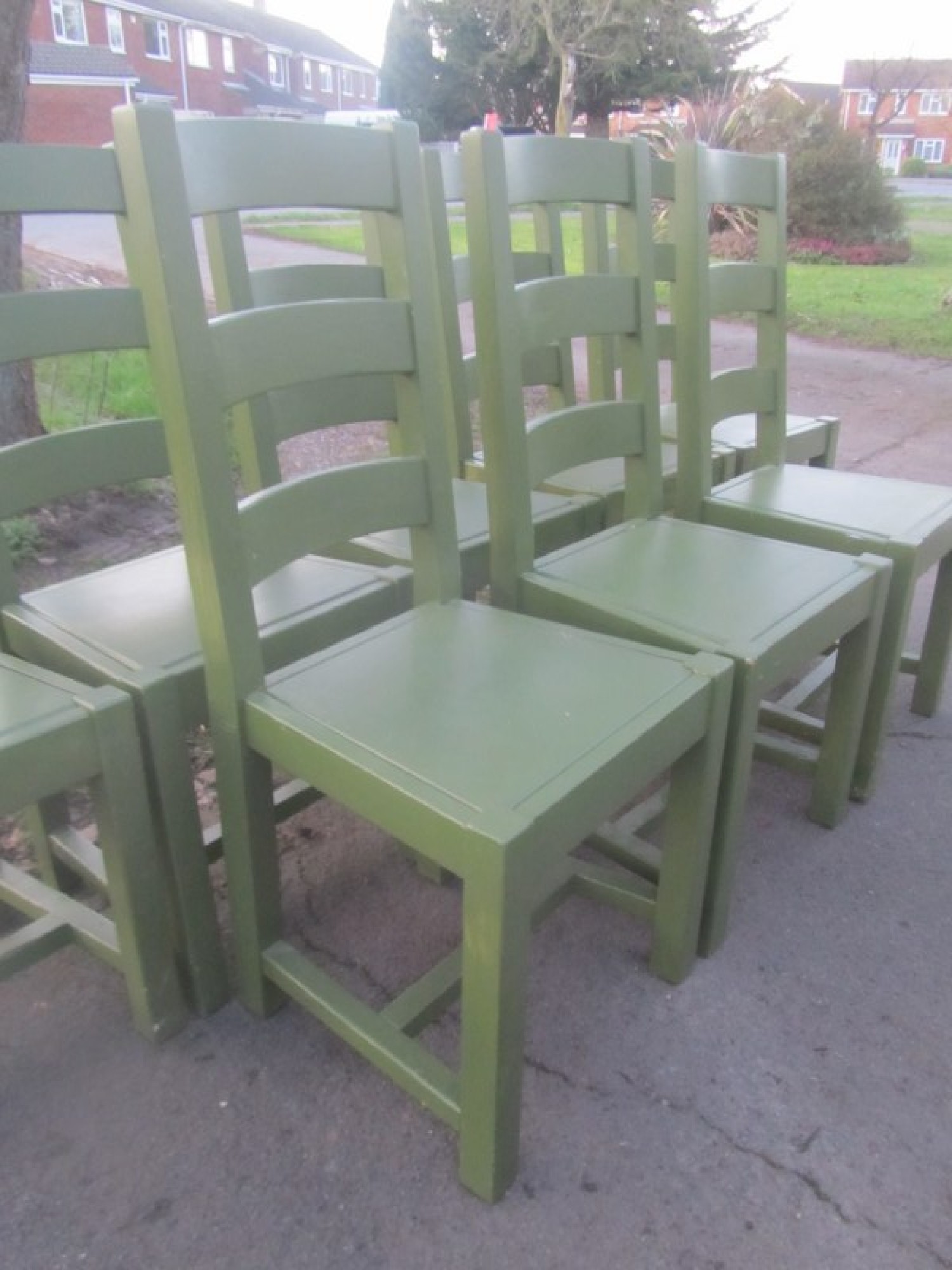 THIS IS A SET OF 8 CHAIRS FOR THE KITCHEN OR DINING ROOM. THEY ARE IN A FARMHOUSE STYLE. A STURDY SET, MADE IN SOLID BEECH. PAINTED IN A FARROW & BALL PAINT, A FEW SCUFFS TO THE PAINT.