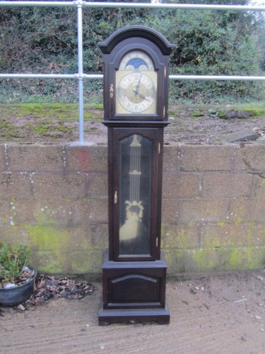 THIS IS A STYLISH ANTIQUE STYLE GRANDFATHER CLOCK, IN WOOD VENEER, THE GLASS IN THE DOOR IS IN GOOD CONDITION.
