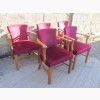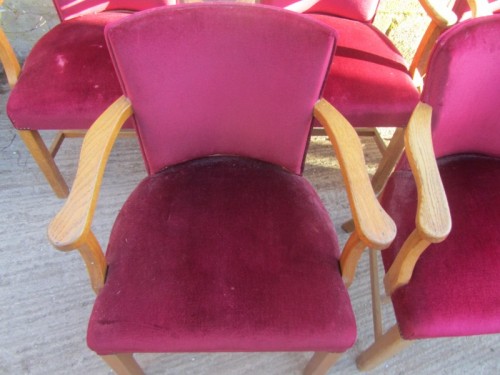THIS IS A SOLID OAK ARMCHAIR IN A TRADITIONAL DESIGN. A SIMPLE STYLISH CHAIR WITH CURVED ARMS. THE THE SEAT IS COVERED WITH RED MATERIAL. SOME MARKS. STRONG AND STURDY.