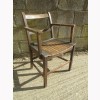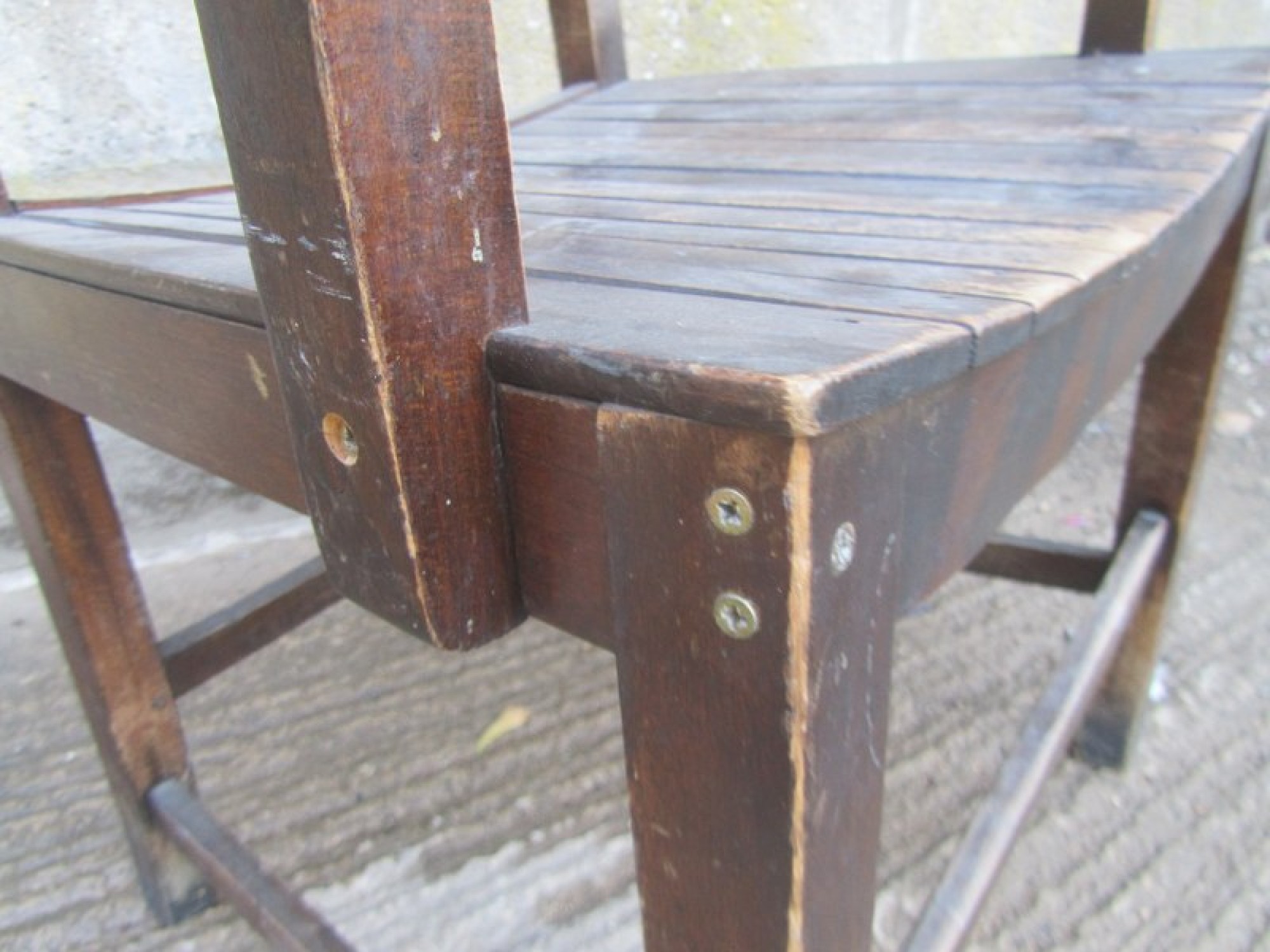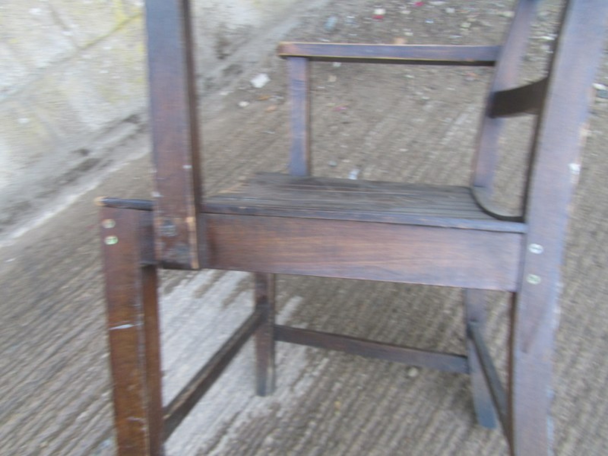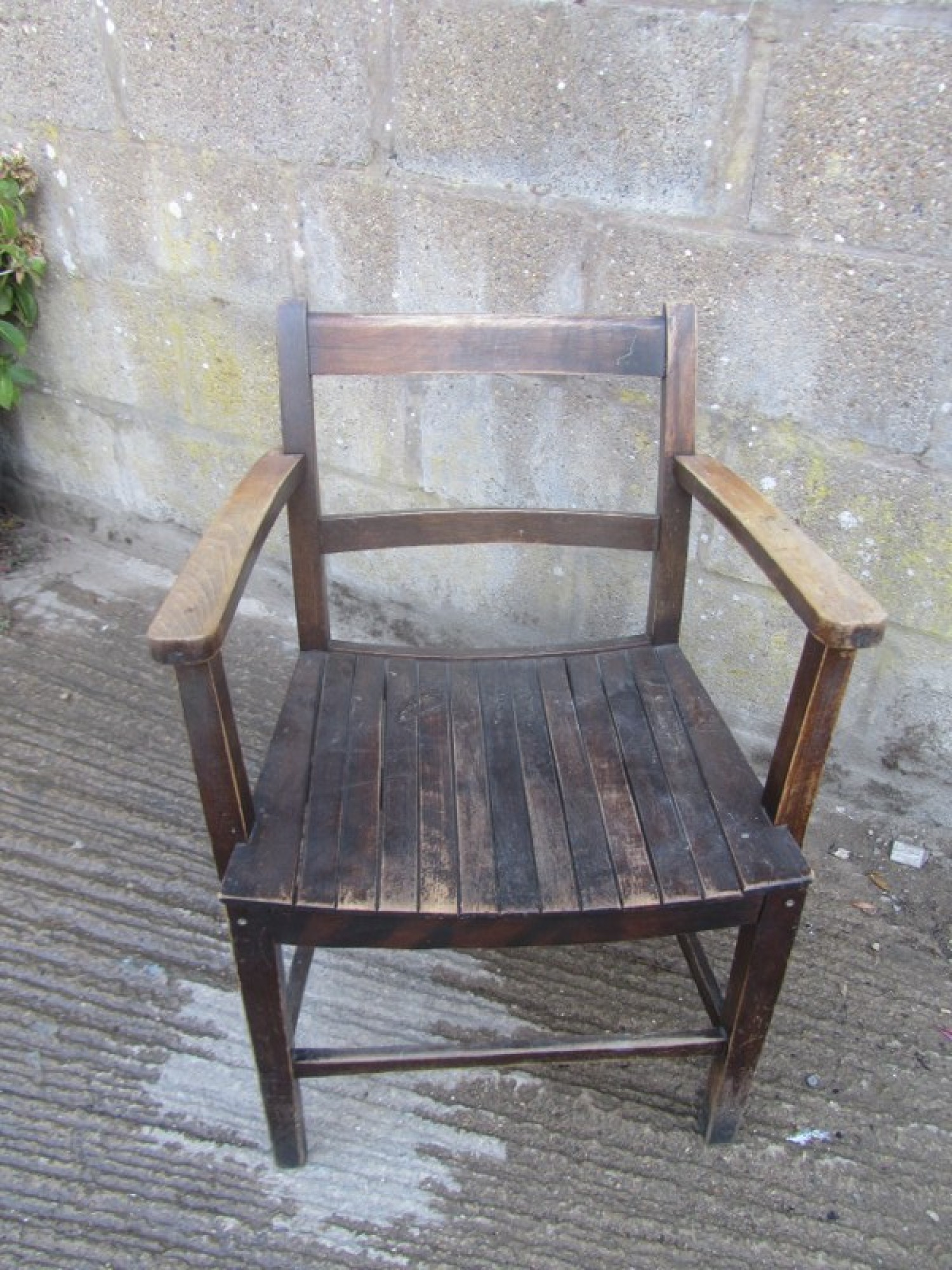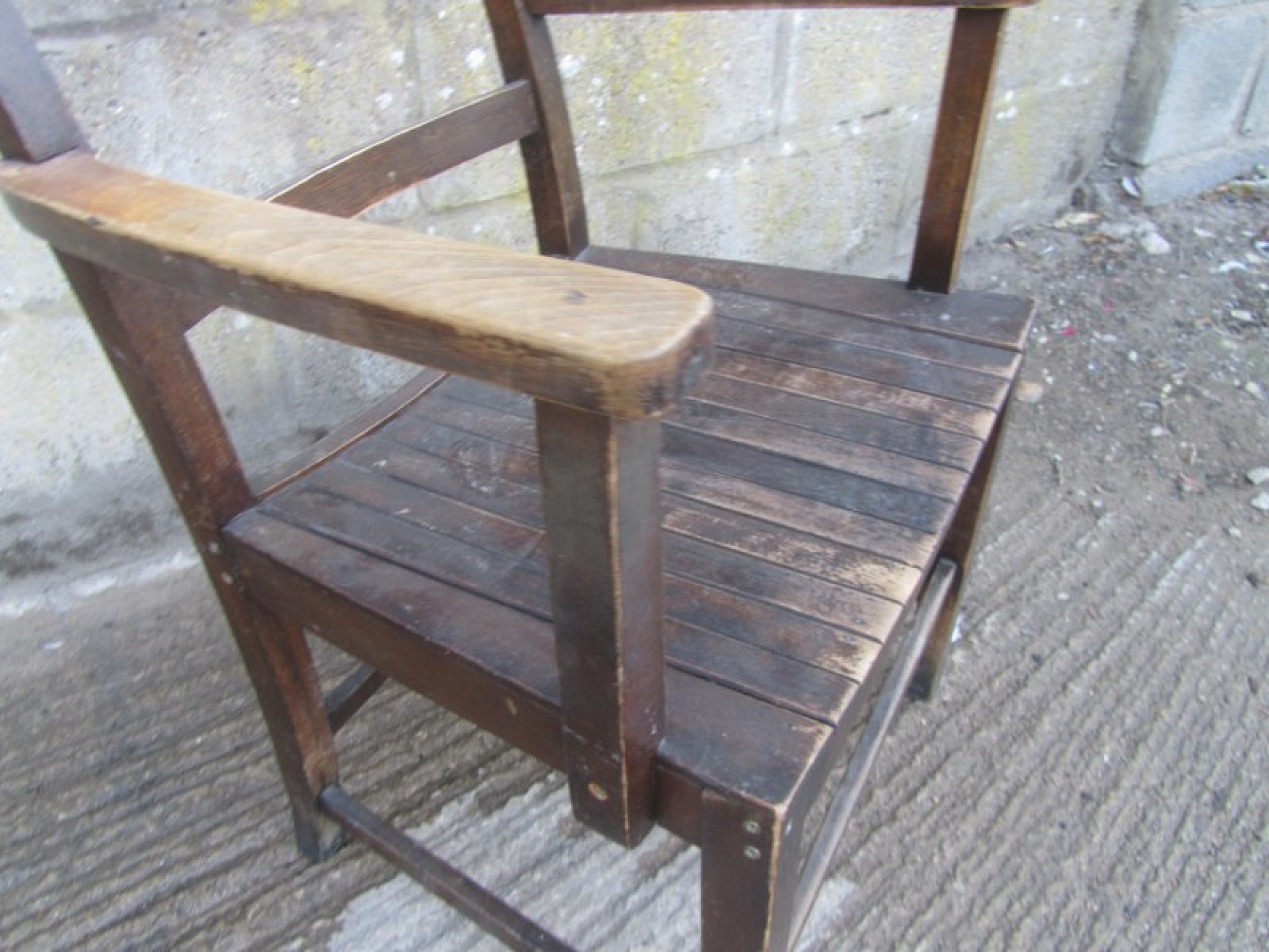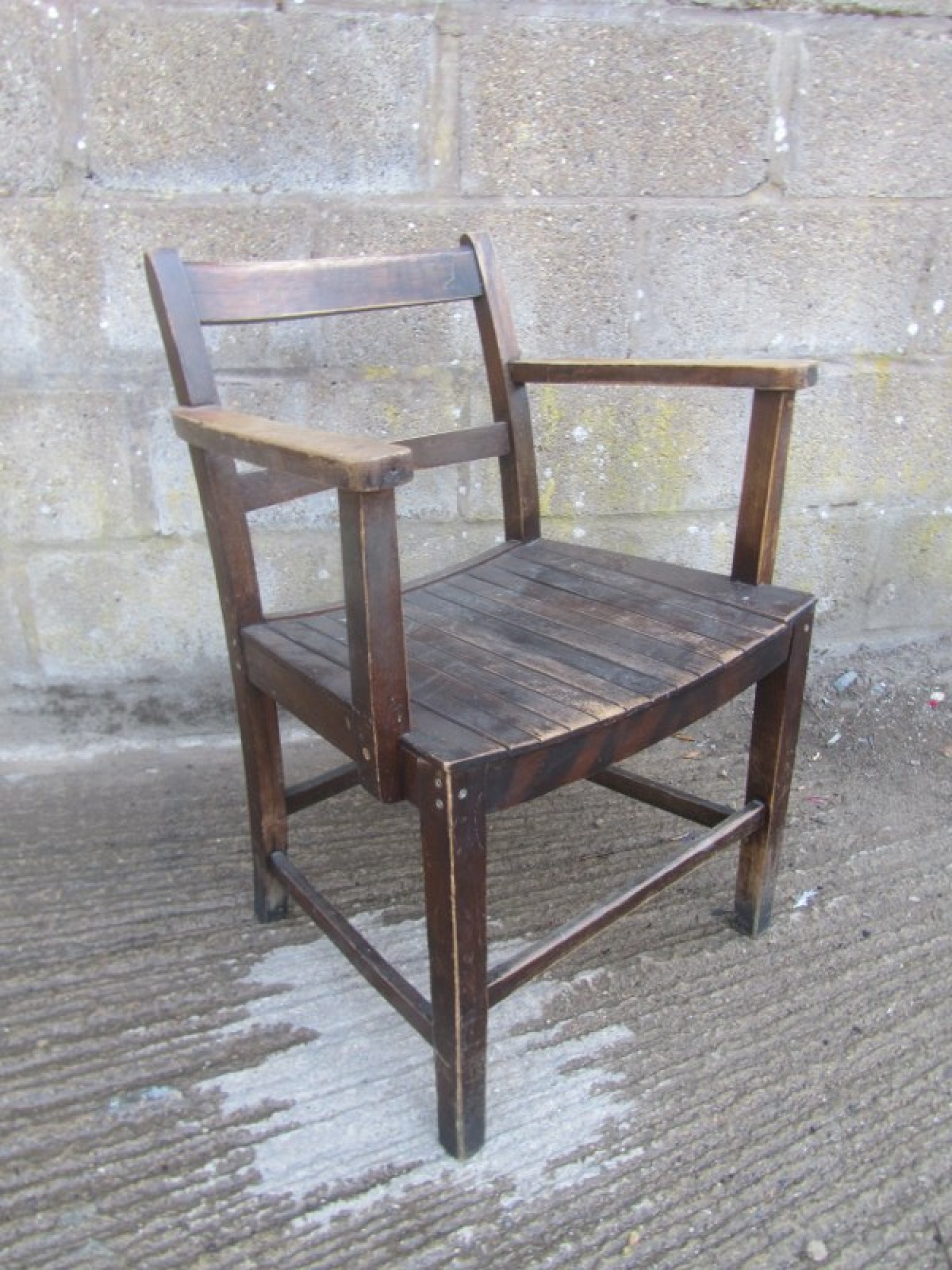 THIS IS A SOLID WOOD ARMCHAIR IN A TRADITIONAL DESIGN. A SIMPLE STYLISH CHAIR. THE THE SEAT IS SLATTED WOOD. SOME MARKS. THIS DATES FROM AROUND THE 1950s. THE CHAIR IS IN AVERAGE CONDITION, HEIGHT TO SEAT - 44cm. IT HAS SUFFERED WITH WOOD WORM IN THE PAST, IT IS PROBABLY LONG DEAD! BUT I WOULD RECOMMEND TREATING IT TO BE SURE. THE FRAME HAS BEEN REPAIRED, MOST CORNERS HAVE MODERN SCREWS.