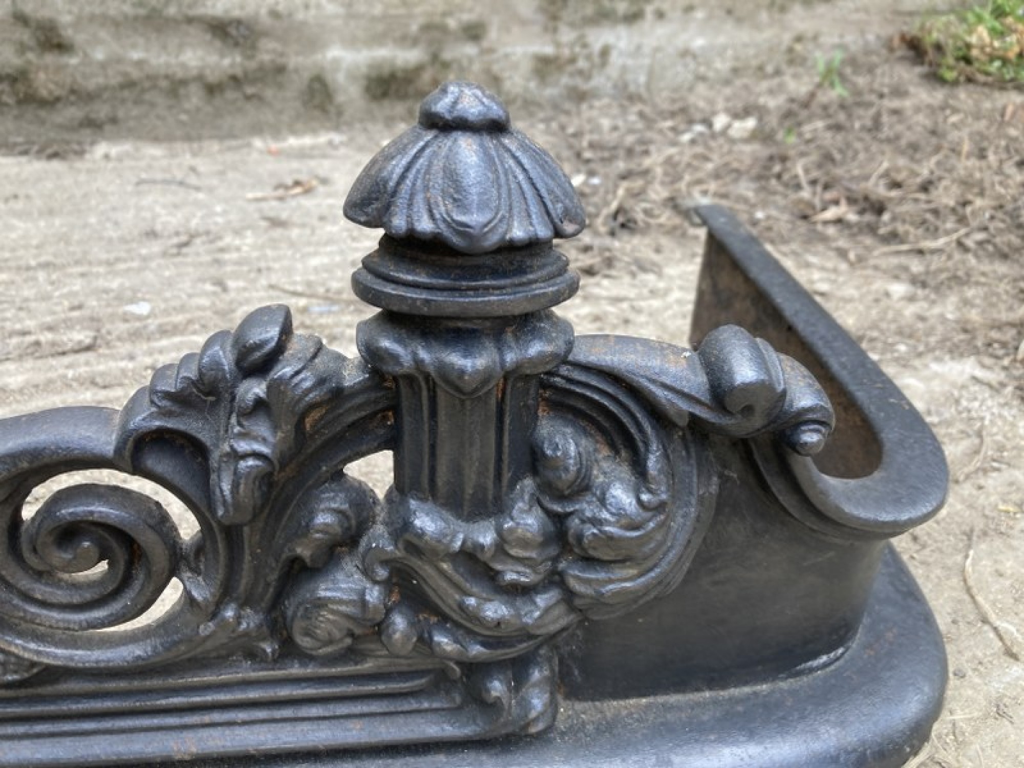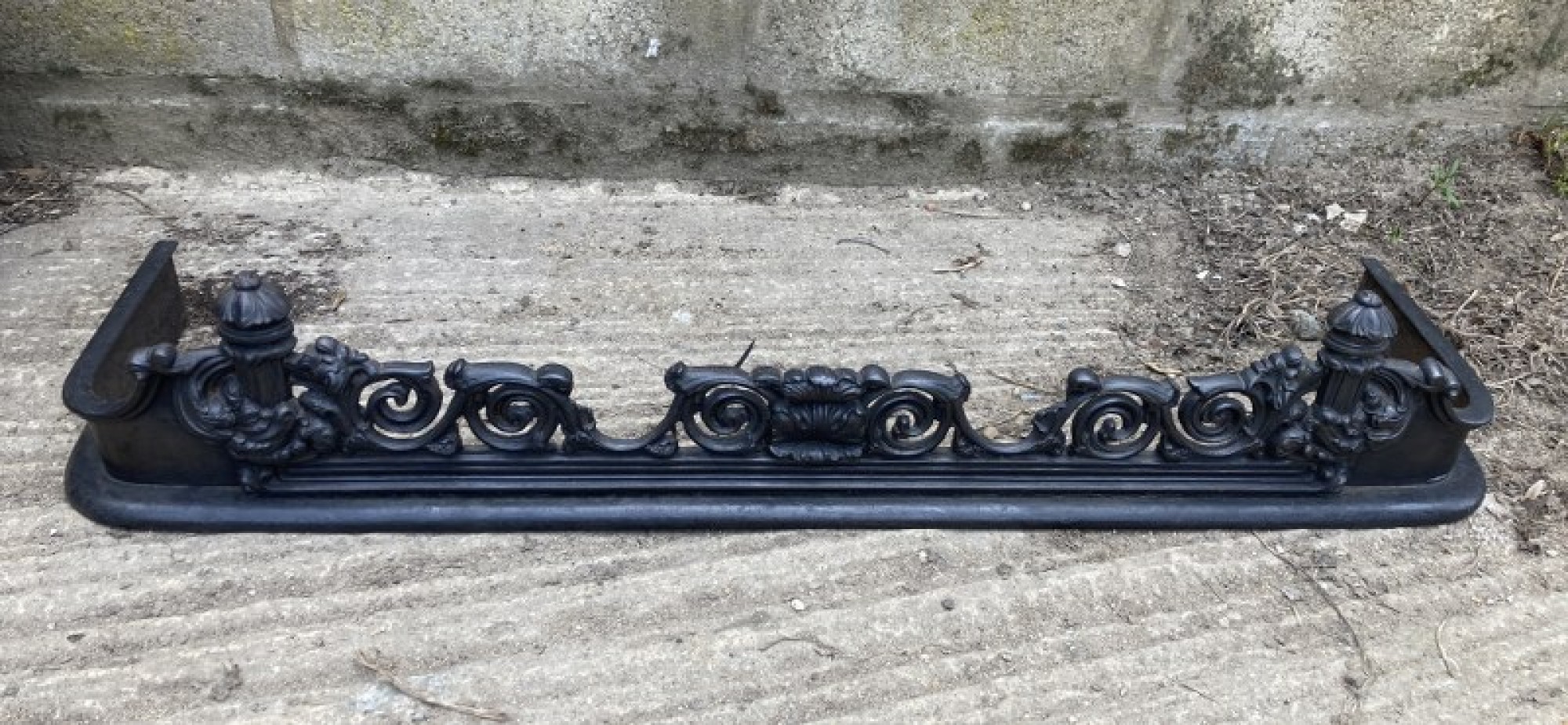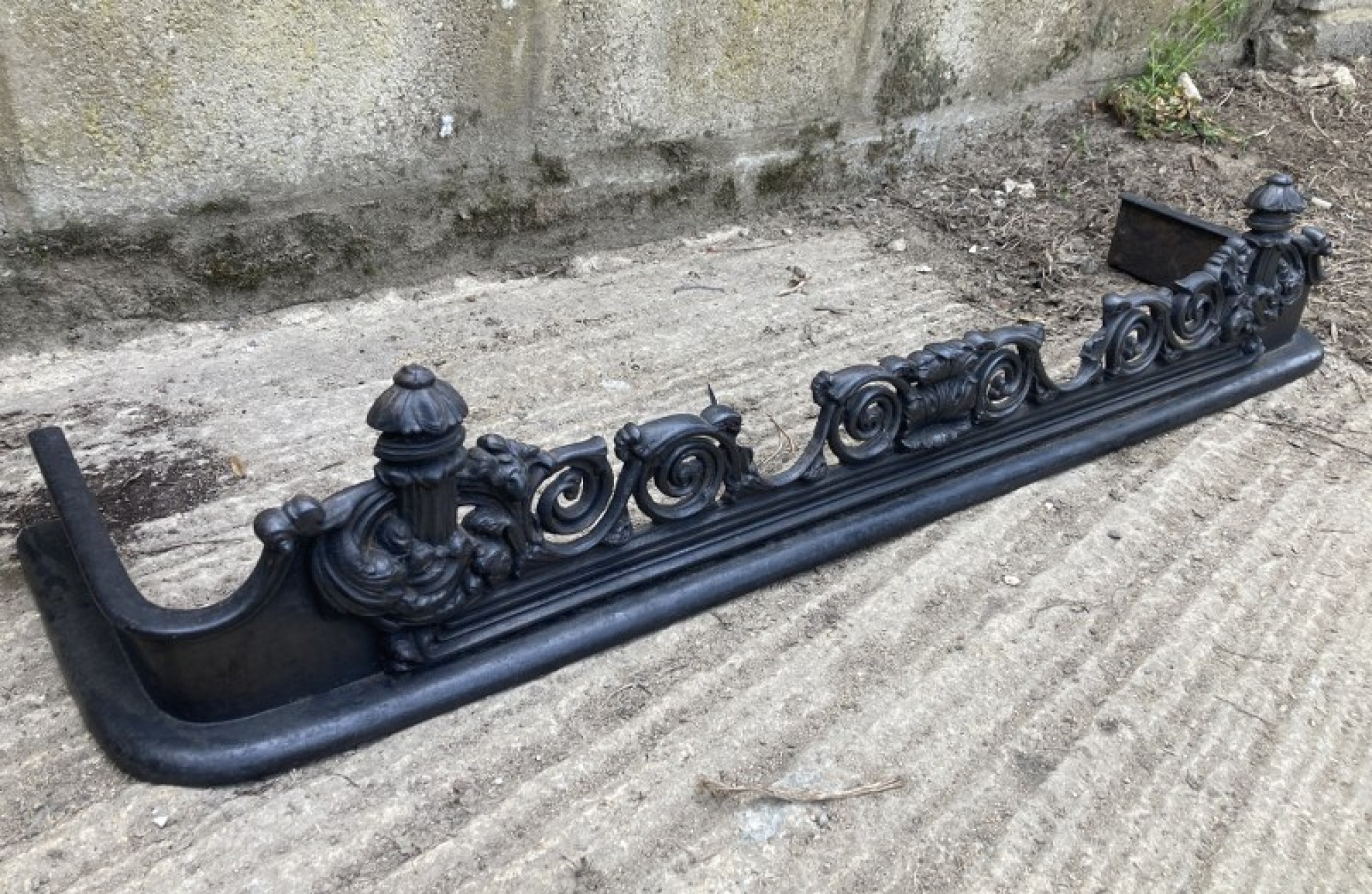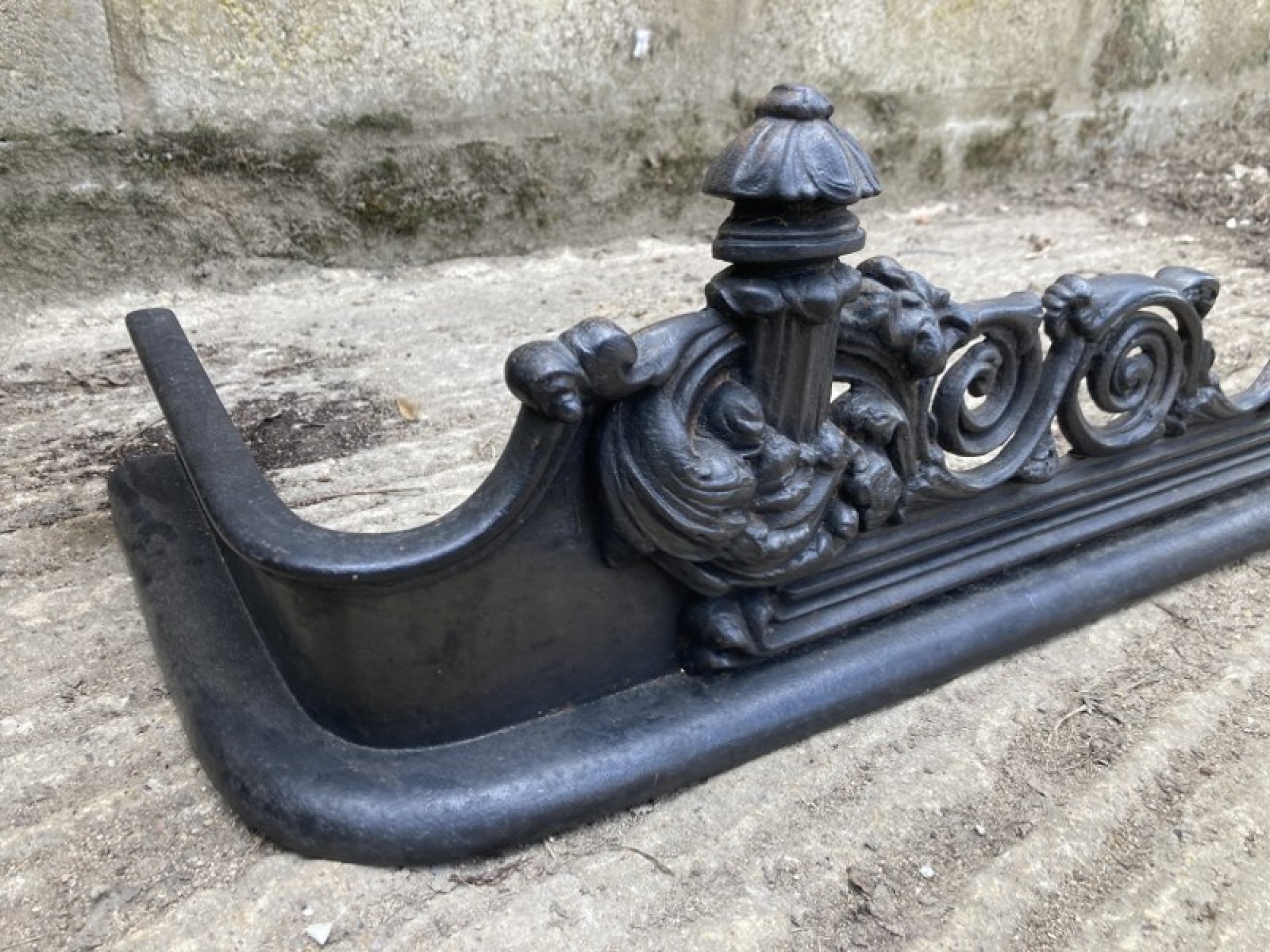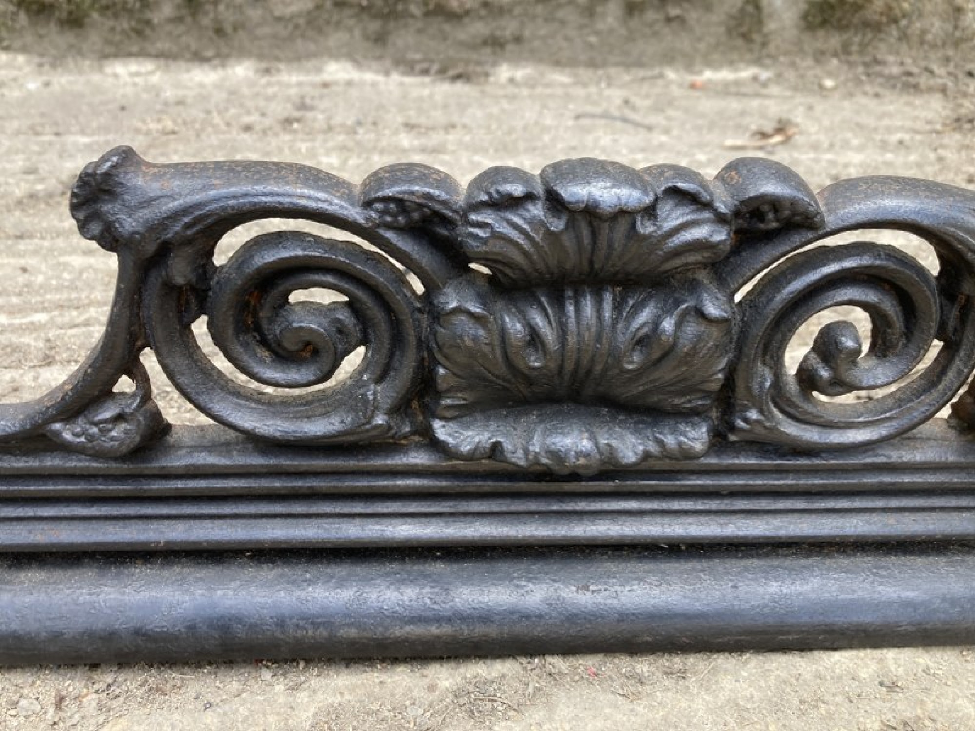 A HEAVY CAST IRON FIREPLACE FENDER, WITH DECORATIVE DETAIL. SET SIZE, DOES NOT EXTEND.