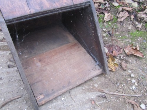 AN OAK BOX WITH A LIFT UP FRONT, THERE IS NO METAL LINER INSIDE AND THE SHOVEL IS MISSING. THE CABINET IS SOLID OAK.