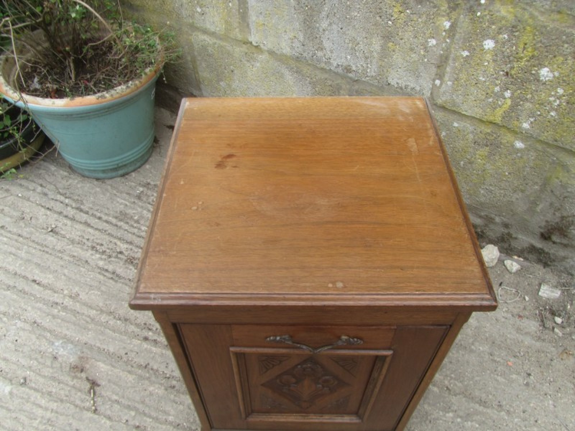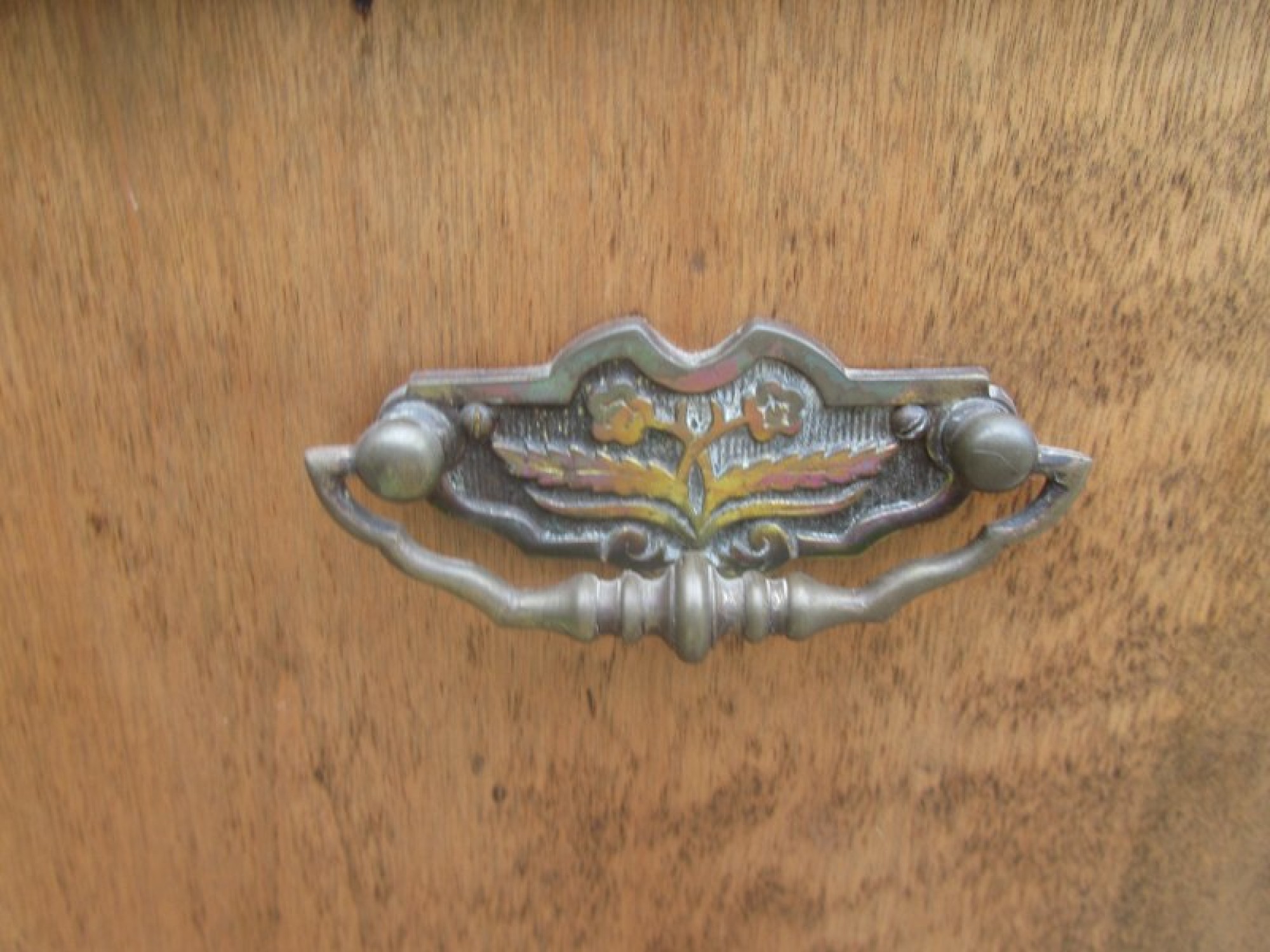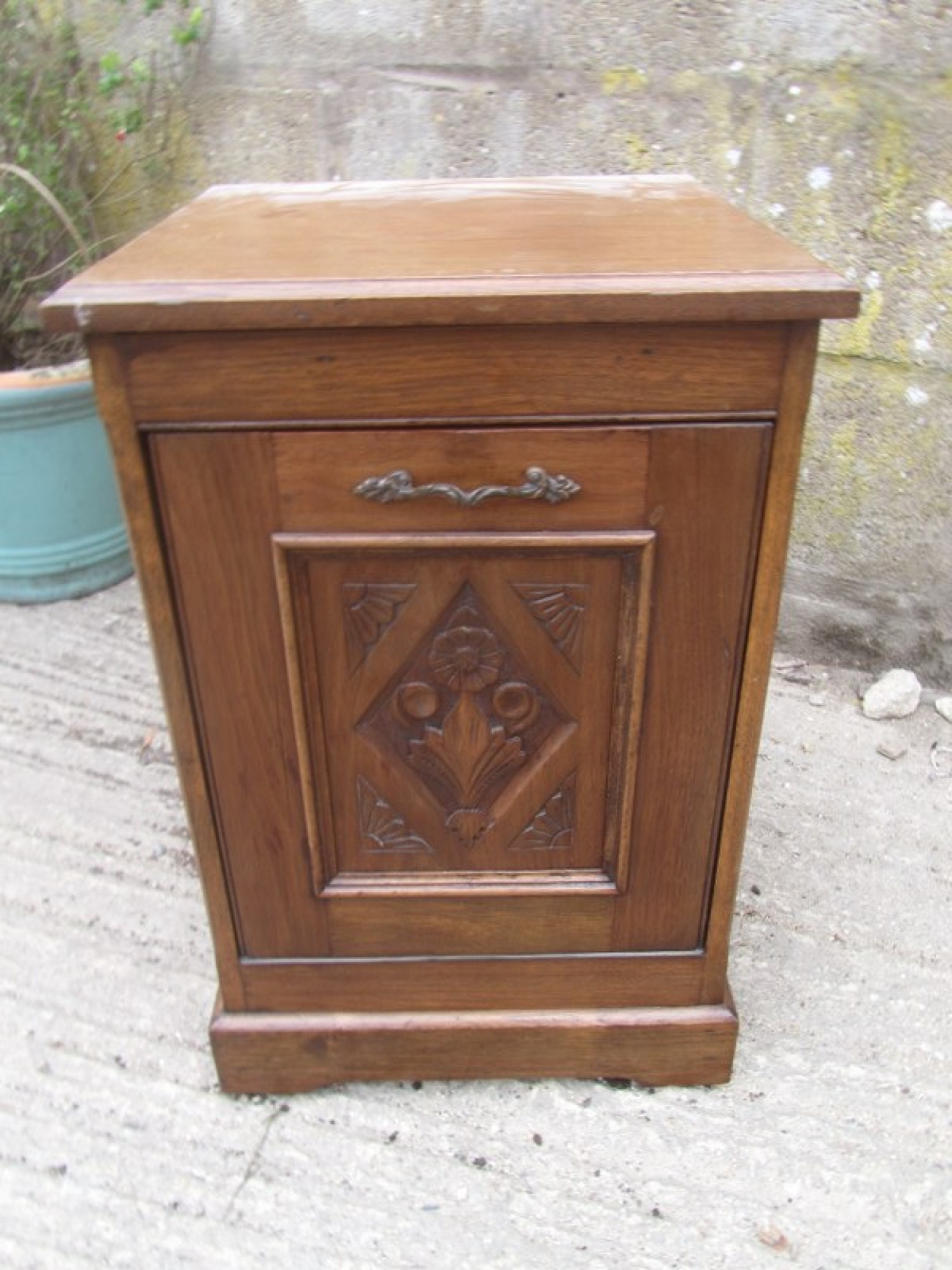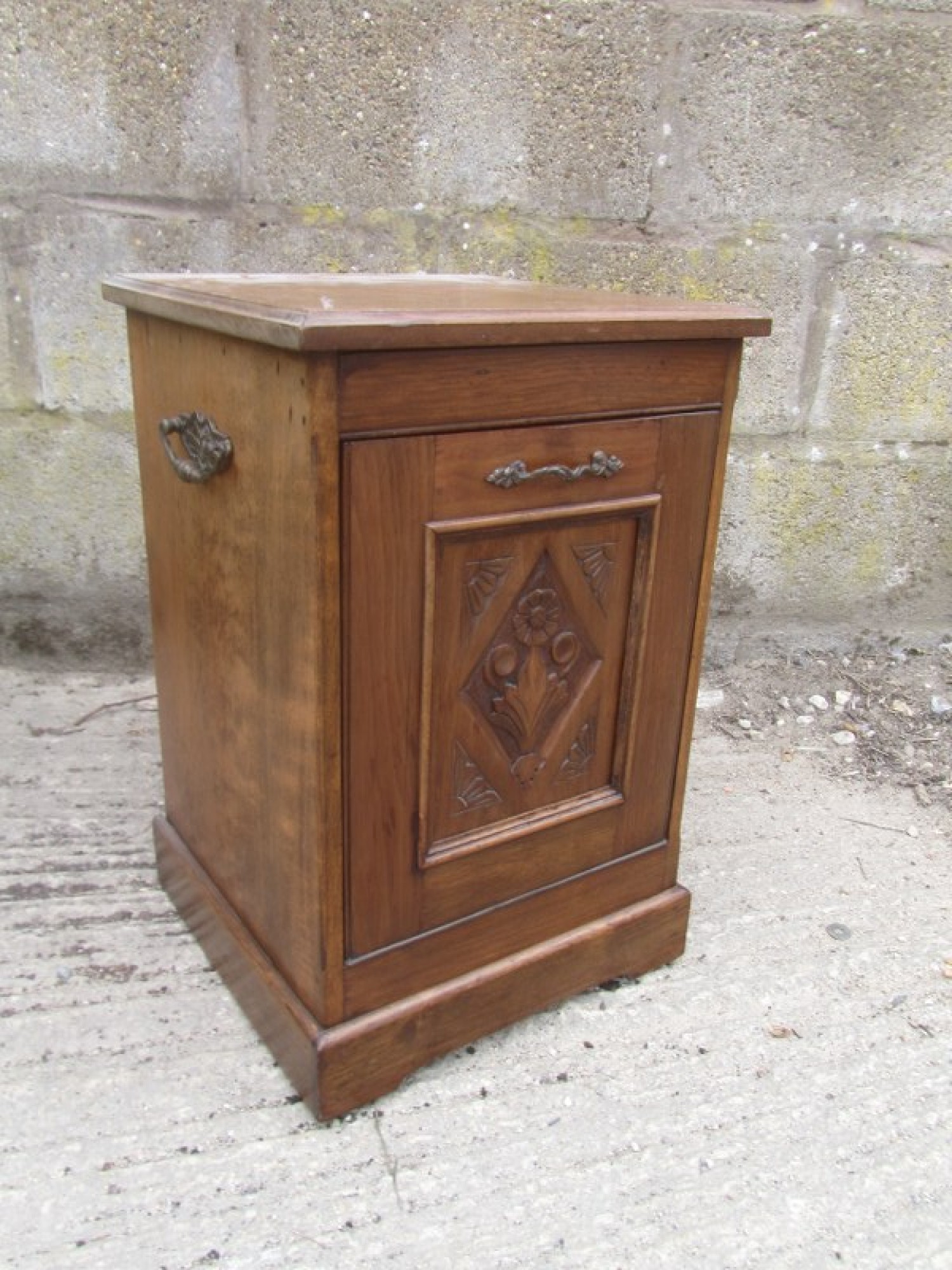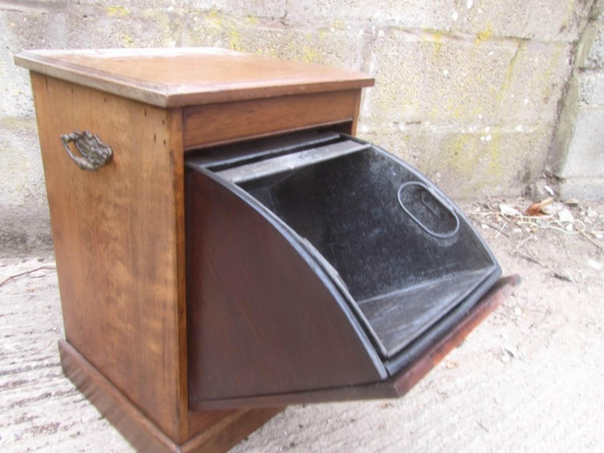 A WALNUT BOX WITH A DROP DOWN FRONT. WITH METAL LINER.