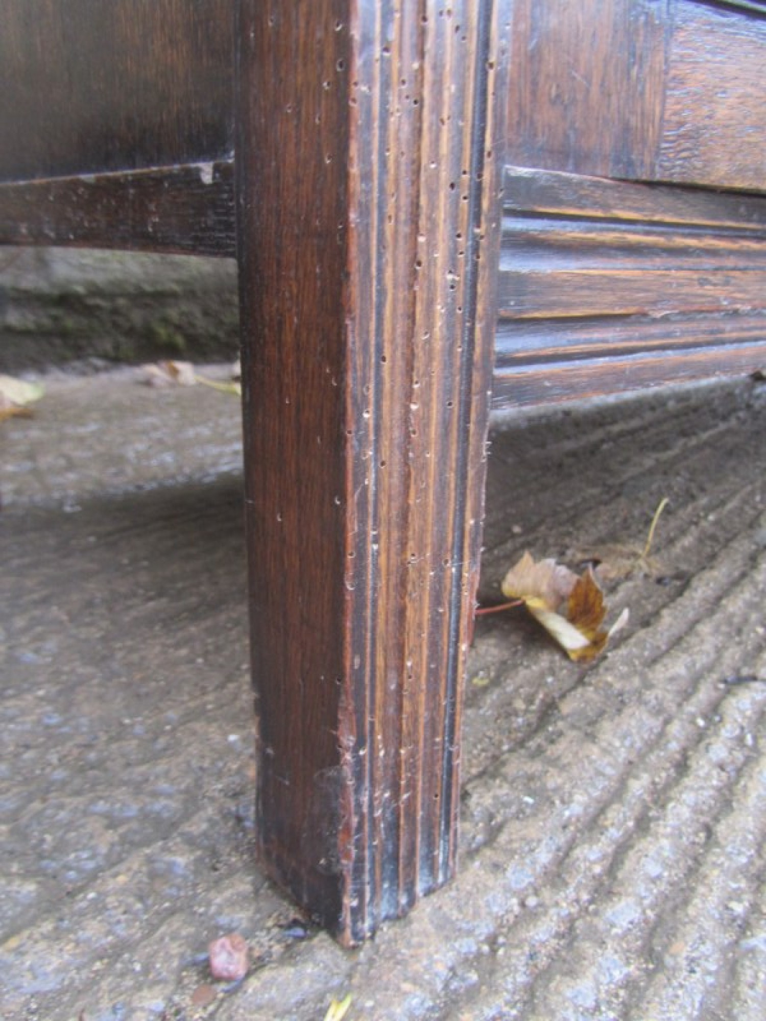 IT HAS SUFFERED WITH WOOD WORM IN THE FRONT LEFT LEG AND CORNER, IT HAS BEEN TREATED, IT IS PROBABLY LONG DEAD! BUT I WOULD RECOMMEND TREATING AGAIN IT TO BE SURE.