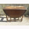 THIS IS A DROP LEAF TABLE WITH A SOLID OAK TOP AND FRAME. IT HAS A STURDY FRAME. THE TABLE TOP IS WORN AND FADED.