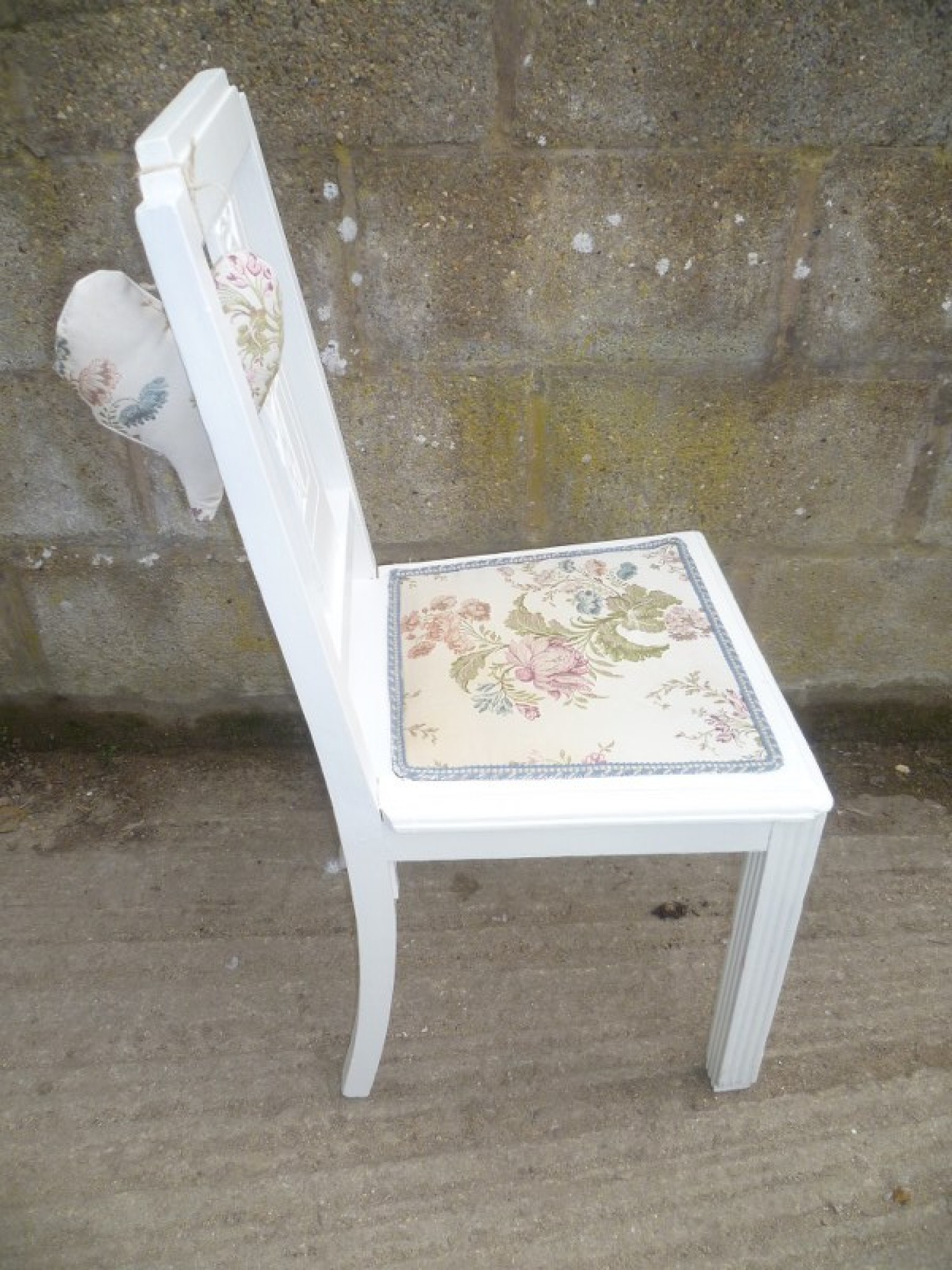 A SMALL BEDROOM CHAIR IN BEECH WOOD, PAINTED WHITE. THE SEAT IS PADDED. IN AVERAGE CONDITION. SEAT HEIGHT IS 45cm.