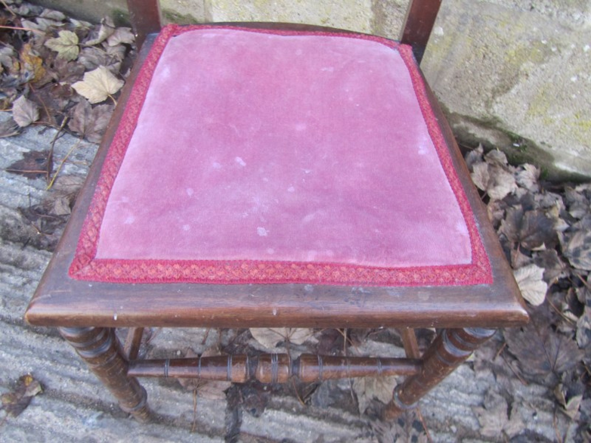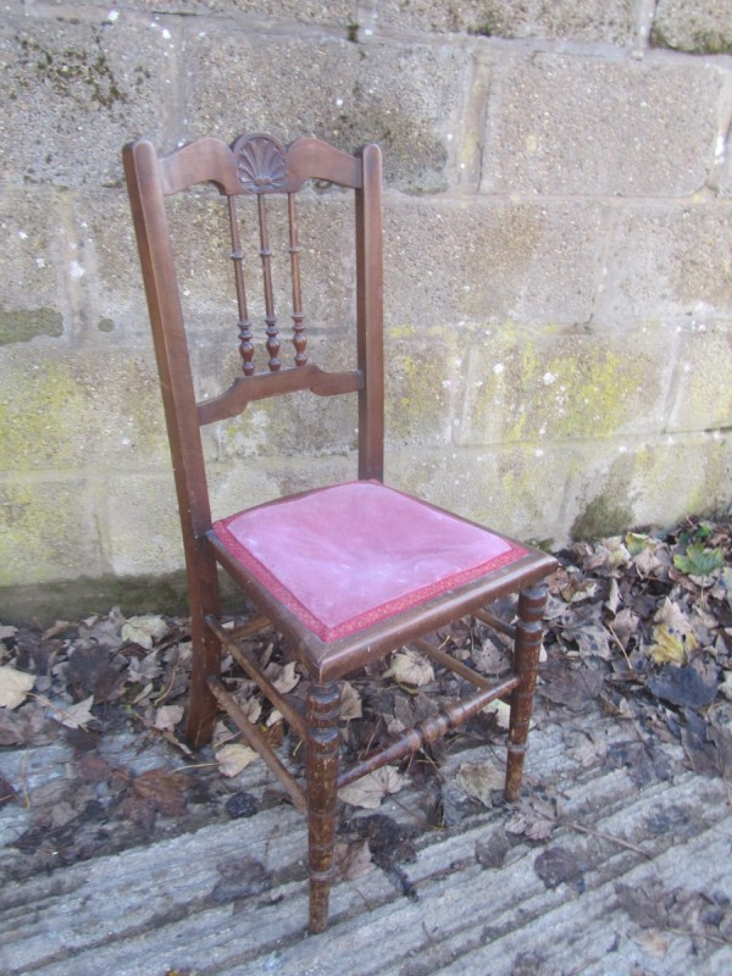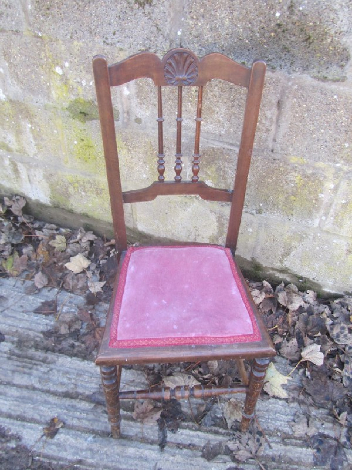 A BEDROOM CHAIR FROM AROUND THE 1900s. THERE IS a DECORATIVE BACK REST. HEIGHT TO SEAT IS 44cm. THE SEATS MATERIAL, EASY TO RECOVER.