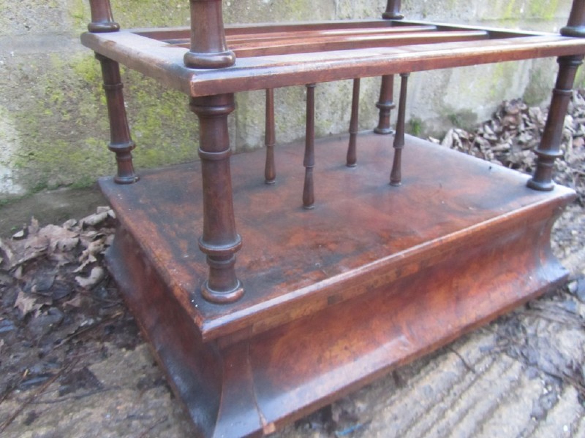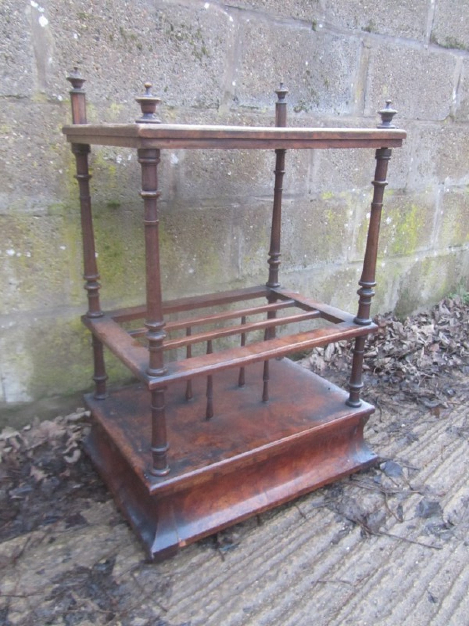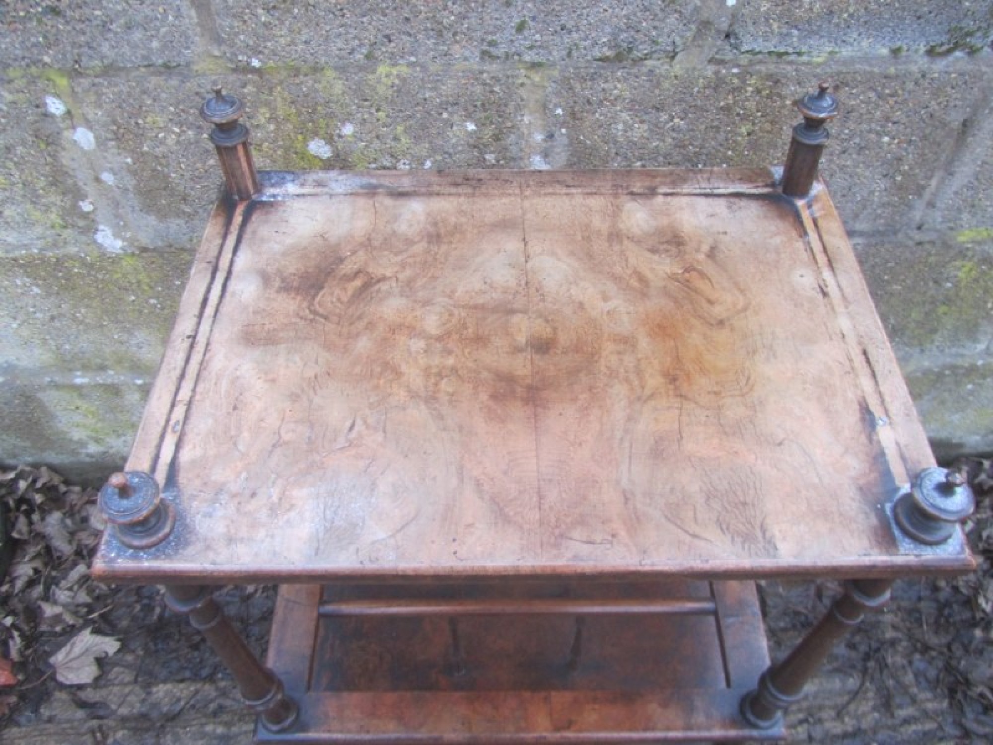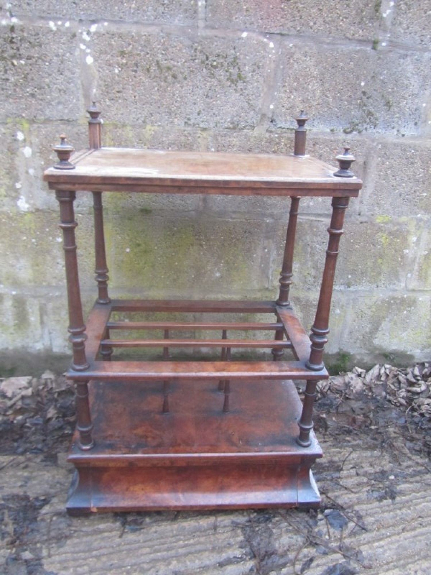 A DELICATE AND STYLISH ANTIQUE SIDE TABLE WITH A RACK BELOW FOR SHEET MUSIC OR NEWSPAPERS. IT IS WALNUT VENEERED WITH DECORATIVE TURNED DETAIL. DRAWER AT THE BOTTOM.
