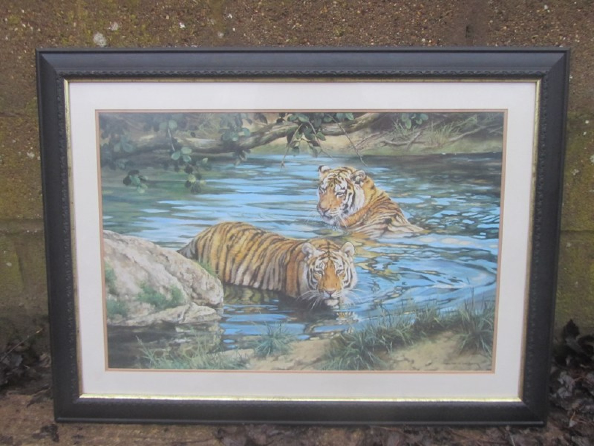 LARGE FRAMED COLOUR PRINT OF TIGERS, TITLED 'COOL FOR CATS' BY WILLEM DE BEER. IN A FRAME.