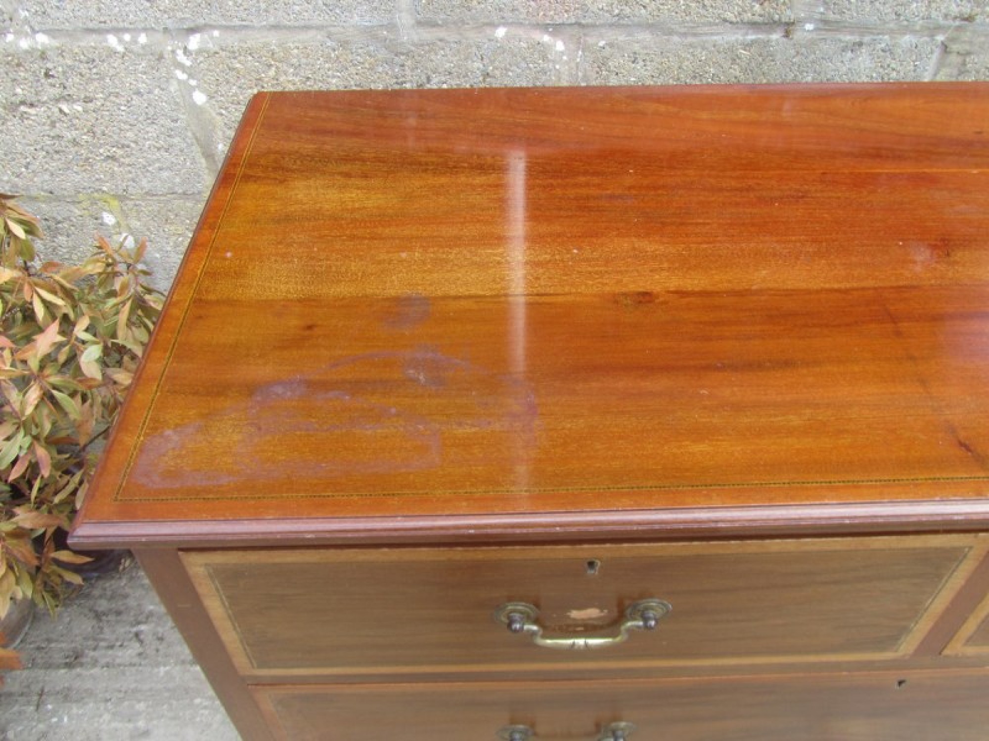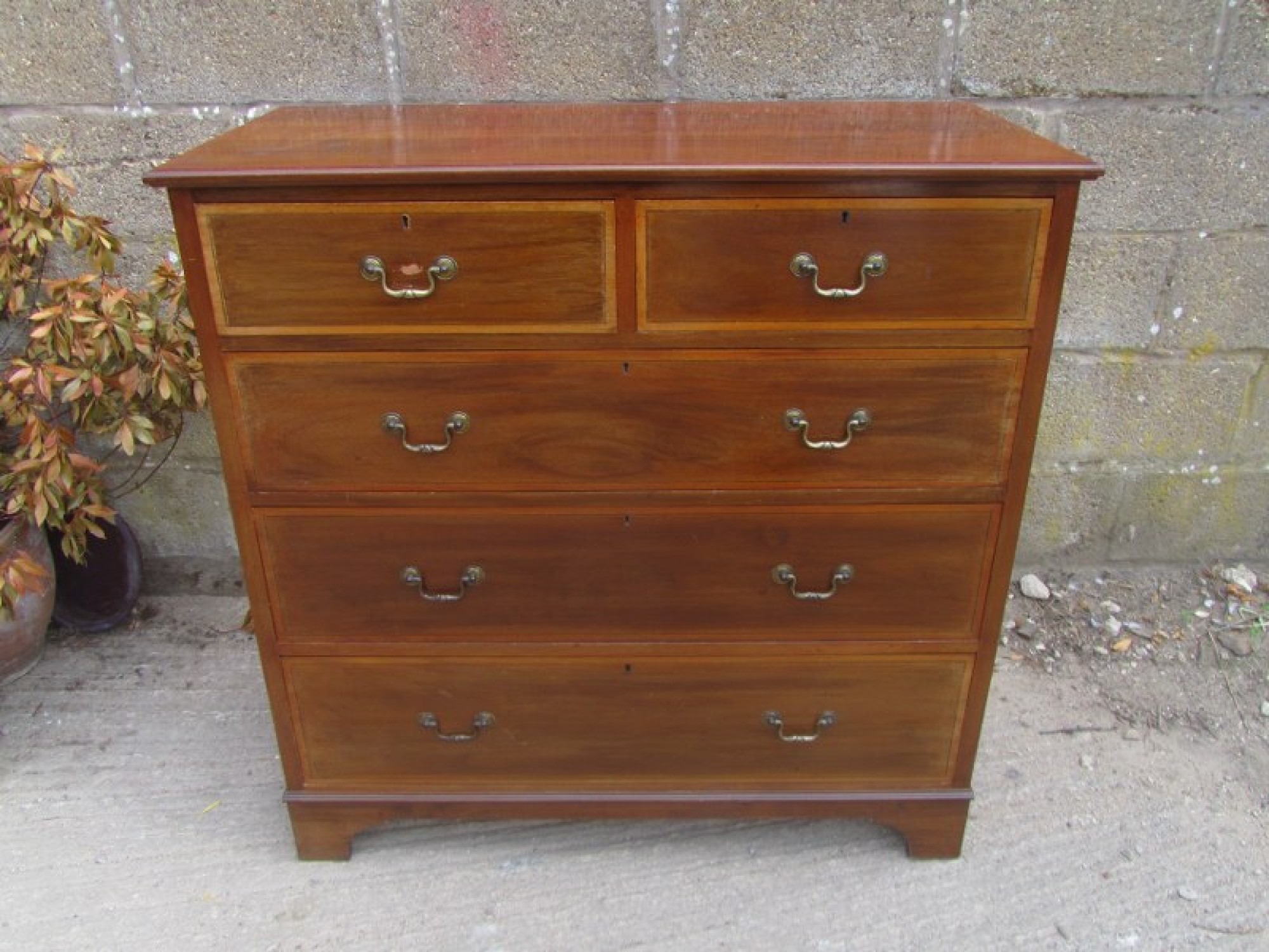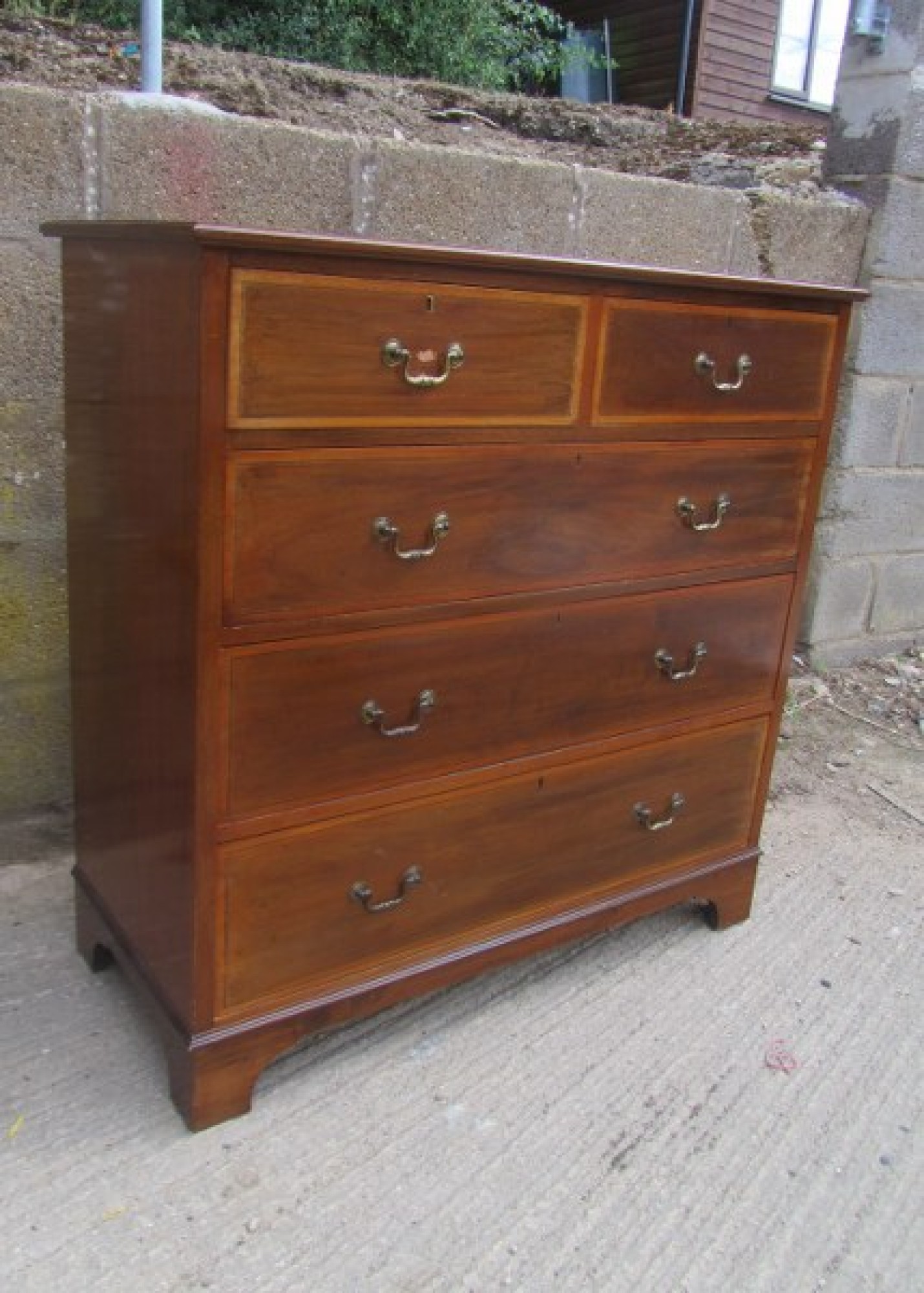 THIS IS A LARGE CHEST OF DRAWERS FROM THE EDWARDIAN PERIOD. IT HAS 2 SMALL DRAWERS OVER LARGE GRADUATED DRAWERS. EACH DRAWER HAS METAL HANDLES AND HAND CUT DOVETAIL JOINTS.