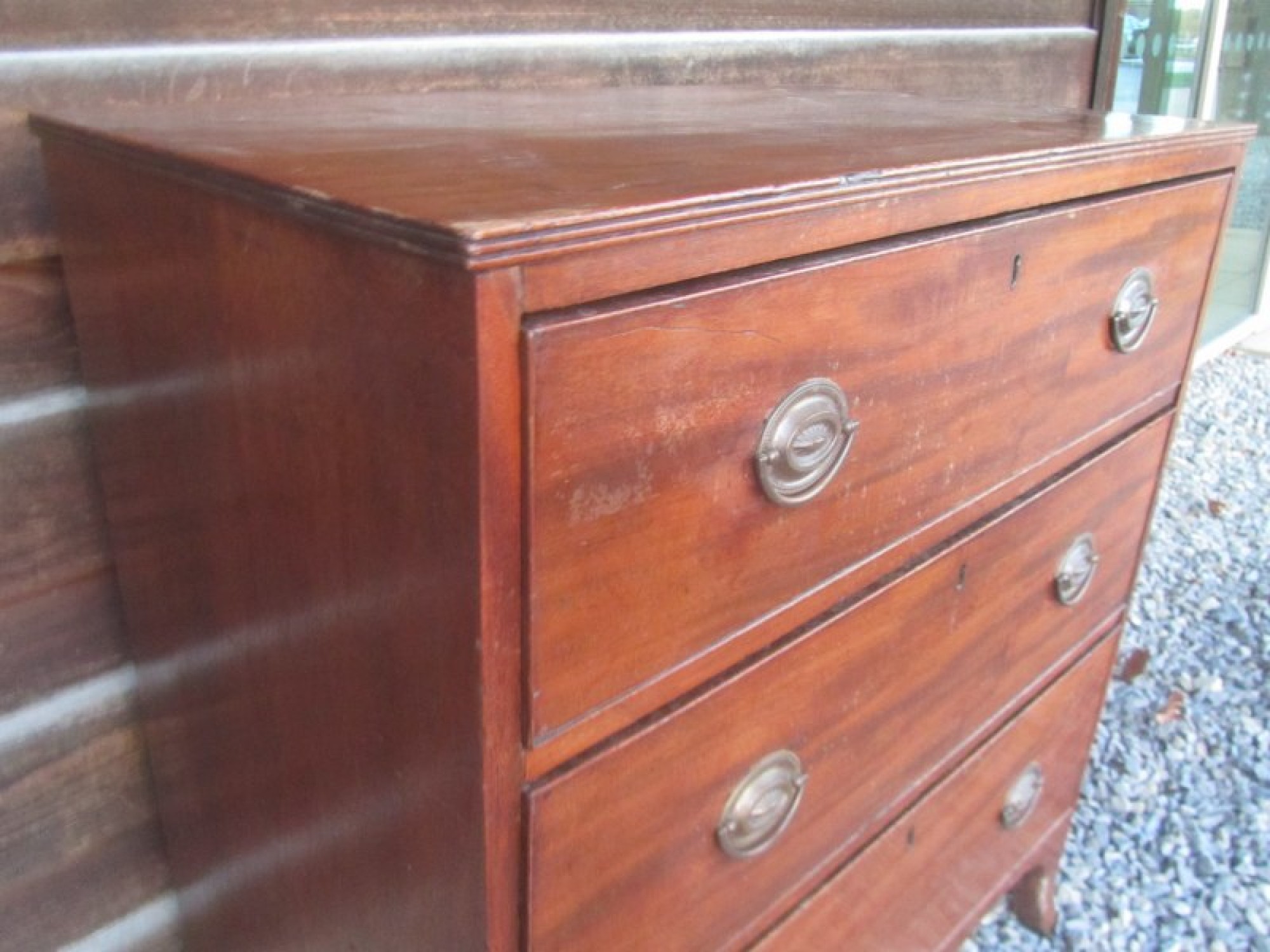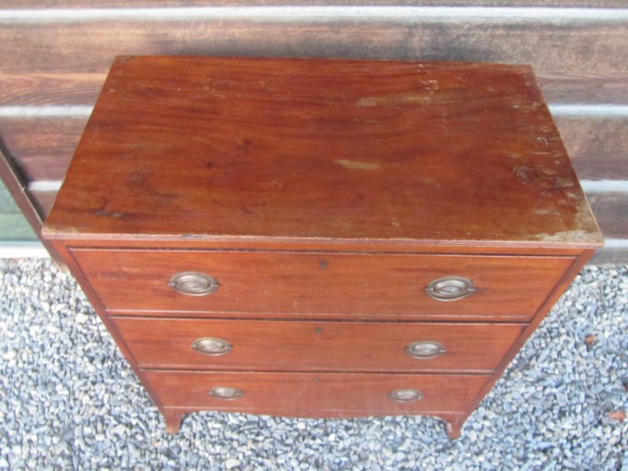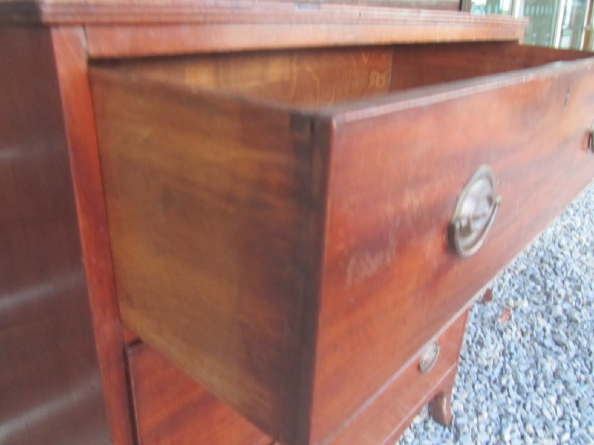 THIS IS A SMALL CHEST OF DRAWERS FROM THE LATE GEORGIAN PERIOD. IT HAS 2 SMALL DRAWERS OVER 3 LARGE GRADUATED DRAWERS. EACH DRAWER HAS METAL HANDLES AND HAND CUT DOVETAIL JOINTS.