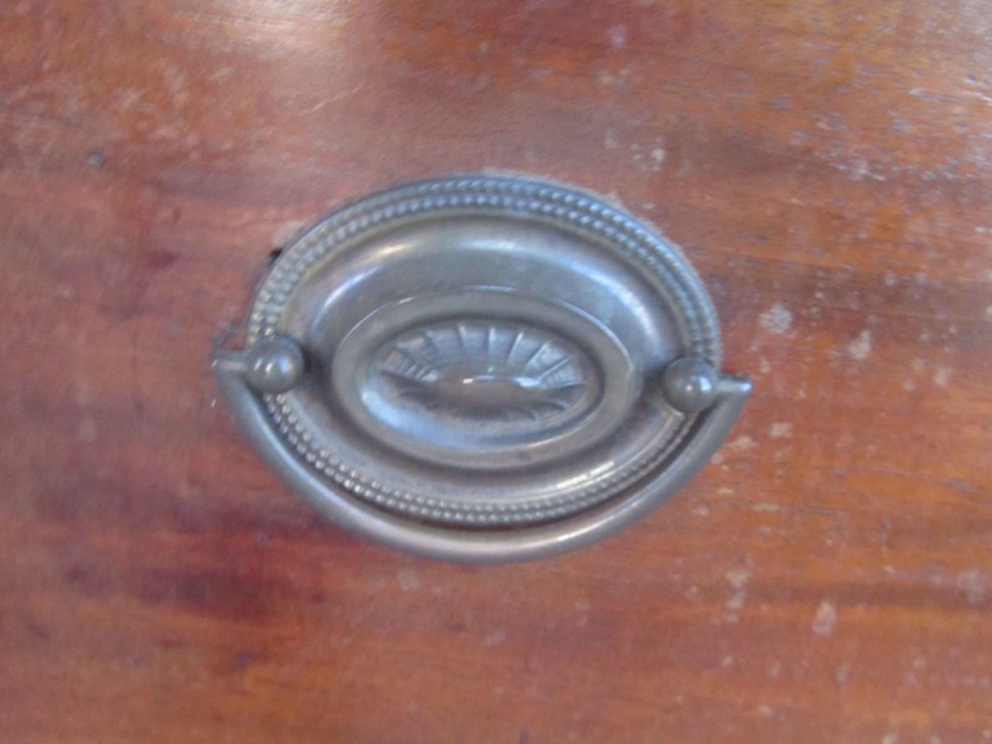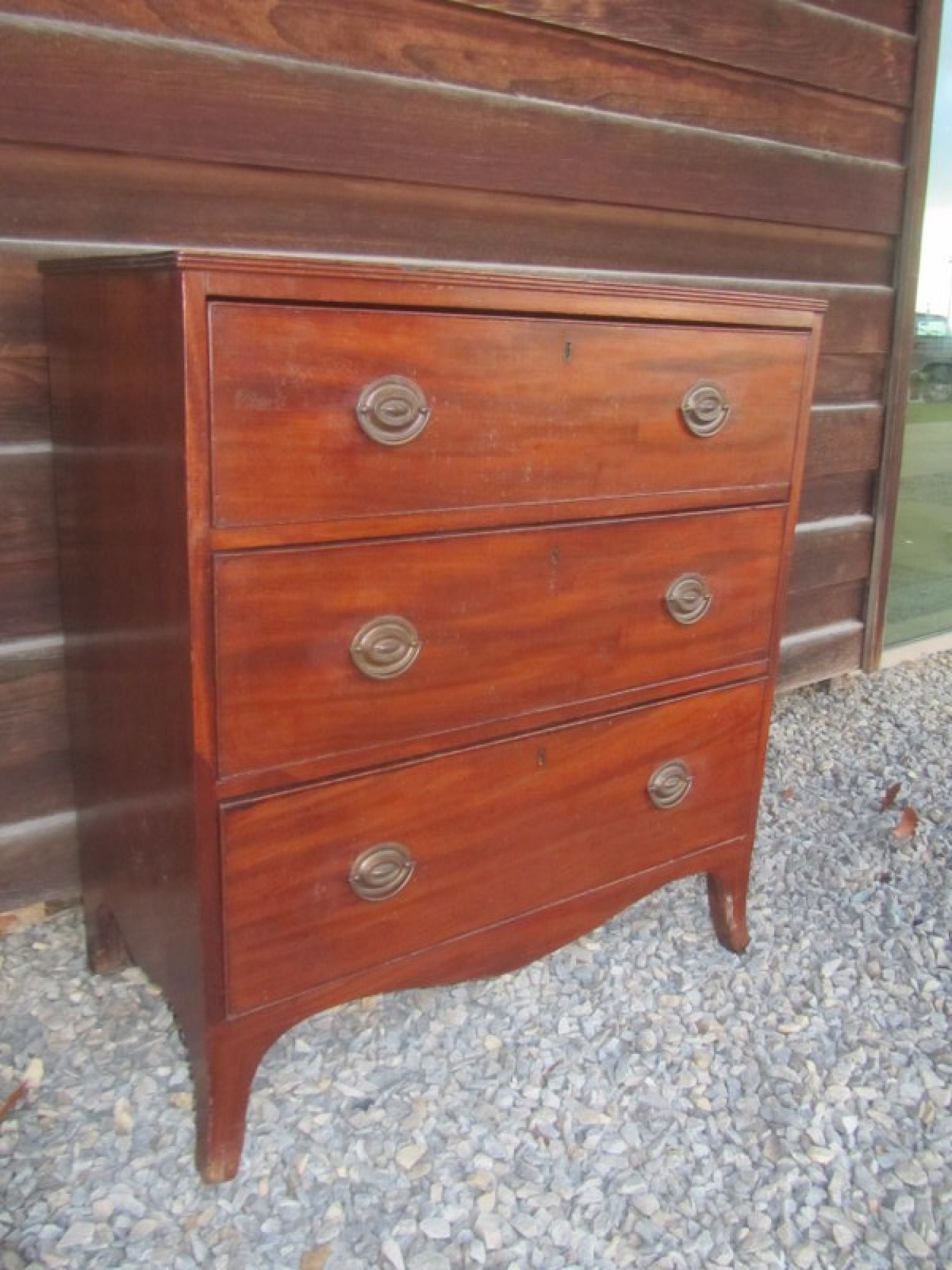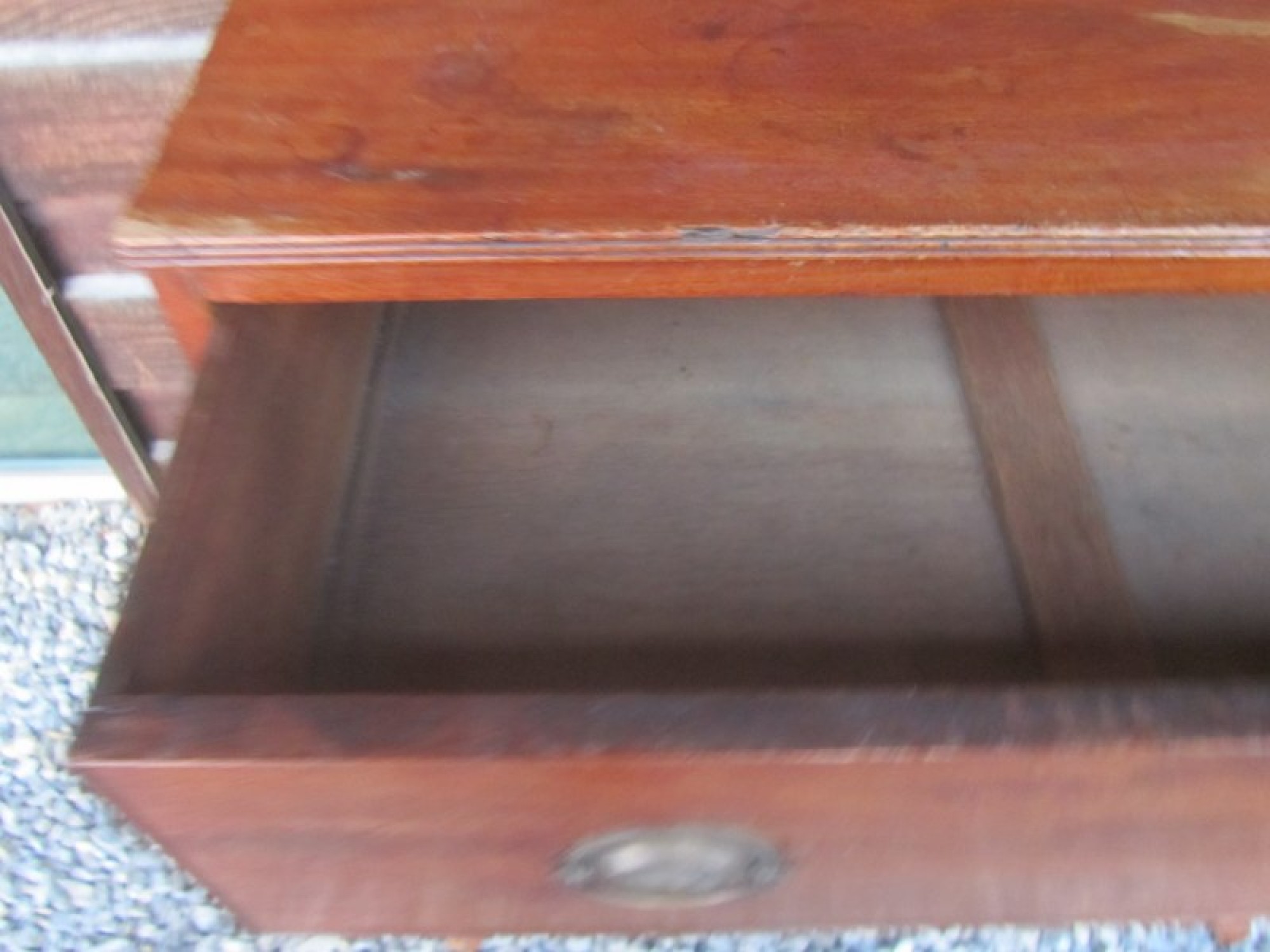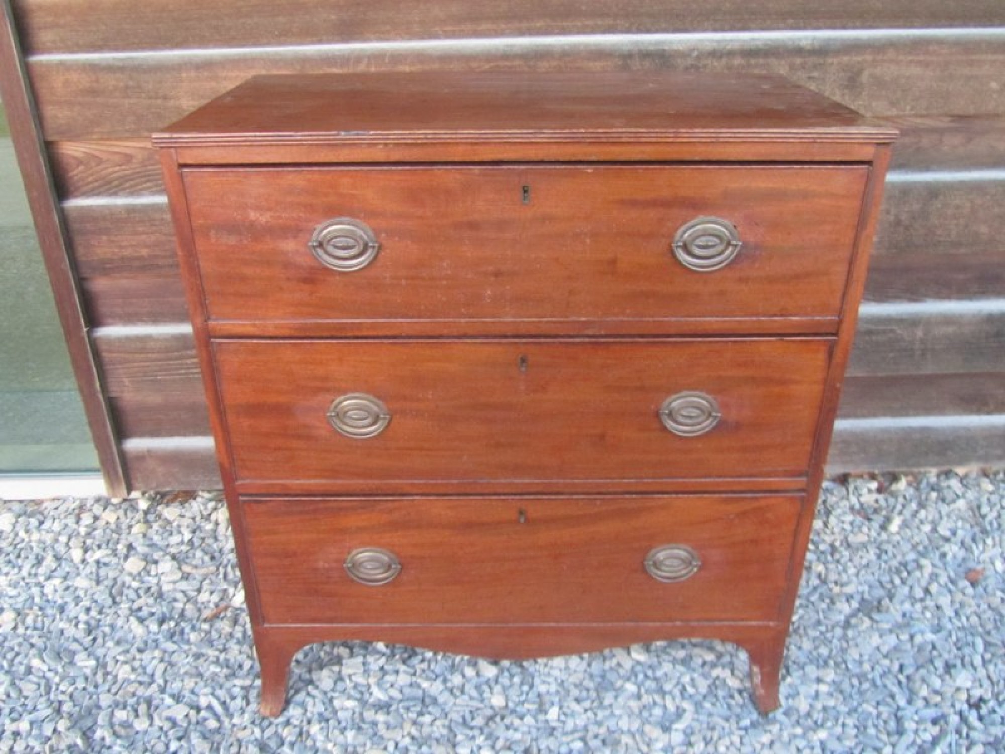 THIS IS A SMALL CHEST OF DRAWERS FROM THE LATE GEORGIAN PERIOD. IT HAS 2 SMALL DRAWERS OVER 3 LARGE GRADUATED DRAWERS. EACH DRAWER HAS METAL HANDLES AND HAND CUT DOVETAIL JOINTS.