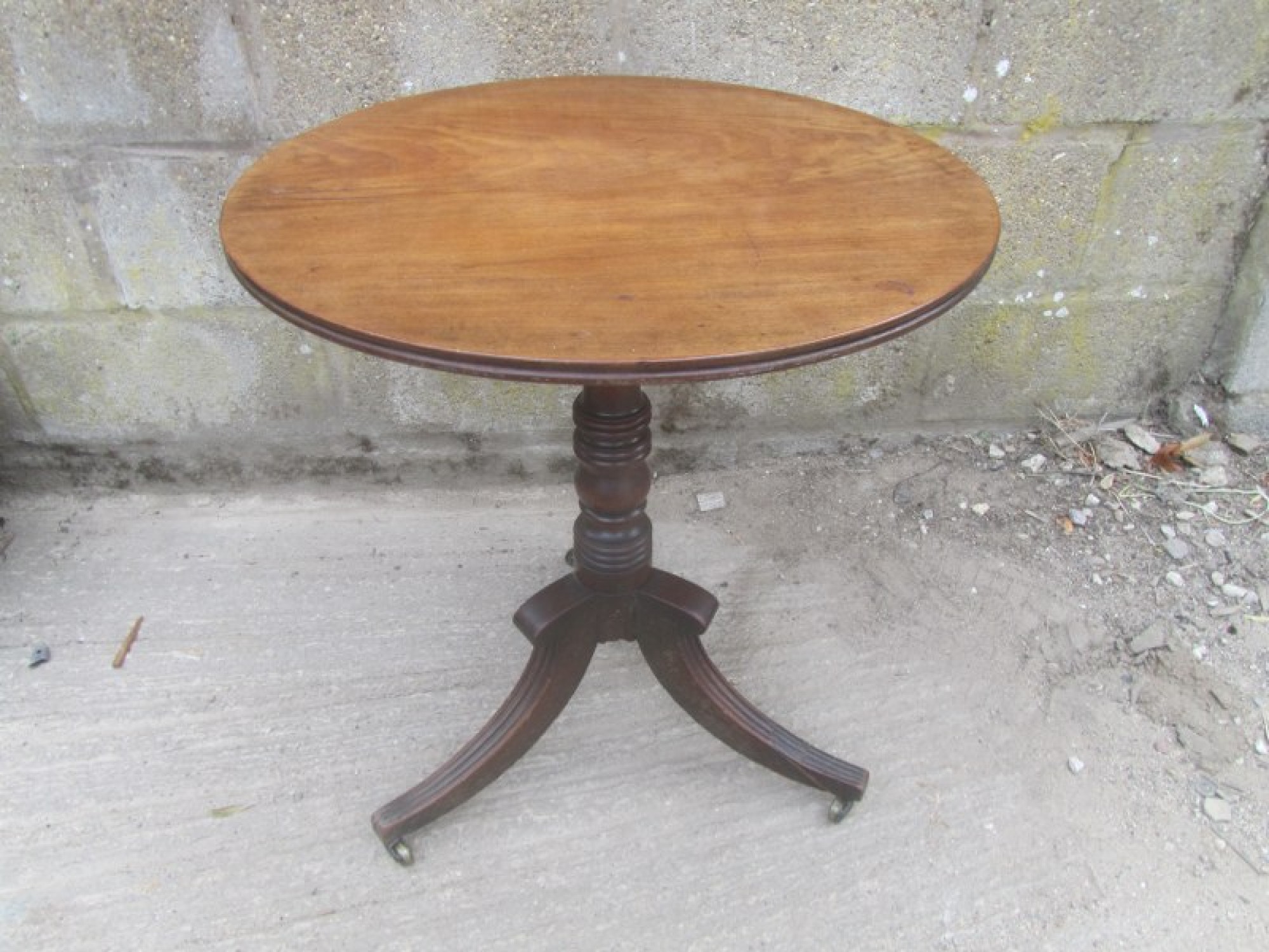 Items for Sale ANTIQUE GEORGIAN MAHOGANY TILT TOP BREAKFAST / SIDE TABLE Share: View Larger Image View Larger Image View Larger Image View Larger Image View Larger Image View Larger Image Select to enlarge Swipe £ 75 THIS IS A TILT TOP TABLE FROM THE EARLY 19th CENTURY GEORGIAN PERIOD. IT IS MADE FROM SOLID MAHOGANY, SOME MARKS AND WEAR. IT STANDS ON PAD FEET, THE LEGS HAVE BEEN REPAIRED. WITH BRASS SLIDE CATCH UNDERNEATH. IN AVERAGE CONDITION. ADDITIONAL DETAILS RESERVE ITEM Condition:AVERAGE Manufacture Date:1800s Height:71 cms Length:66 cms Depth:66 cms Quantity:1 Item Number:39917 * Please complete all the fields below to send an enquiry about this product. Please reserve this item for me… Reset Send
