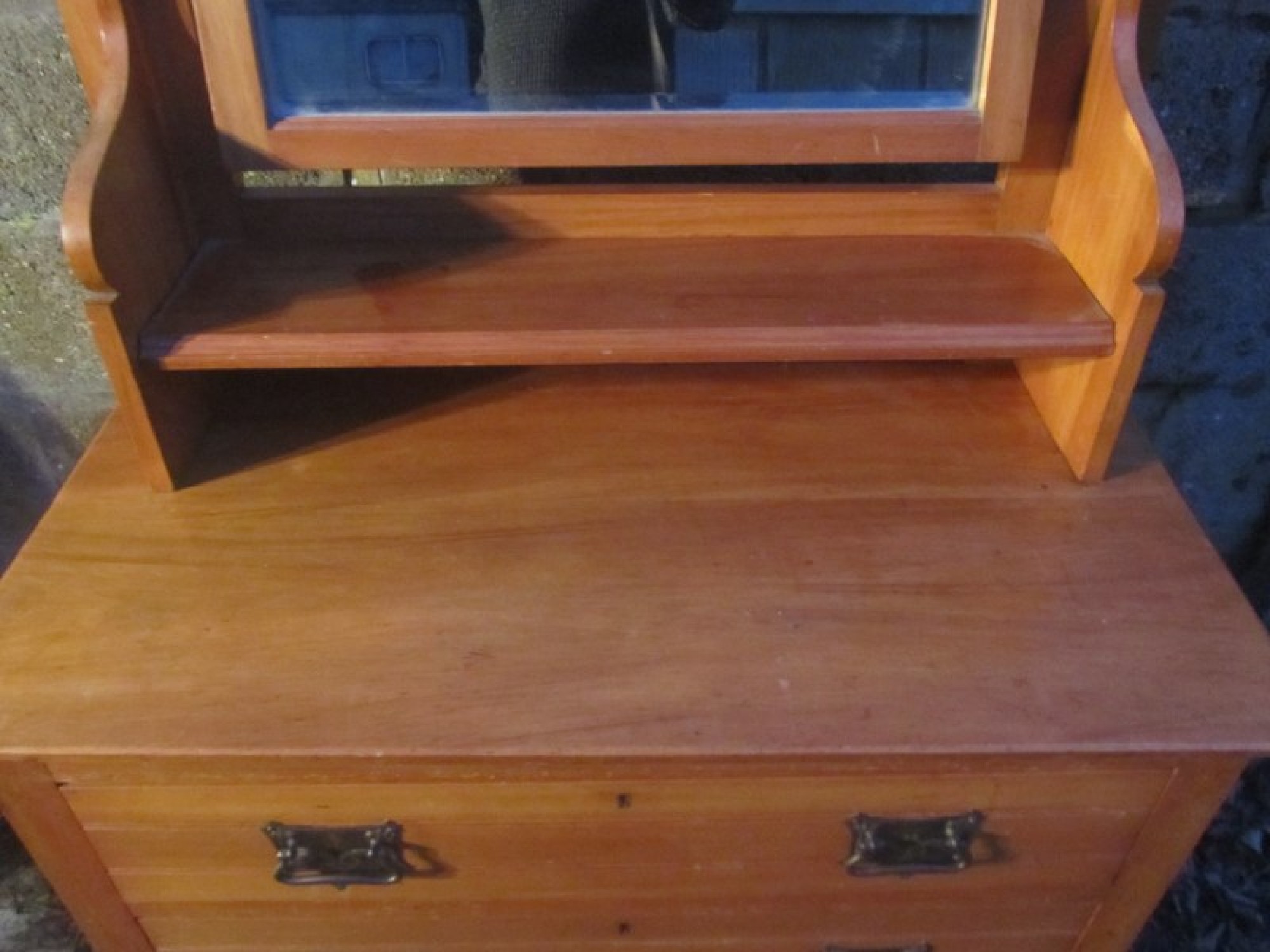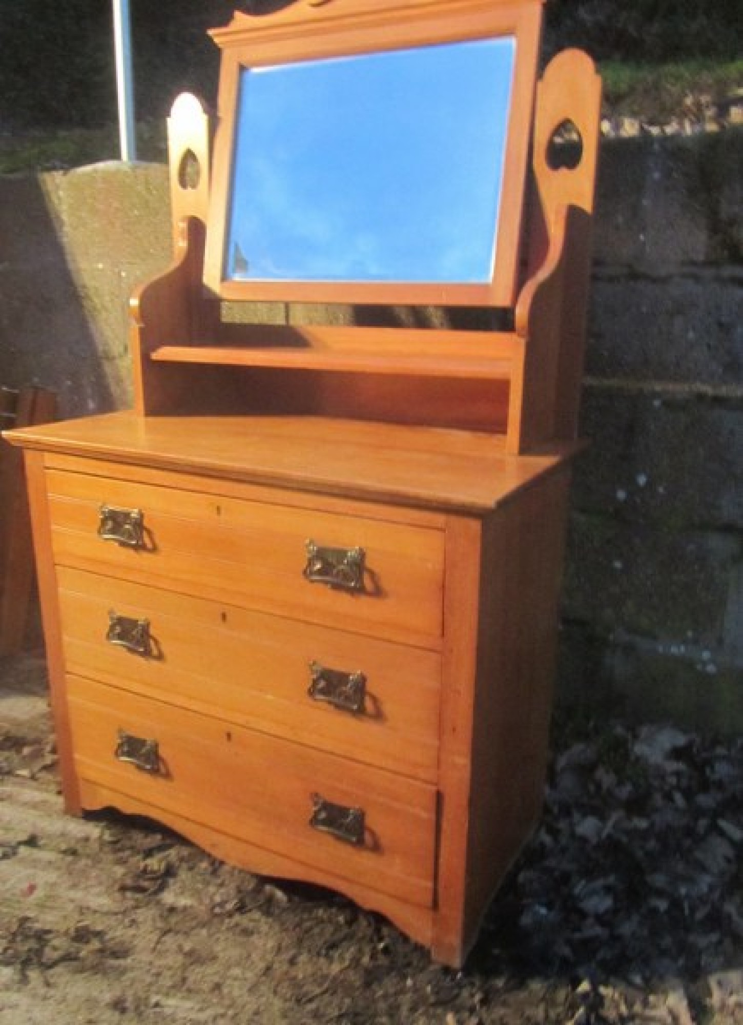 THIS IS A STYLISH ANTIQUE SATINWOOD DRESSING TABLE, THE DRAWERS ARE DOVETAILED. GOOD QUALITY. IT IS STRONG AND STURDY. MIRROR ABOVE. SPLIT ON THE LEFT HAND SIDE, STILL STURDY.