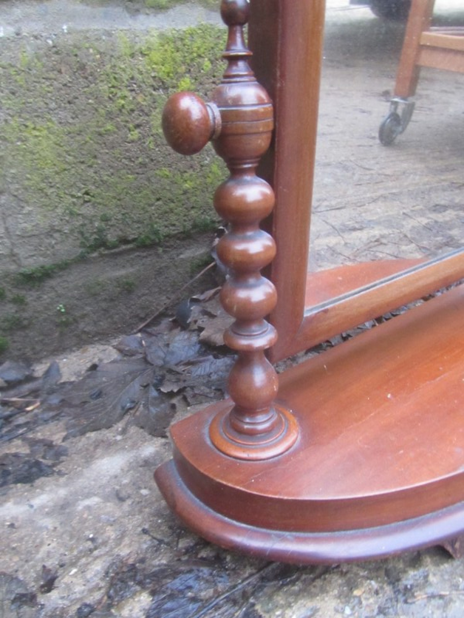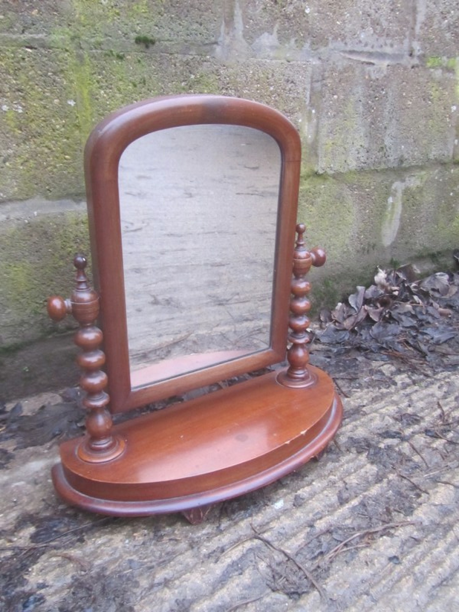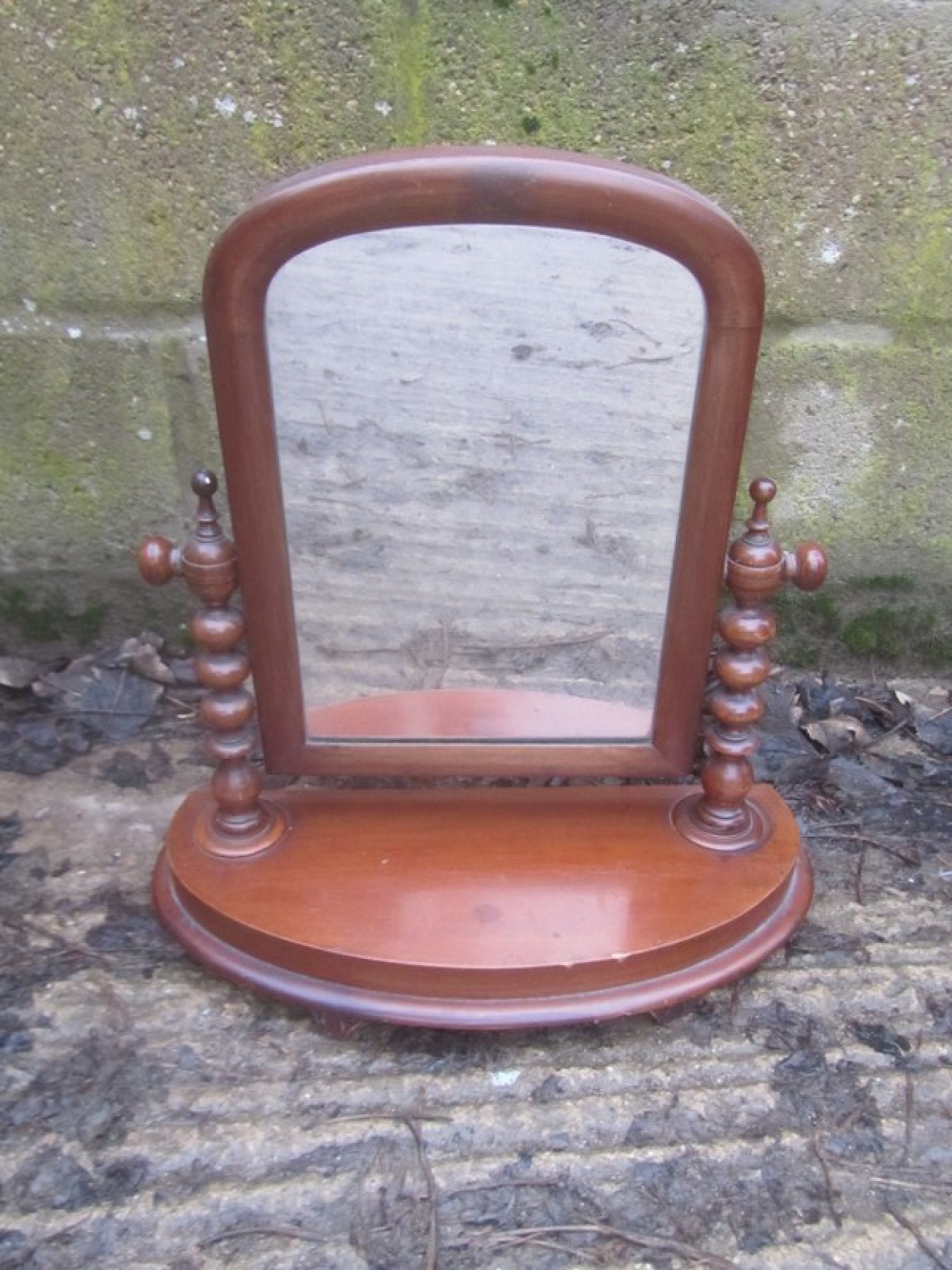 AN ANTIQUE DRESSING TABLE MIRROR, THE MIRROR IS IN AVERAGE CONDITION. IN MAHOGANY WITH DECORATIVE TWISTED COLUMNS. SOME WEAR AND FADING.