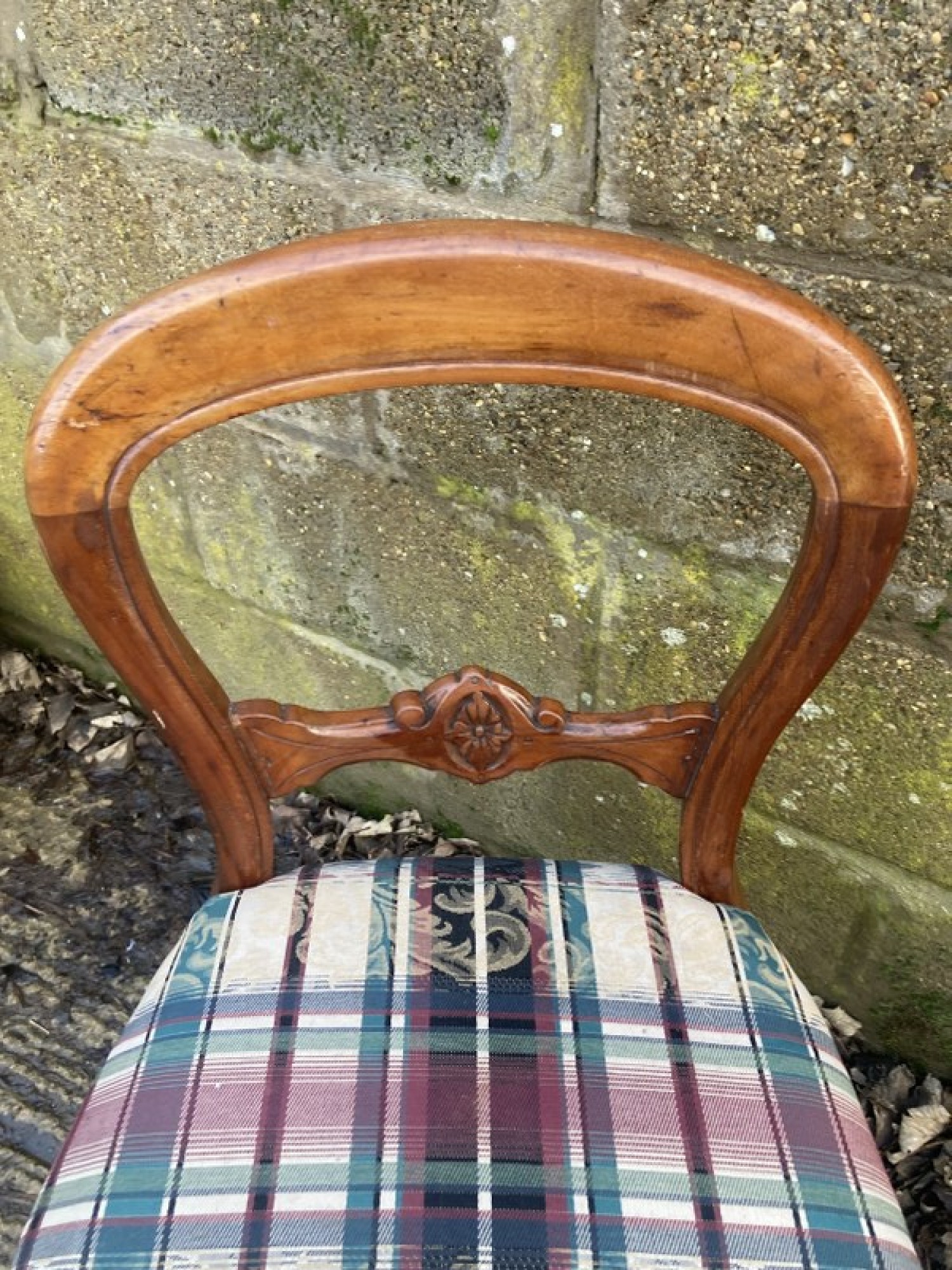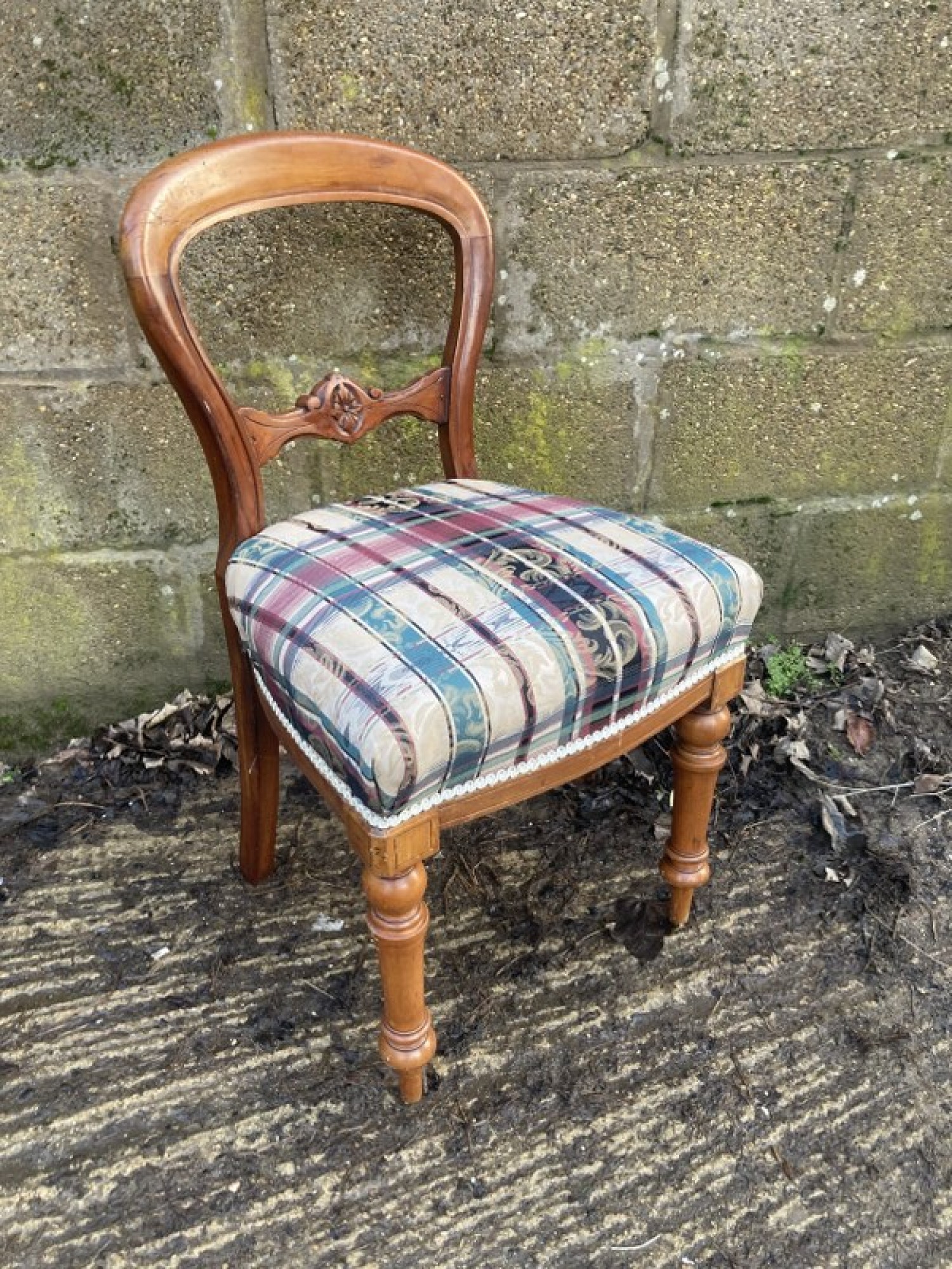 A CHAIR FROM THE LATE VICTORIAN PERIOD. MADE FROM MAHOGANY. BALLOON BACK WITH TURNED LEGS. THE SEAT IS COVERED IN MATERIAL, EASY TO RECOVER. HEIGHT TO SEAT IS 50cm.