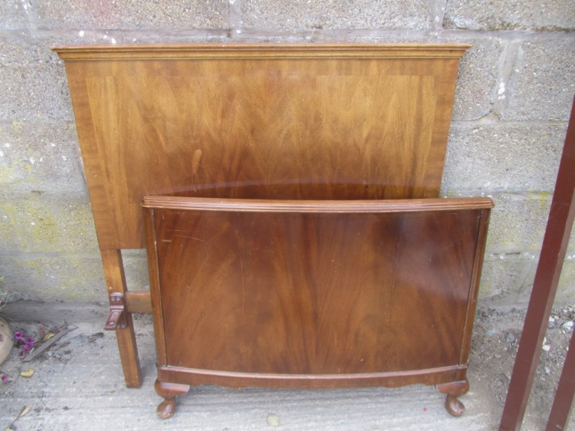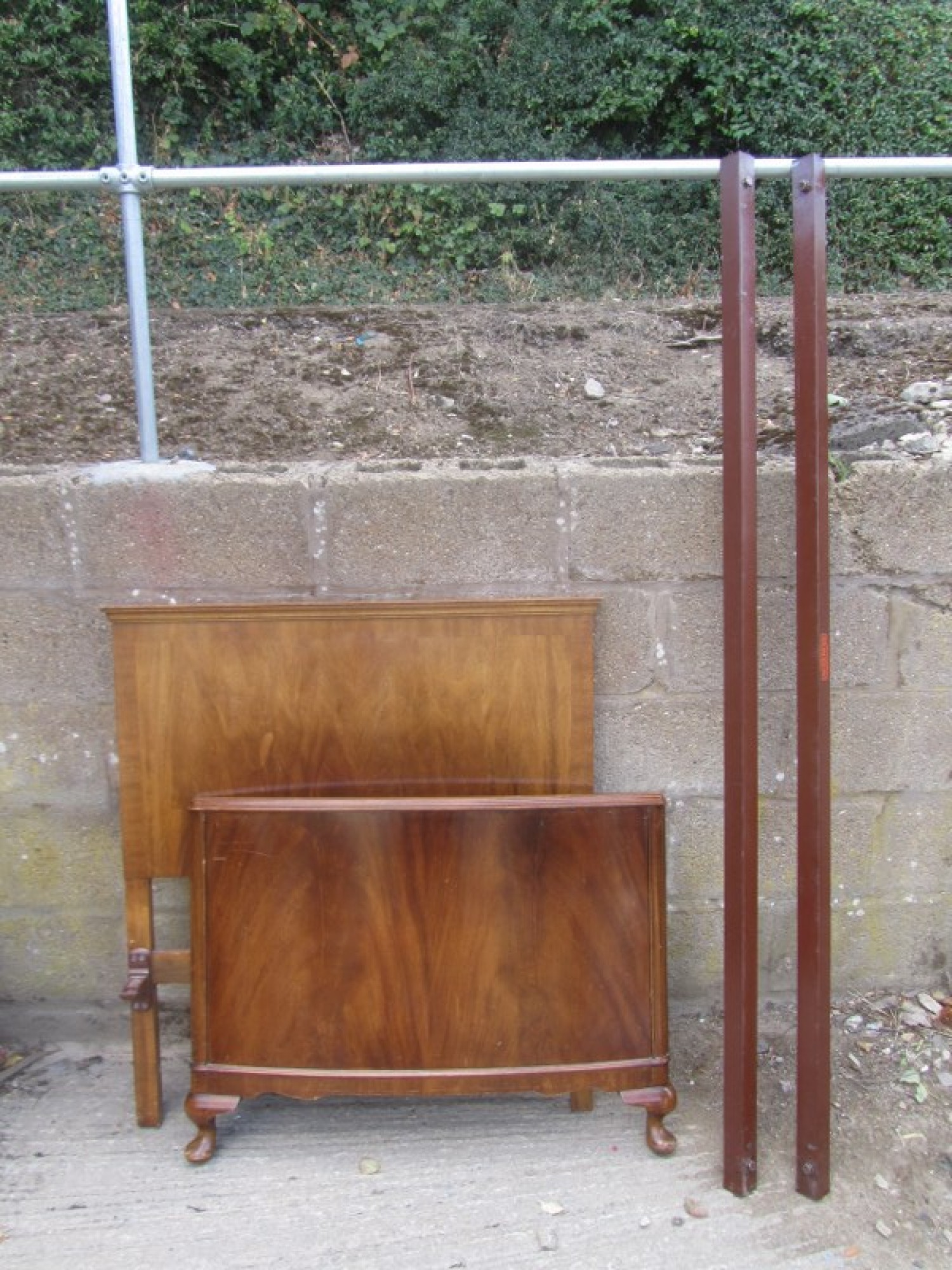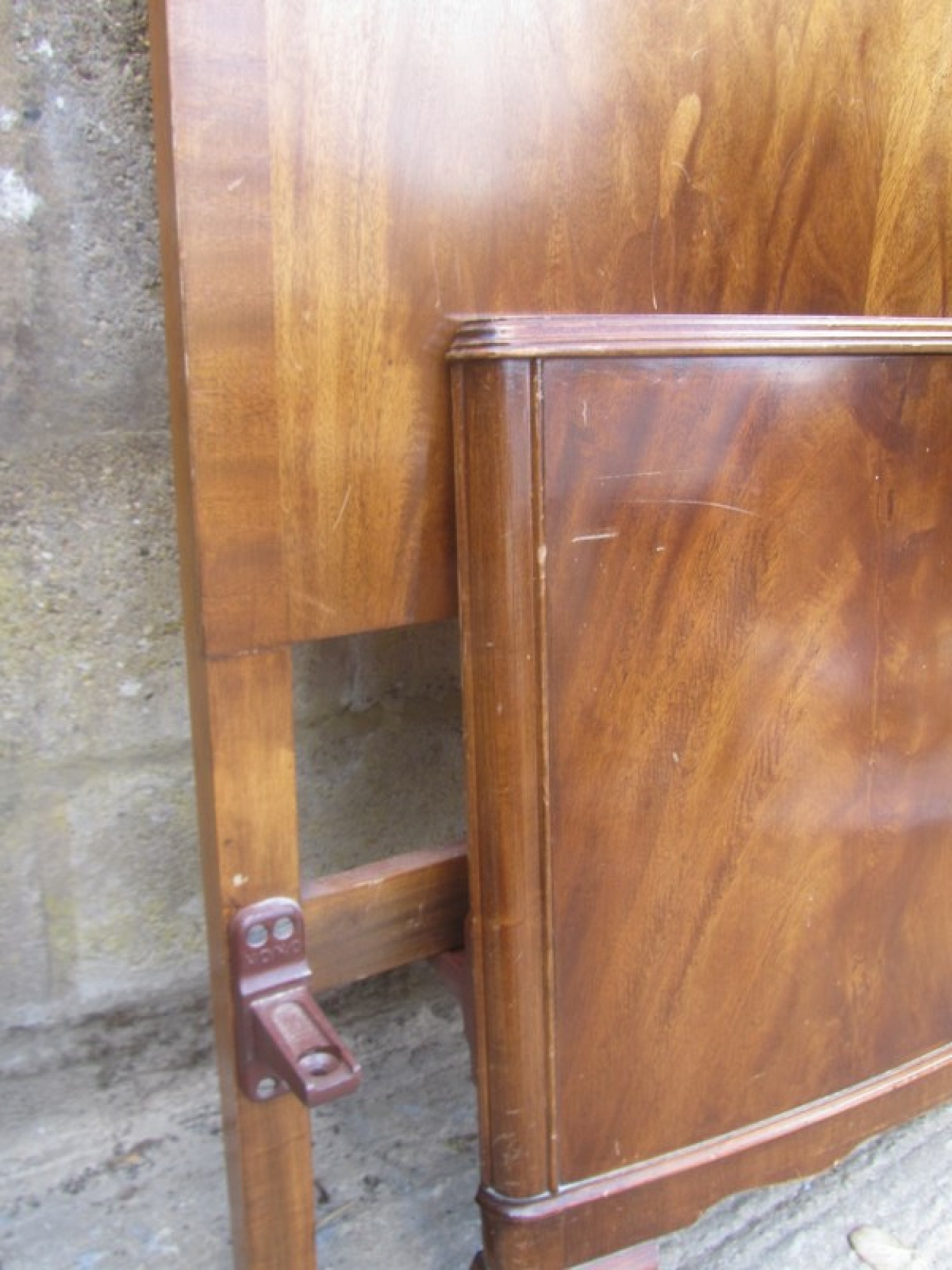 THIS IS A STURDY SINGLE 3' BED FRAME FROM THE 1940s. THE ENDS ARE MAHOGANY VENEERED WITH WEAR AND TEAR. INCLUDES A SET OF METAL BED RAILS. THERE IS NO BED BASE OR SPRINGS.