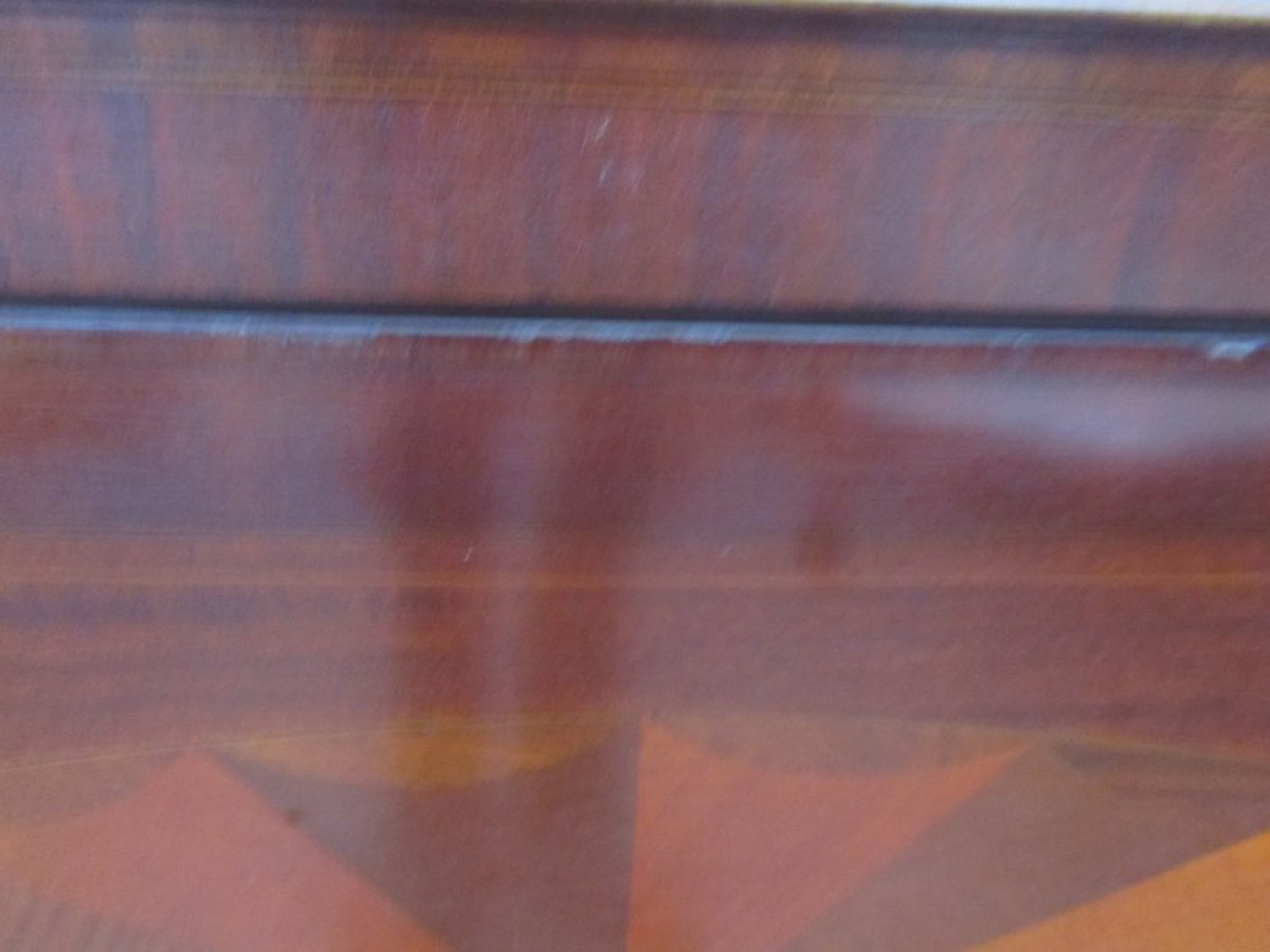 THIS IS A STURDY SINGLE 3' BED FRAME FROM THE 1900s. THE ENDS ARE MAHOGANY VENEERED WITH WEAR AND TEAR. INLAID DESIGN. INCLUDES A SET OF METAL BED RAILS. THERE IS NO BED BASE OR SPRINGS. SOME FADING AND WEAR.