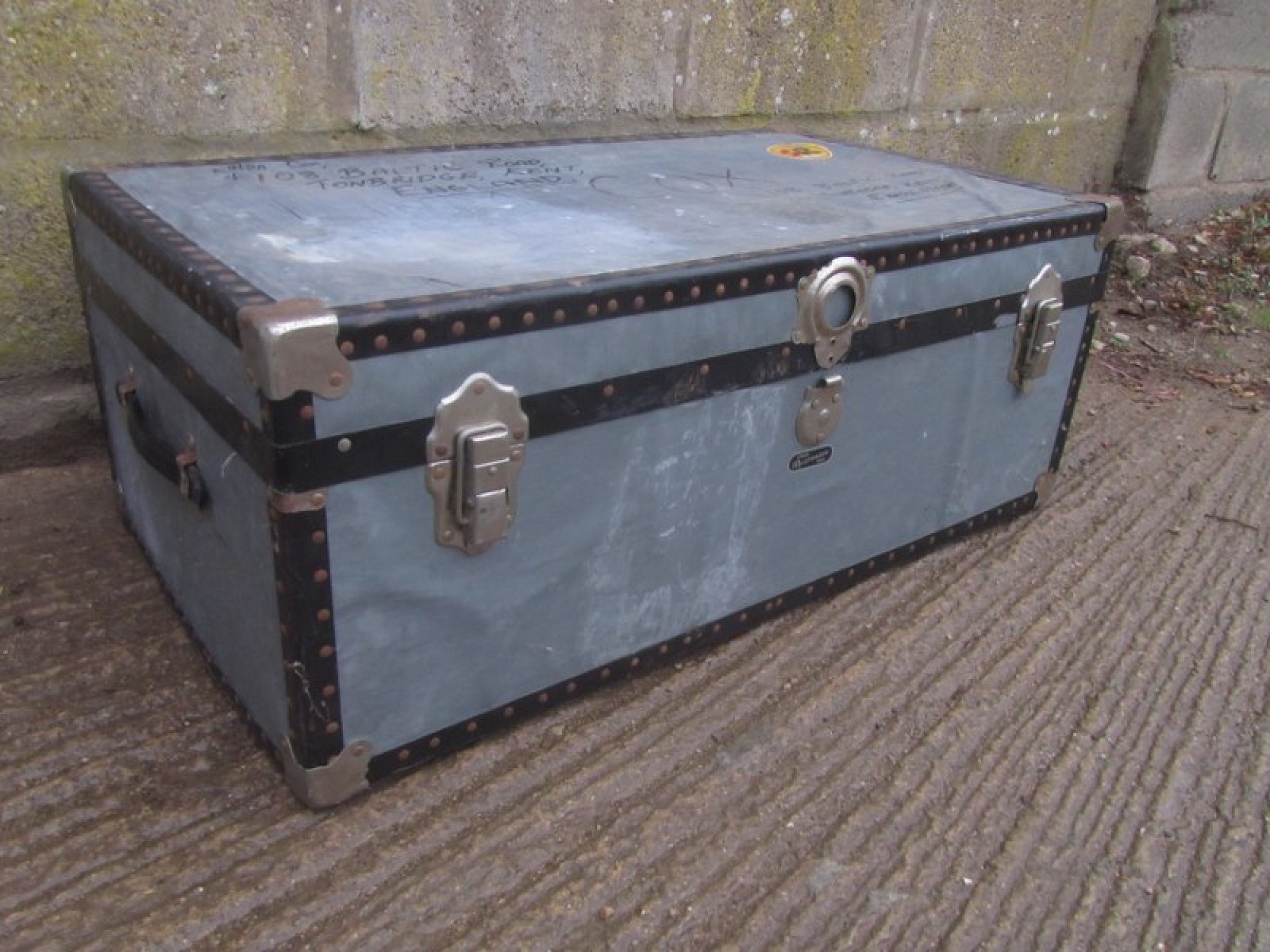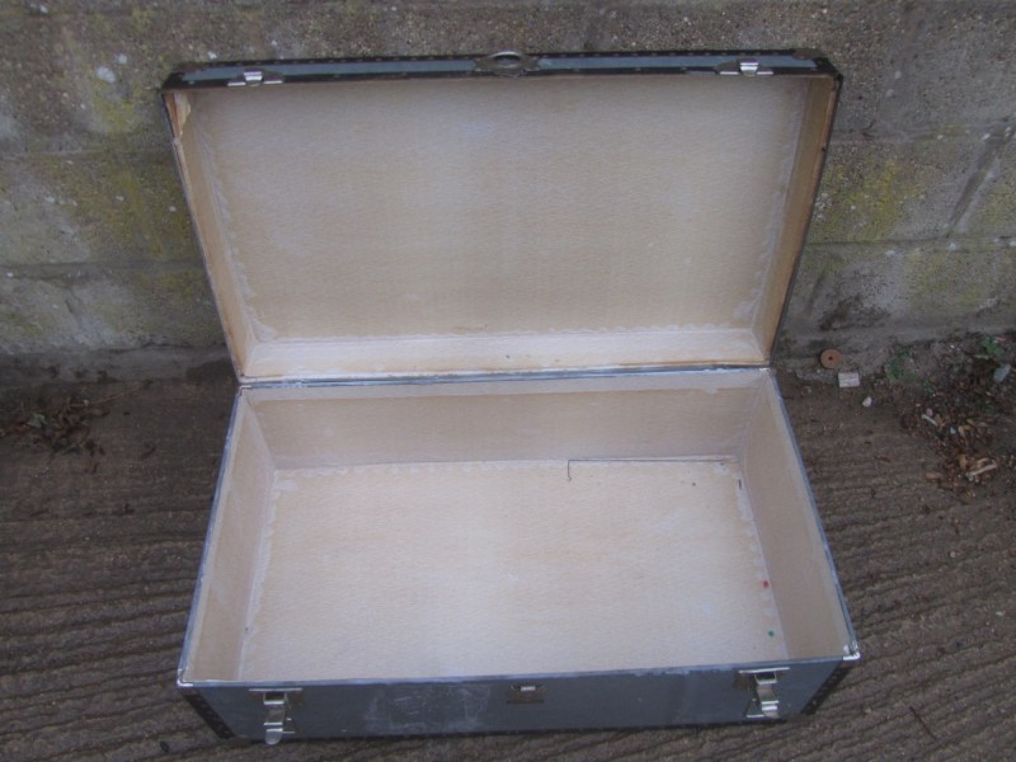 AN ANTIQUE METAL TRUNK WITH METAL HANDLES EACH SIDE. THIS WAS PROBABLY A CHEST FOR SOMEONE IN THE NAVY / ARMY etc. IT WOULD BE A GREAT CHEST FOR STORAGE OF TOYS, SHOES etc.
