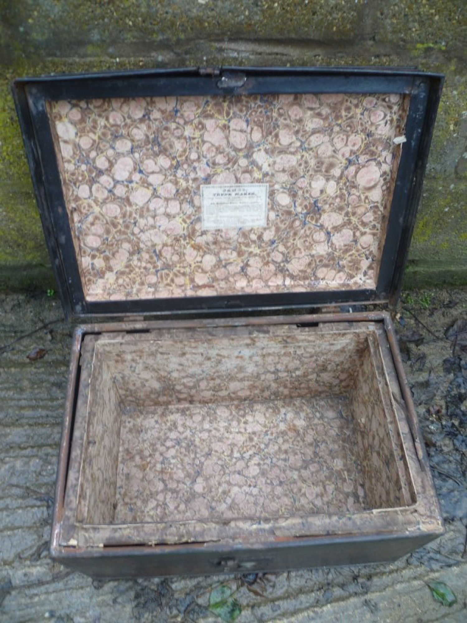 A METAL TRUNK WITH METAL HANDLES EACH SIDE. WITH AN INNER LINING, VERY HEAVY. ORIGINALLY A STRONG BOX / SAFE. SOME WEAR AND LOOSE JOINS. SOME WEAR. ORIGINAL MAKERS LABEL. ORIGINAL PAINT. WITH A BRASS BADGE WITH AN ENGRAVING 'WESLEYAN CHAPEL - NEWBERRY'.