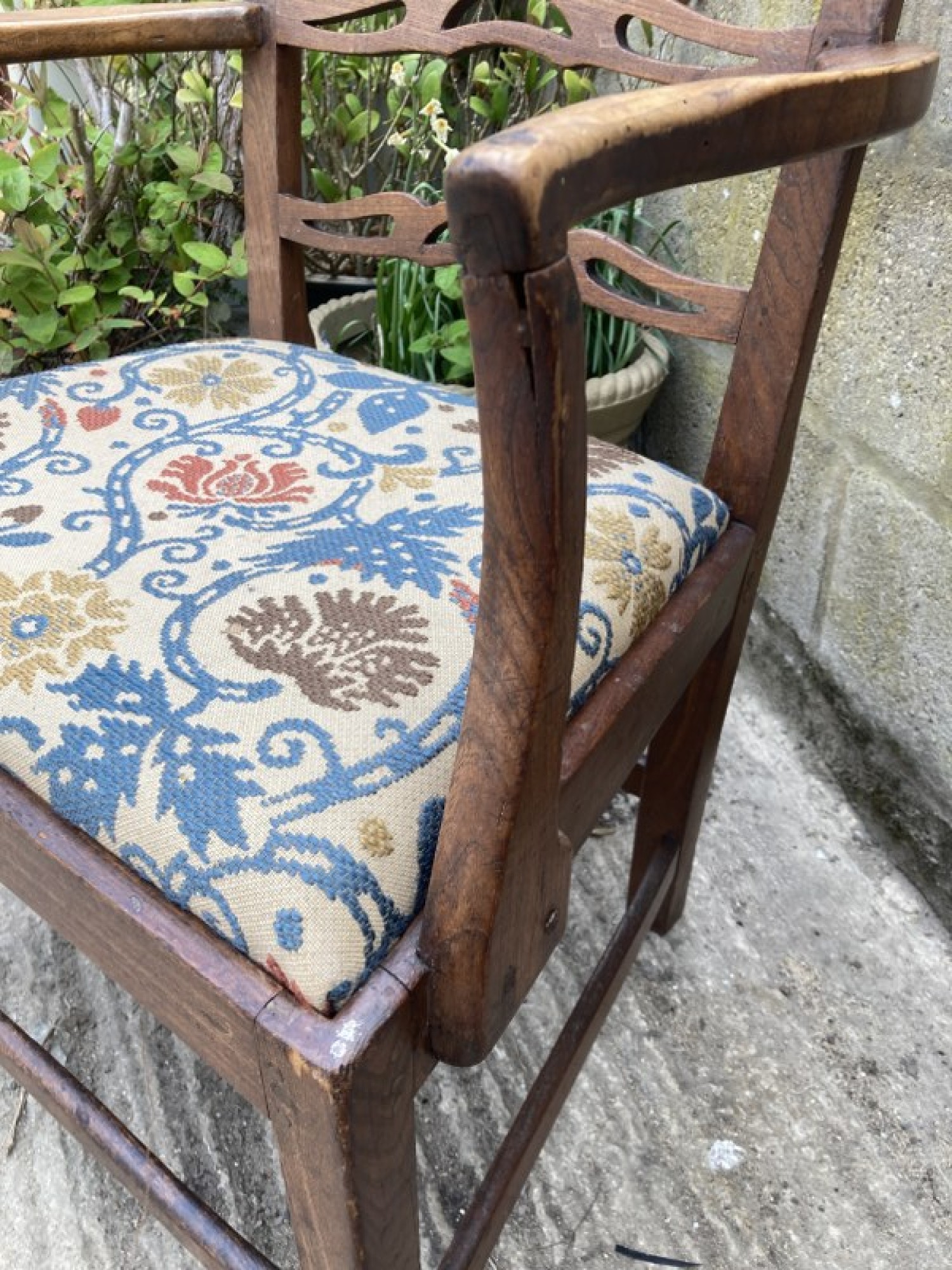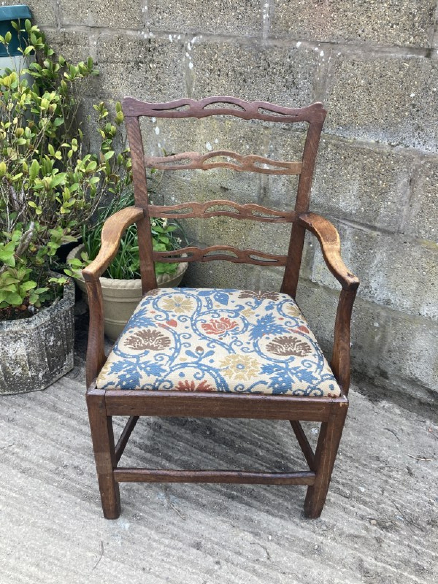 Items for Sale ANTIQUE OAK ARMCHAIR / CARVER DINING CHAIR - VINTAGE Share: View Larger Image View Larger Image View Larger Image View Larger Image View Larger Image Select to enlarge Swipe £ 65 THIS IS A STUNNING OAK CHAIR FROM THE EARLY 19th CENTURY. SOLID OAK FRAME. THERE IS A CRACK IN THE FRAME ON THE BACK CORNER. THE SEAT'S UPHOLSTERED IN FLORAL MATERIAL. SEAT HEIGHT -42cm, ARM REST HEIGHT IS 67cm. ADDITIONAL DETAILS RESERVE ITEM Condition:AVERAGE Manufacture Date:1820s Height:94 cms Length:57 cms Depth:59 cms Quantity:1 Item Number:41468 * Please complete all the fields below to send an enquiry about this product. Please reserve this item for me… Reset Send
