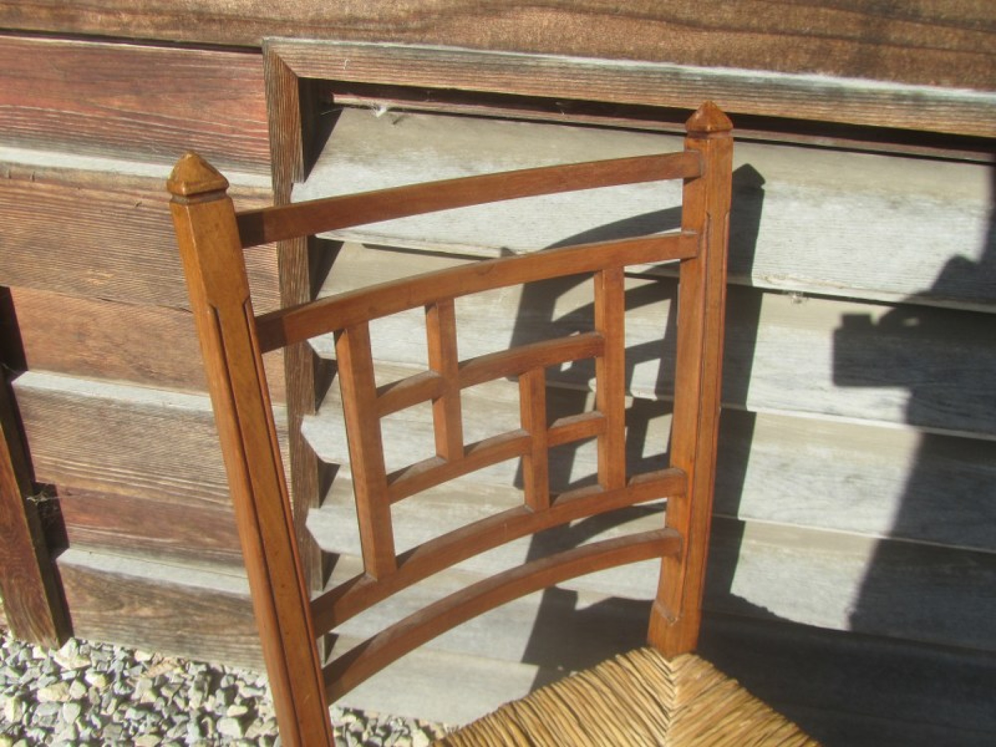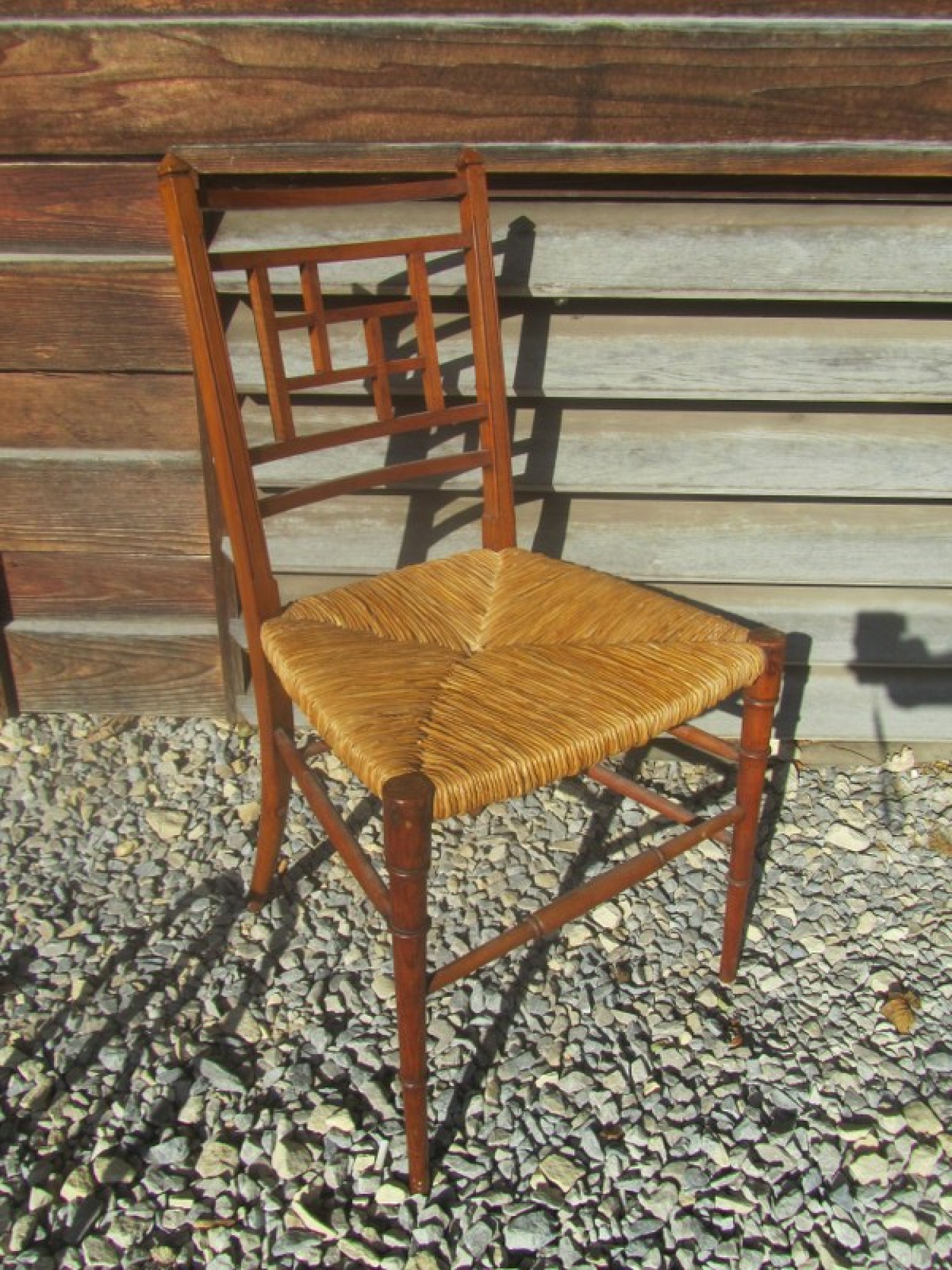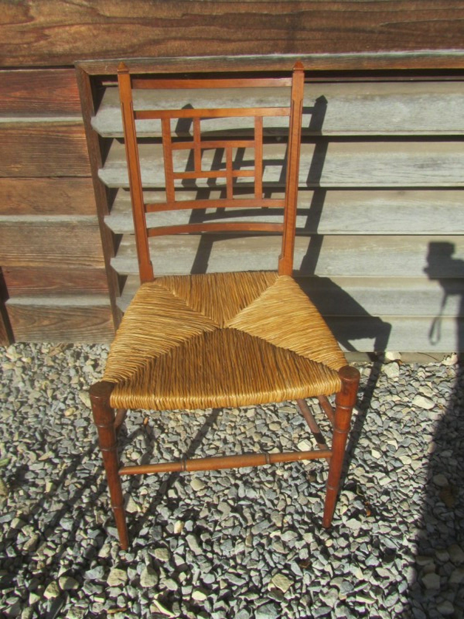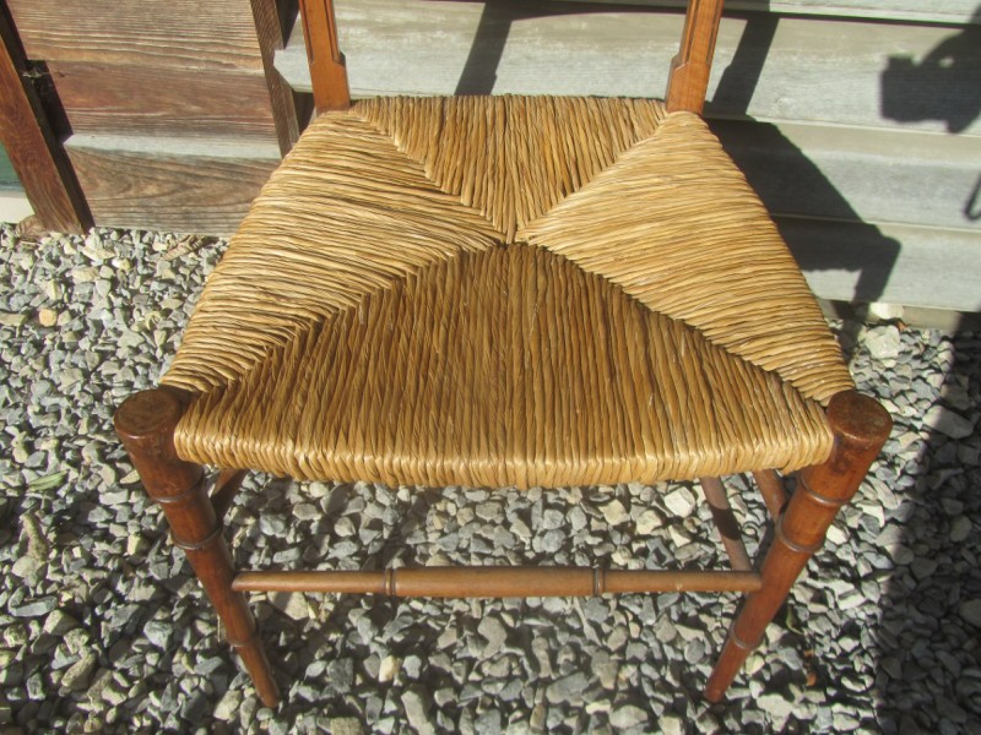 A SINGLE CHAIR, MADE FROM SOLID WOOD. THE SEAT IS WOVEN, NO DAMAGE. IT IS IN AVERAGE CONDITION. ONE RAIL IS MISSING AT THE BOTTOM. HEIGHT TO SEAT IS 44cm.