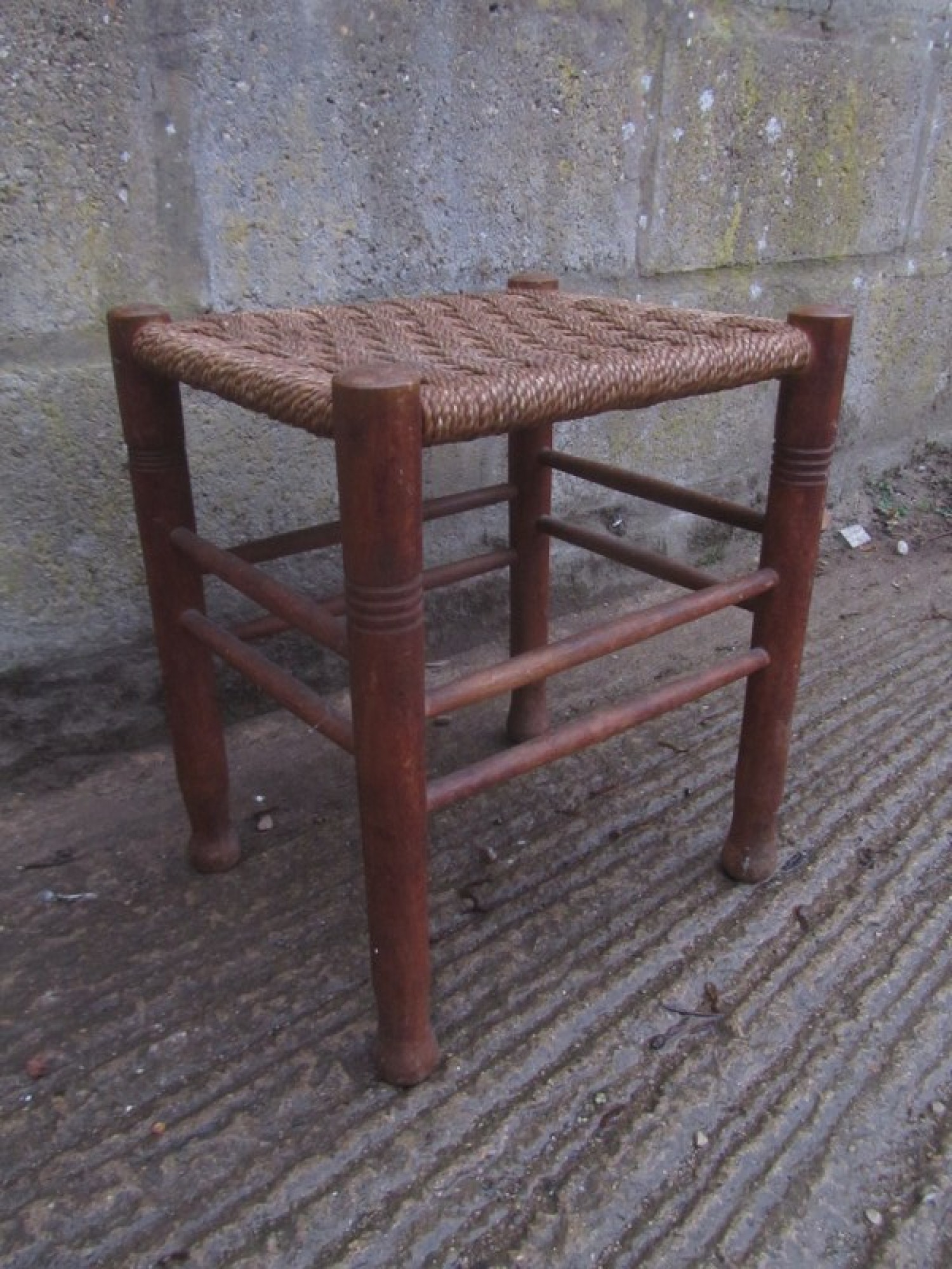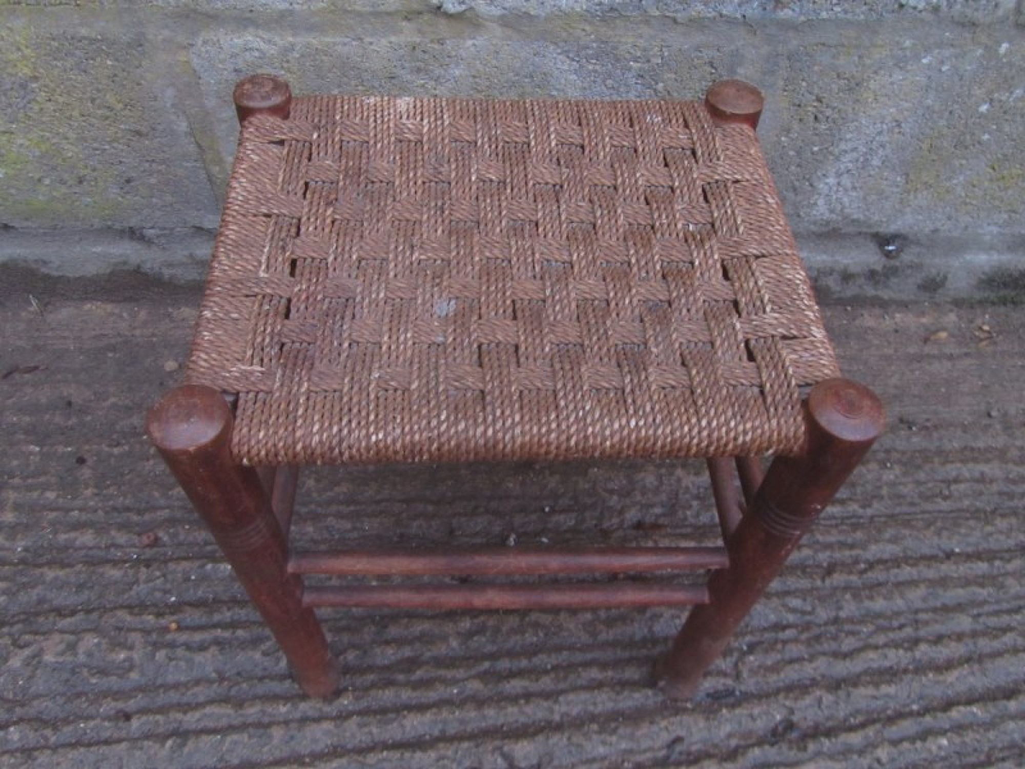 THIS IS A VINTAGE FOOT STOOL FROM THE 1940s. MADE FROM SOLID WOOD. WITH A WOVEN STRING SEAT TO GIVE A STYLISH VINTAGE LOOK. IN AVERAGE CONDITION, WEAR AND TEAR. WORN STRING.