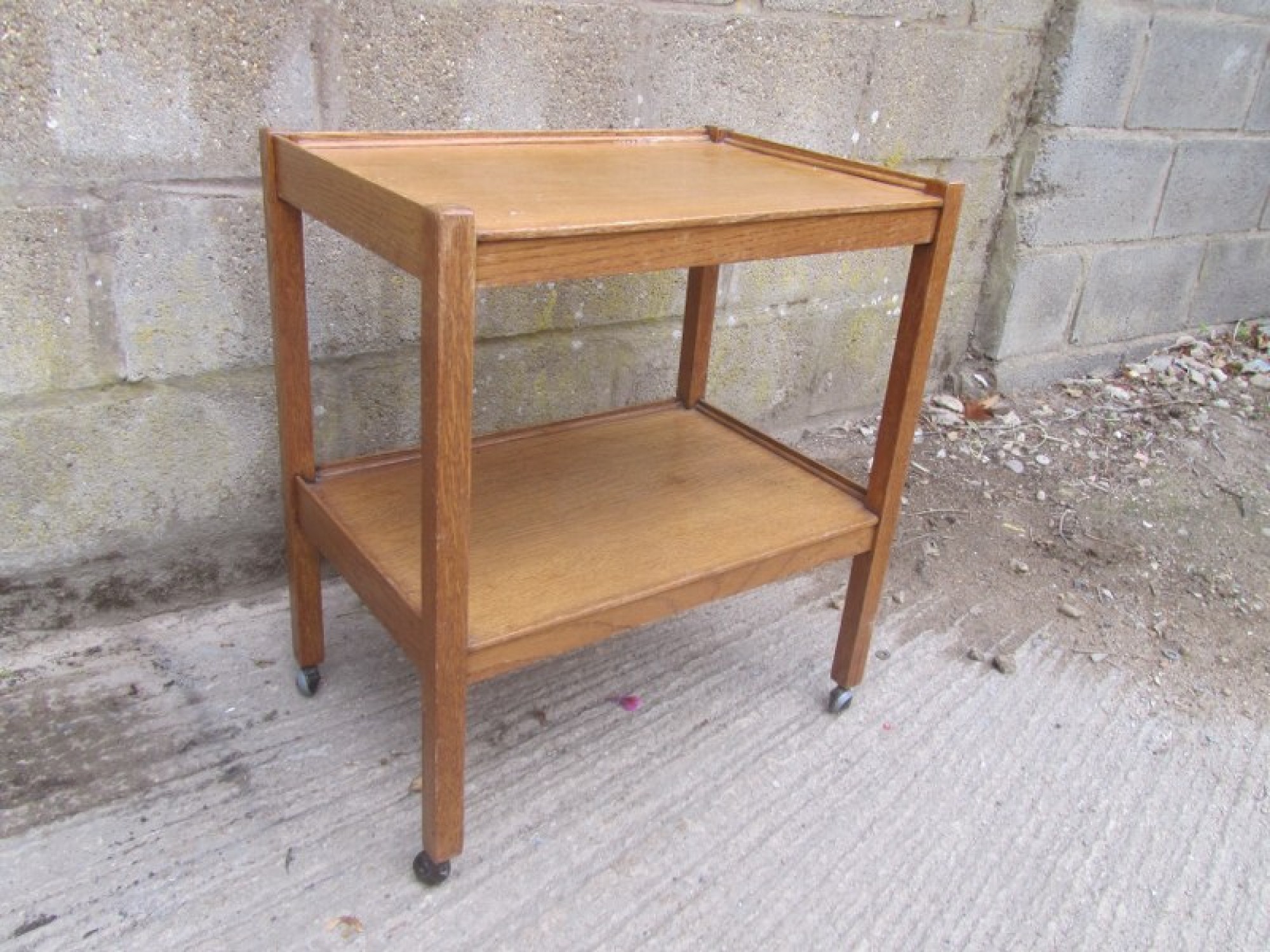 THIS IS A VINTAGE TROLLEY FROM THE 1940s. IT IS OAK, SOLID & VENEER. THERE ARE CASTORS ON THE END OF THE LEGS. IT IS IN GOOD CONDITION, SOME MINOR WEAR AND TEAR.