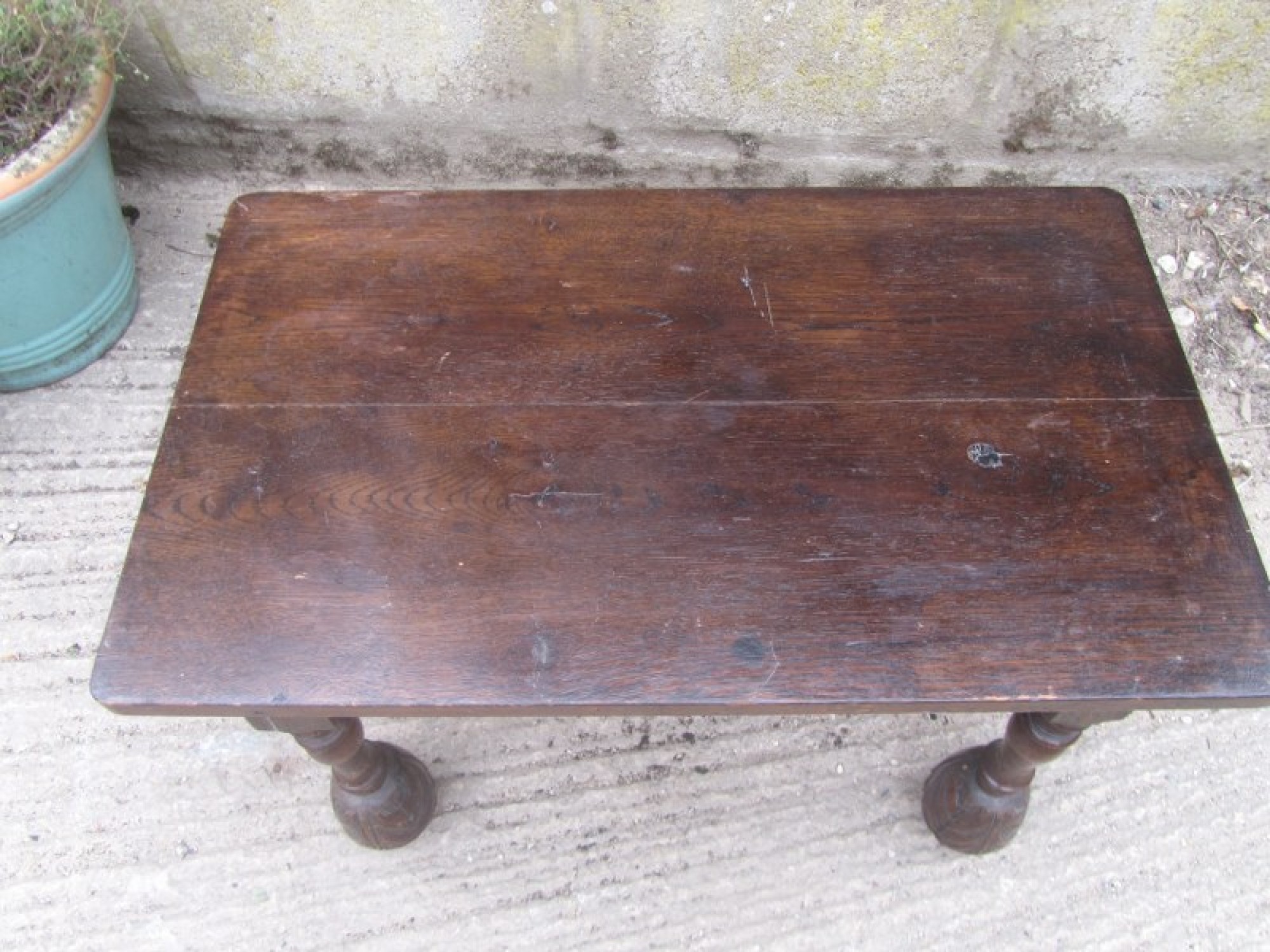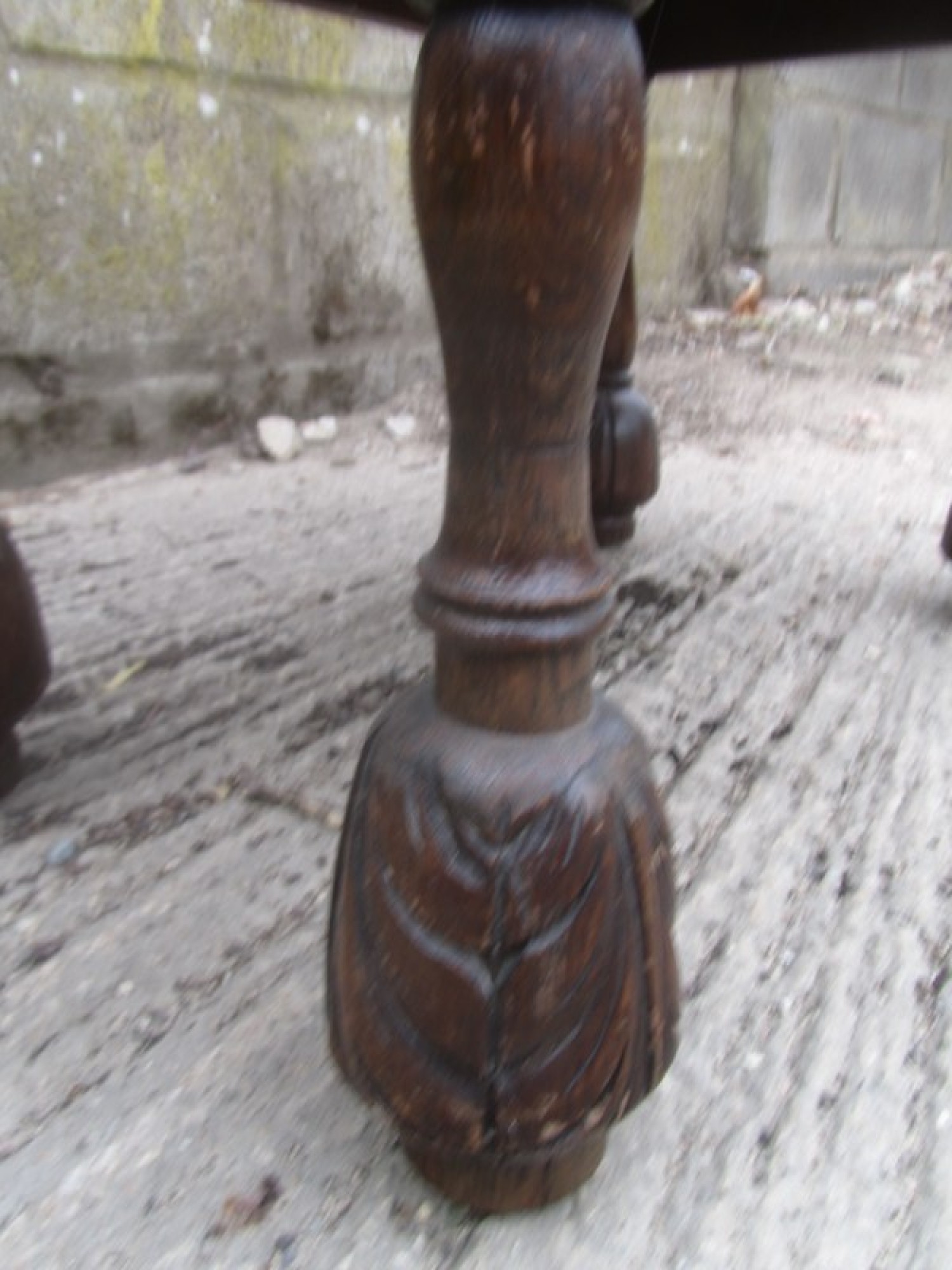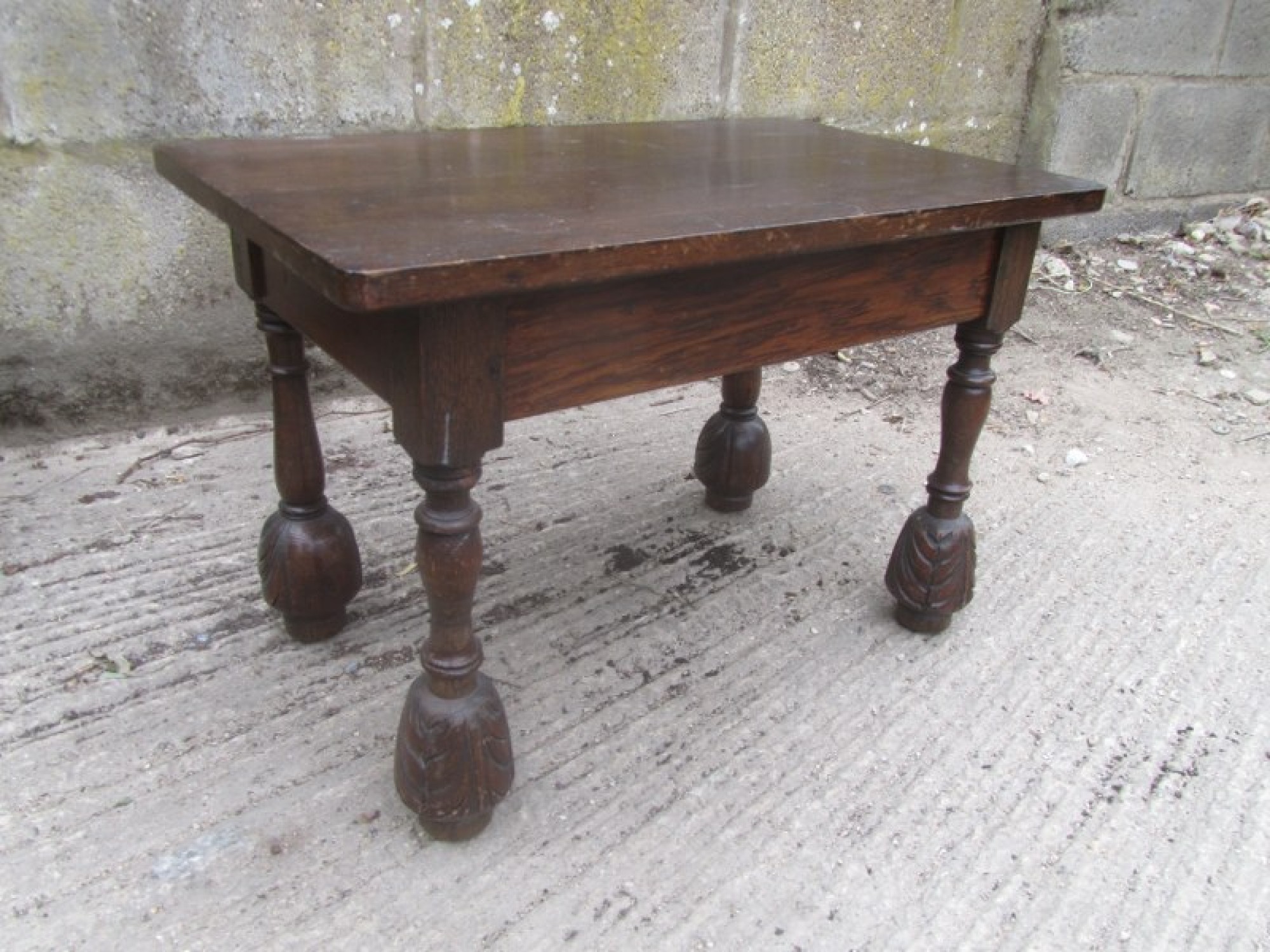 A SMALL TABLE, SOLID OAK. STRONG AND STURDY. CARVED DETAIL.