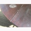 A SMALL SOLID WALNUT TABLE. IT HAS DROP LEAVES, A STRONG AND STURDY TABLE. TOO LOW FOR A DINING TABLE. SOME STAINS AND MARKS ON TOP.