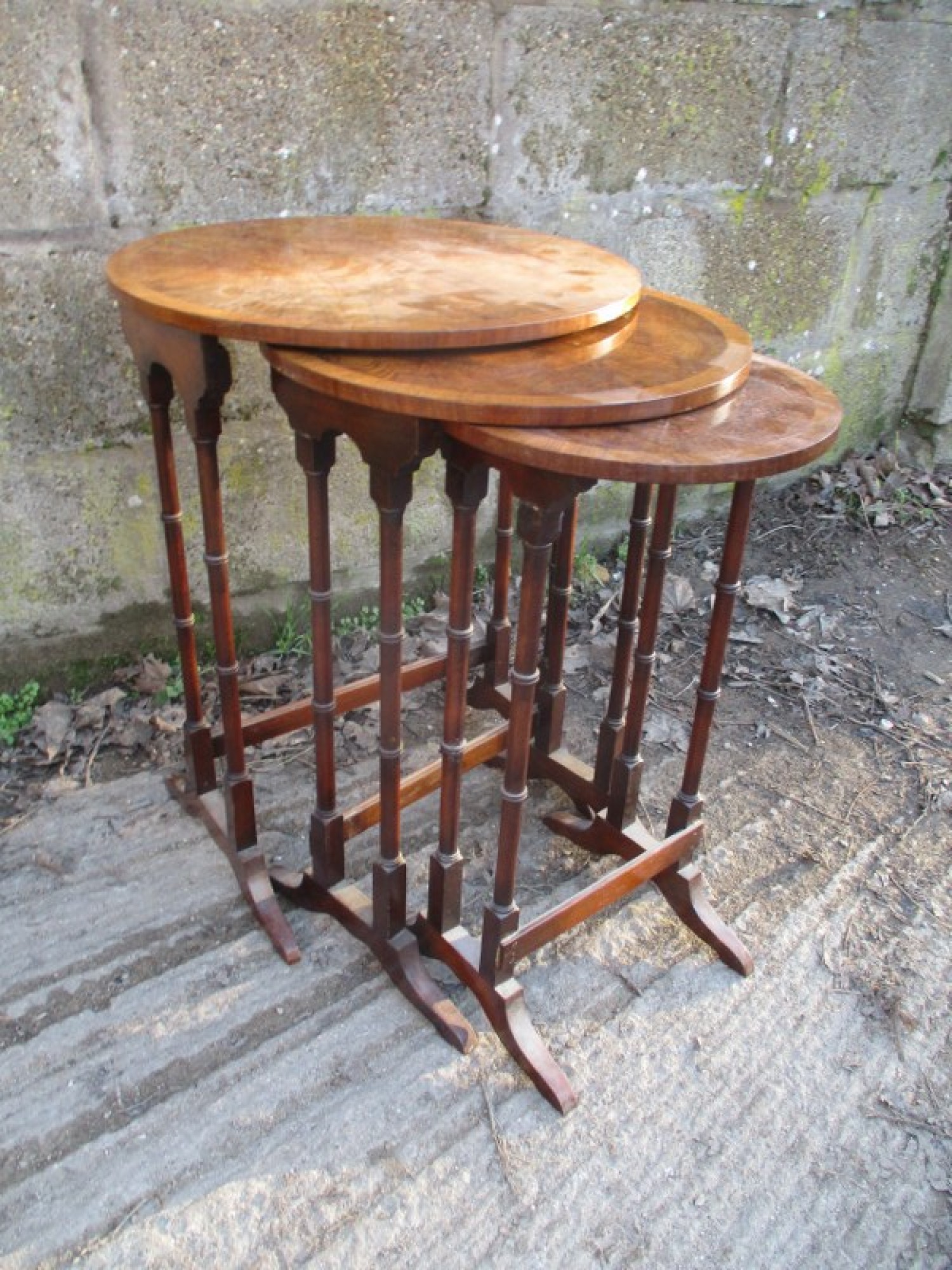 THIS IS A NEST OF 3 TALL WALNUT VENEERED TABLES. THEY ARE A GREAT SET FROM THE 1920s/30s. IDEAL AS COFFEE TABLES, OR OCCASIONAL TABLES. THEY ARE IN AVERAGE CONDITION. THE 2 SMALL TABLES NEATLY SIT INSIDE THE LARGE TABLE, SO DONT TAKE UP MUCH SPACE WHEN NOT IN USE.