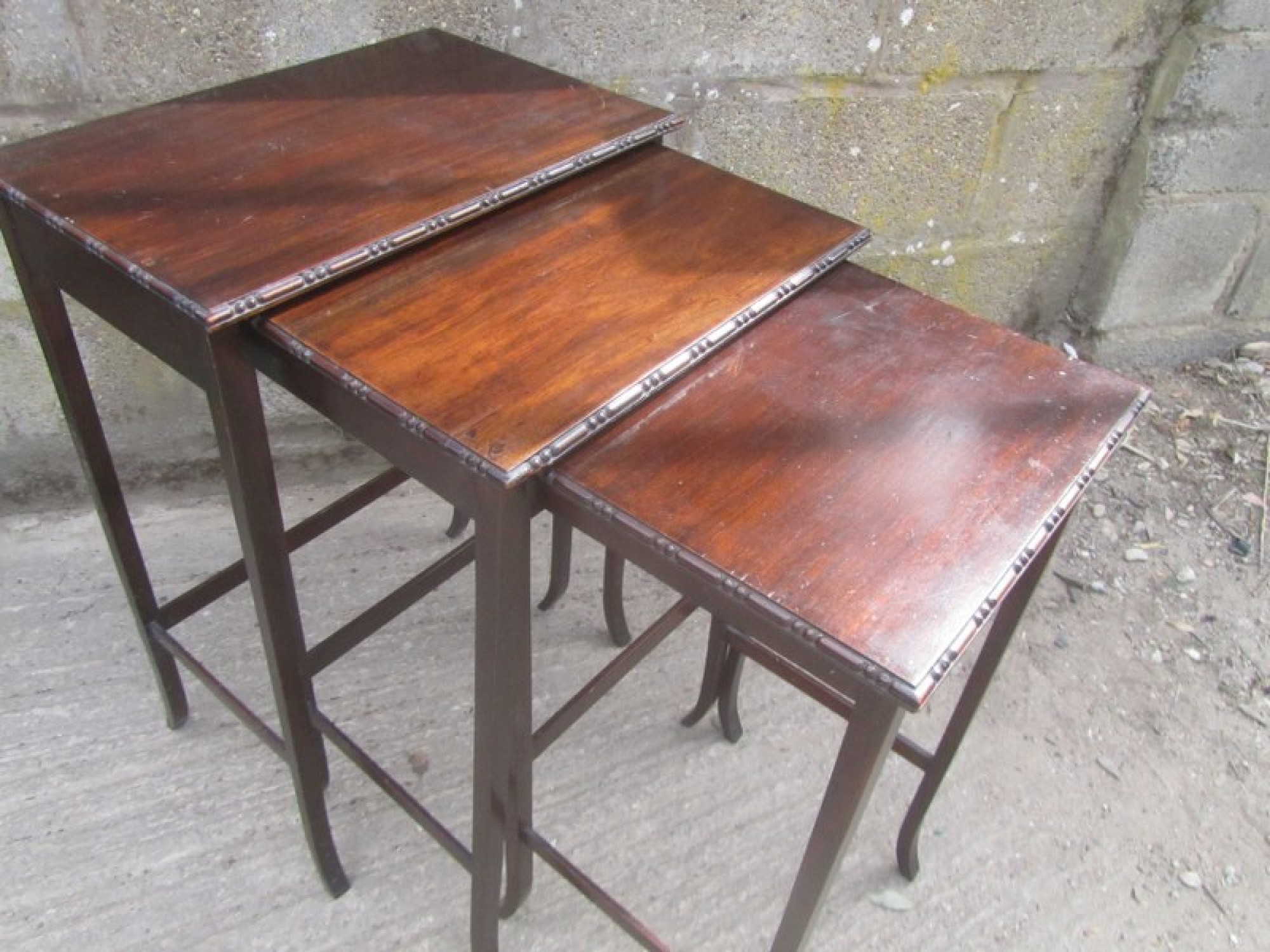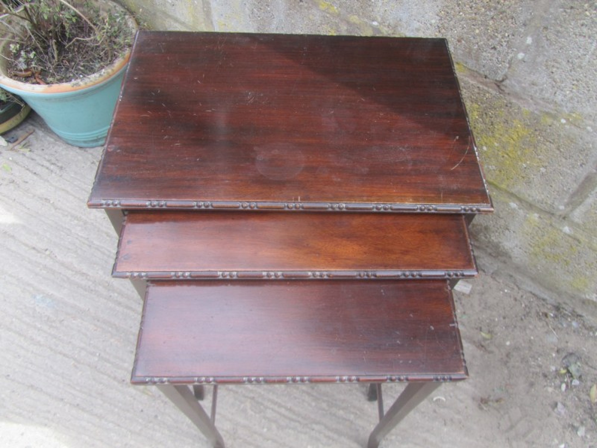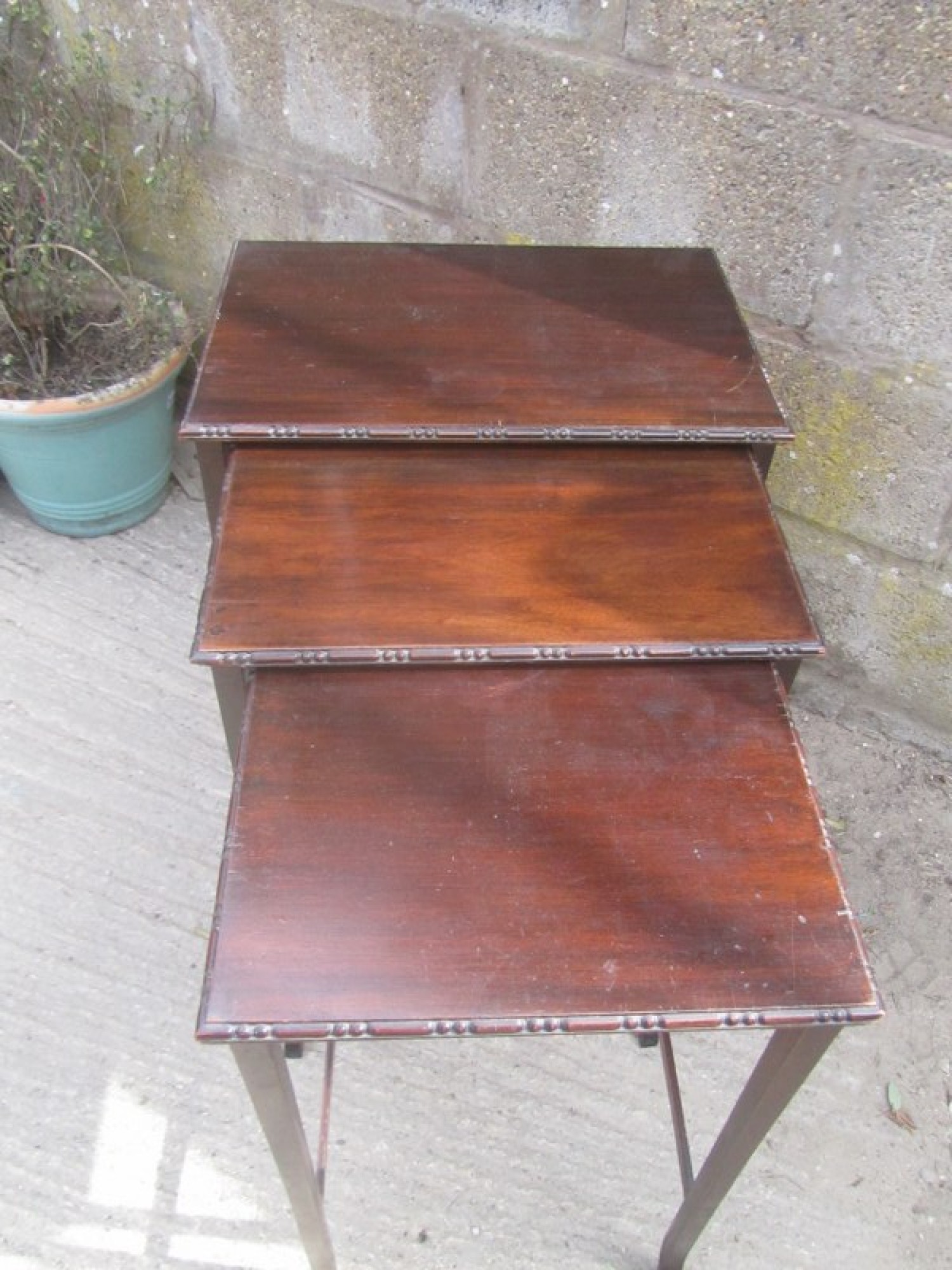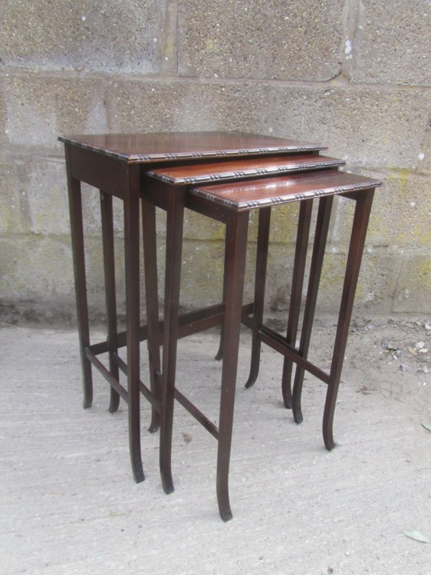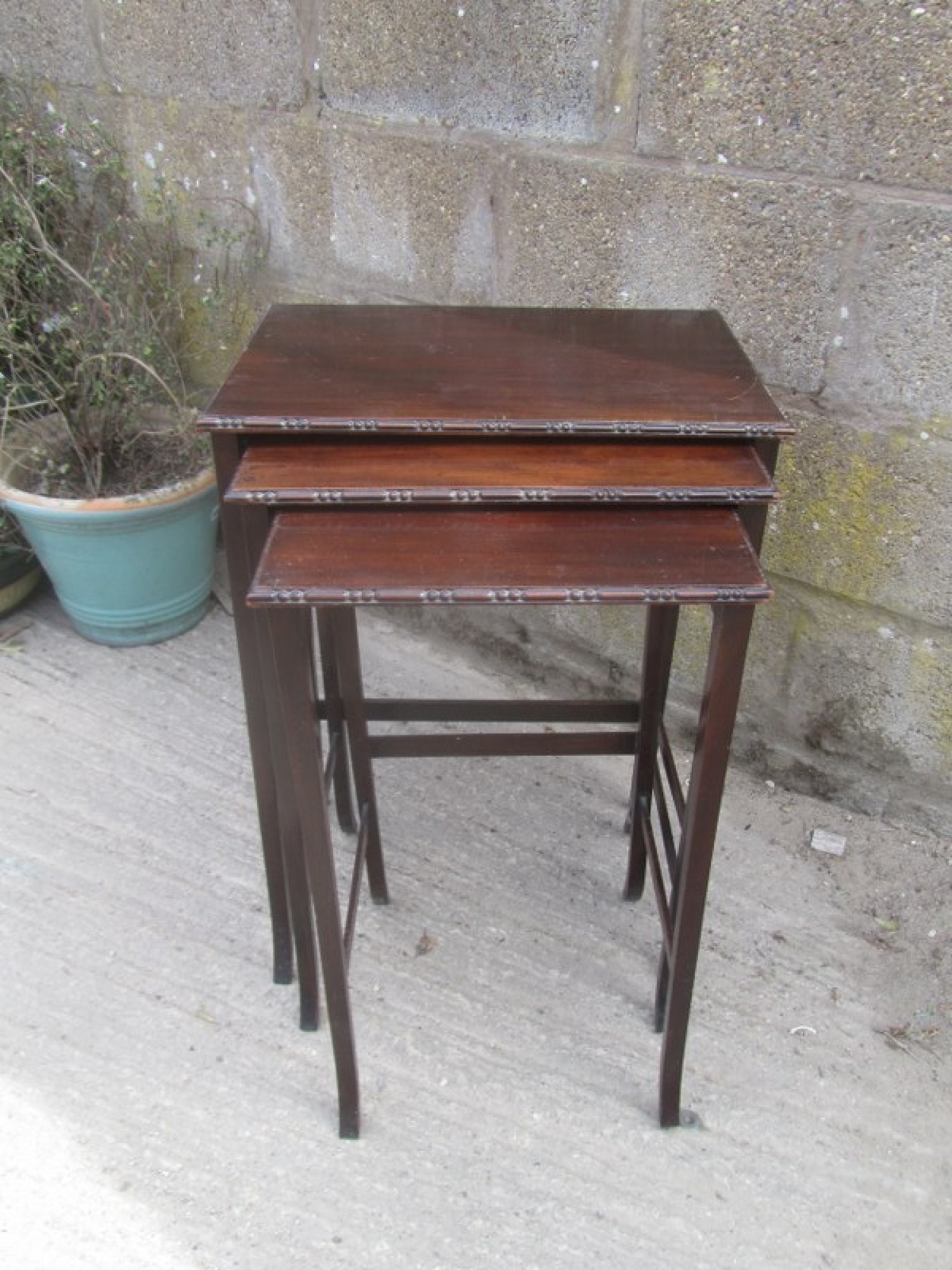 THIS IS A NEST OF 3 TALL WALNUT VENEERED TABLES. THEY ARE A GREAT SET FROM THE 1930s/40s. IDEAL AS COFFEE TABLES, OR OCCASIONAL TABLES. THEY ARE IN AVERAGE CONDITION. THE 2 SMALL TABLES NEATLY SIT INSIDE THE LARGE TABLE, SO DONT TAKE UP MUCH SPACE WHEN NOT IN USE.