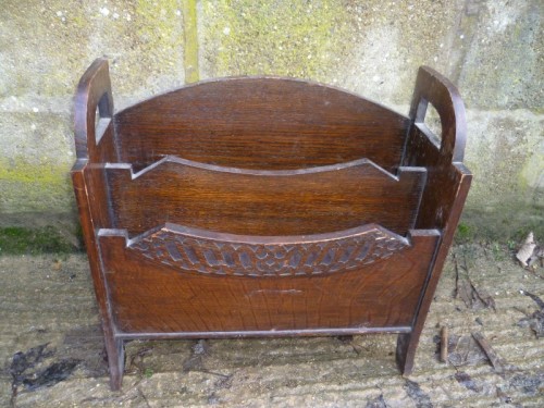 AN ANTIQUE OAK MAGAZINE RACK, STRONG AND STURDY, GOOD QUALITY.