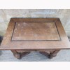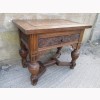THIS IS A SOLID OAK SIDE TABLE. THE TABLE TOP HAS A DECORATIVE CARVED PATTERN. DRAW LEAF TABLE TOP. SOME OLD WOOD WORM HOLES. STRONG AND STURDY.