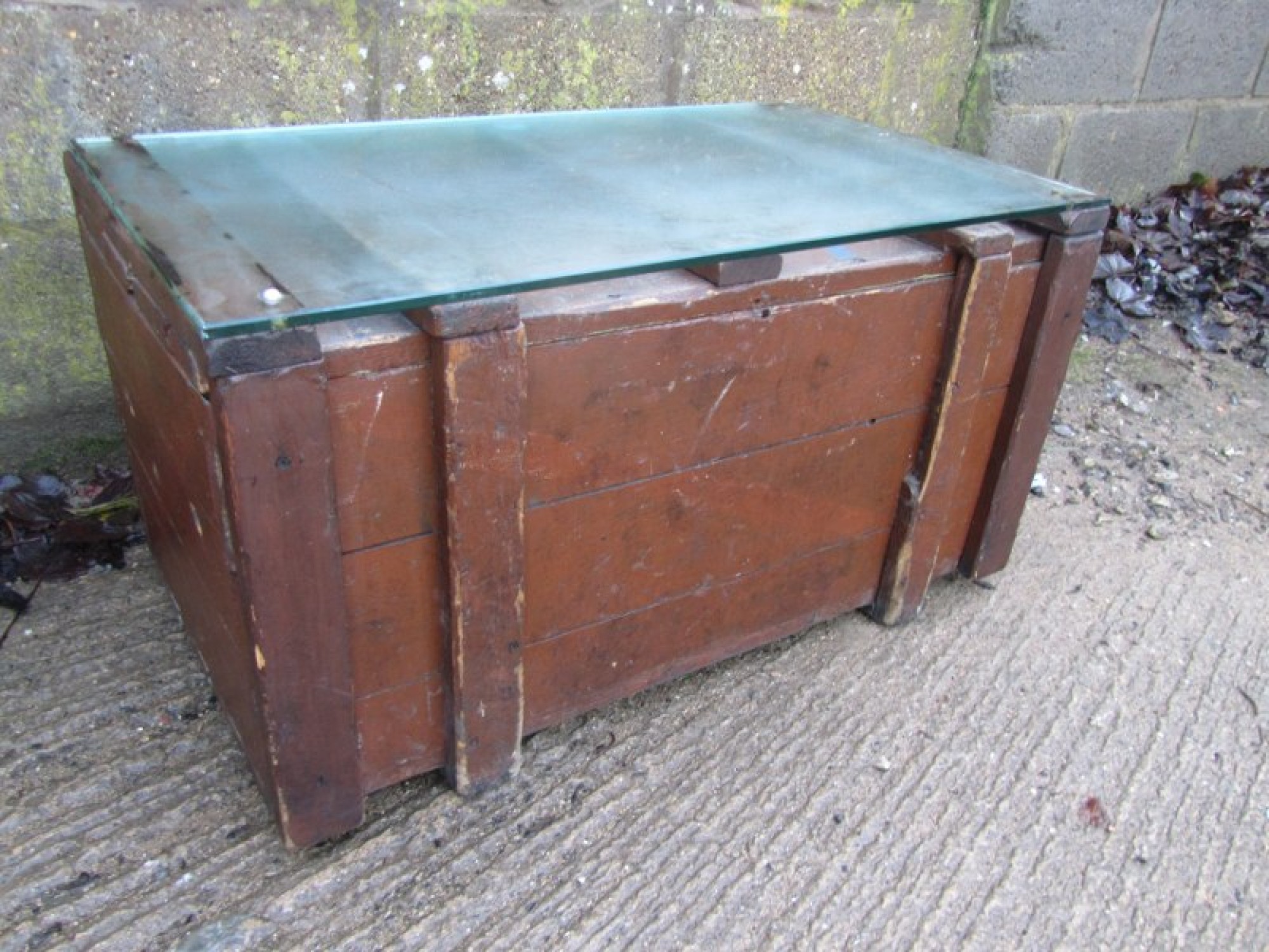 THIS IS AN ANTIQUE SOLID PINE BOX, WORN CONDITION. SOME WEAR, BUT STILL STURDY. PAINTED IN OLD WORN PAINT. IT HAS BEEN USED AS A COFFEE TABLE IN A PUB, WITH FITTED GLASS TOP.
