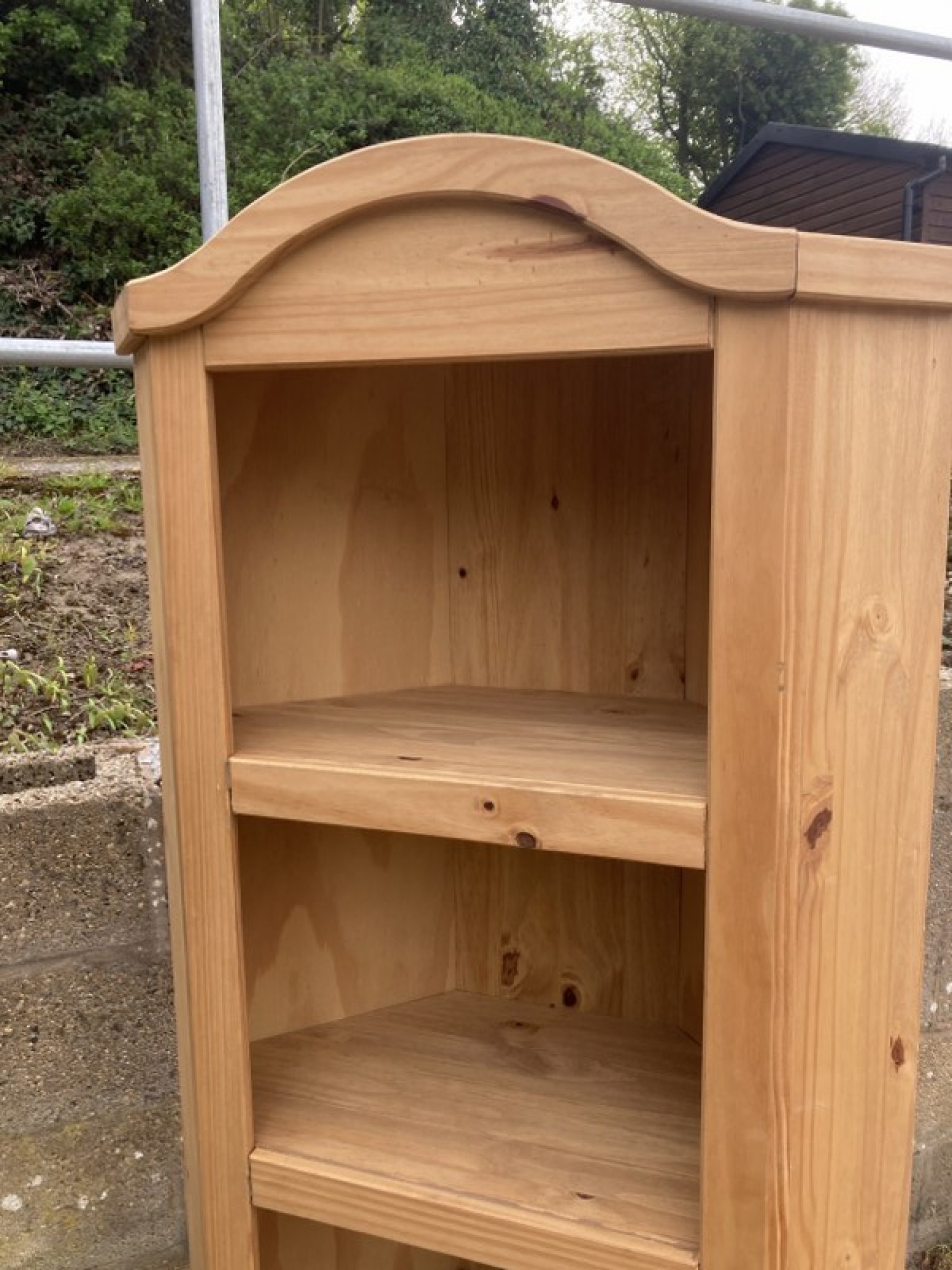 A SOLID PINE CORNER CABINET WITH SHELVES. STRONG AND STURDY. ALL ONE PIECE.