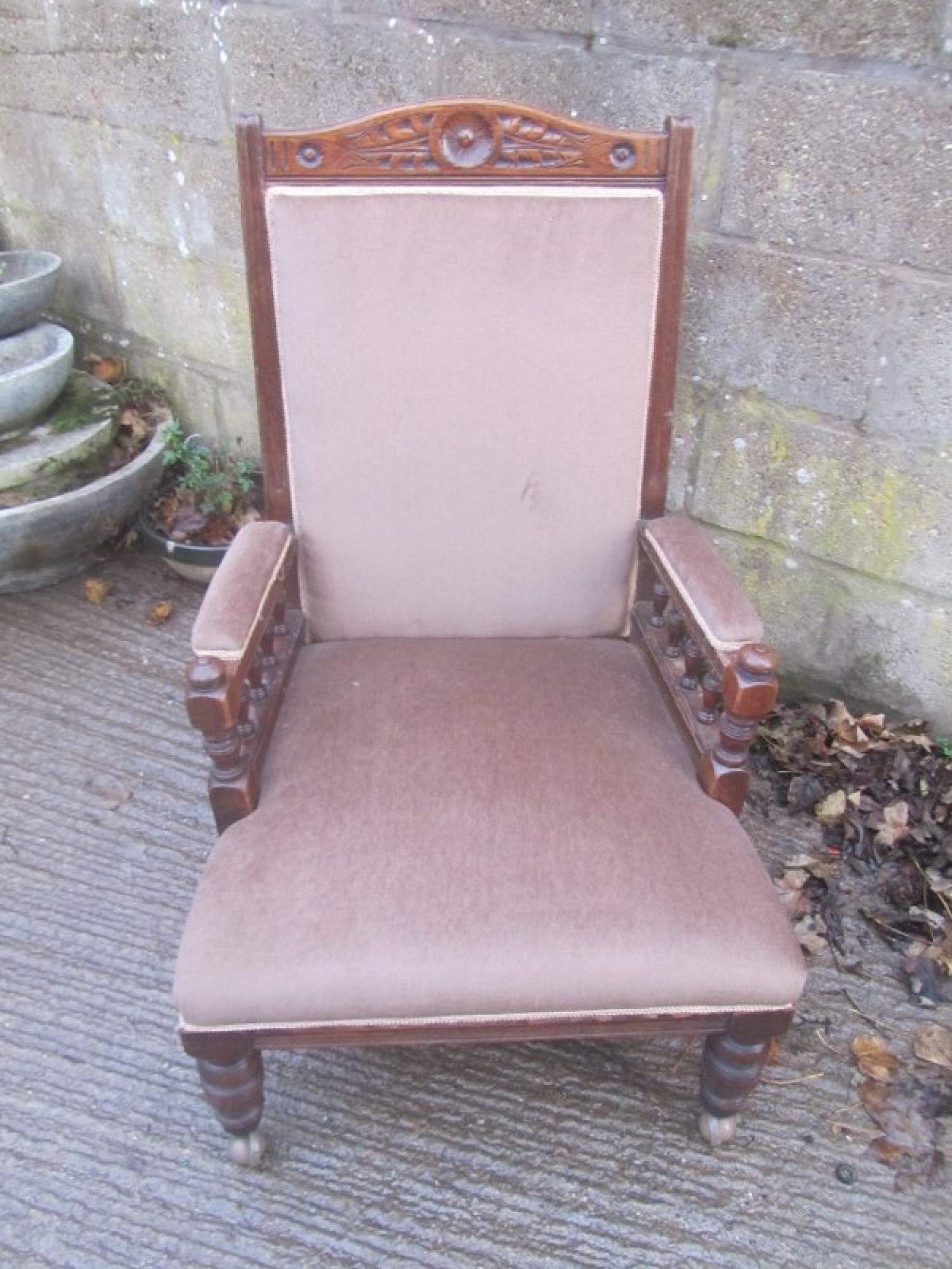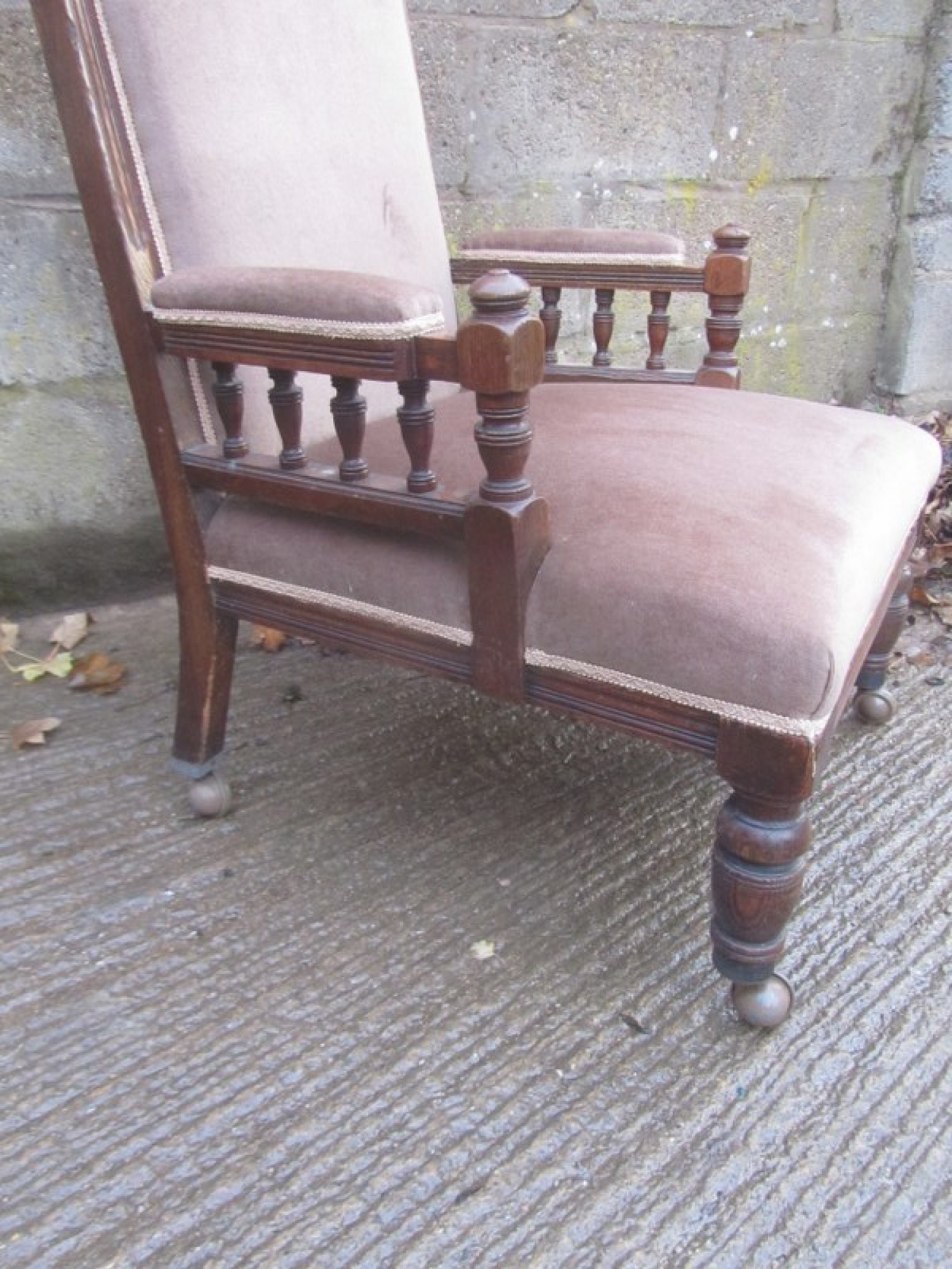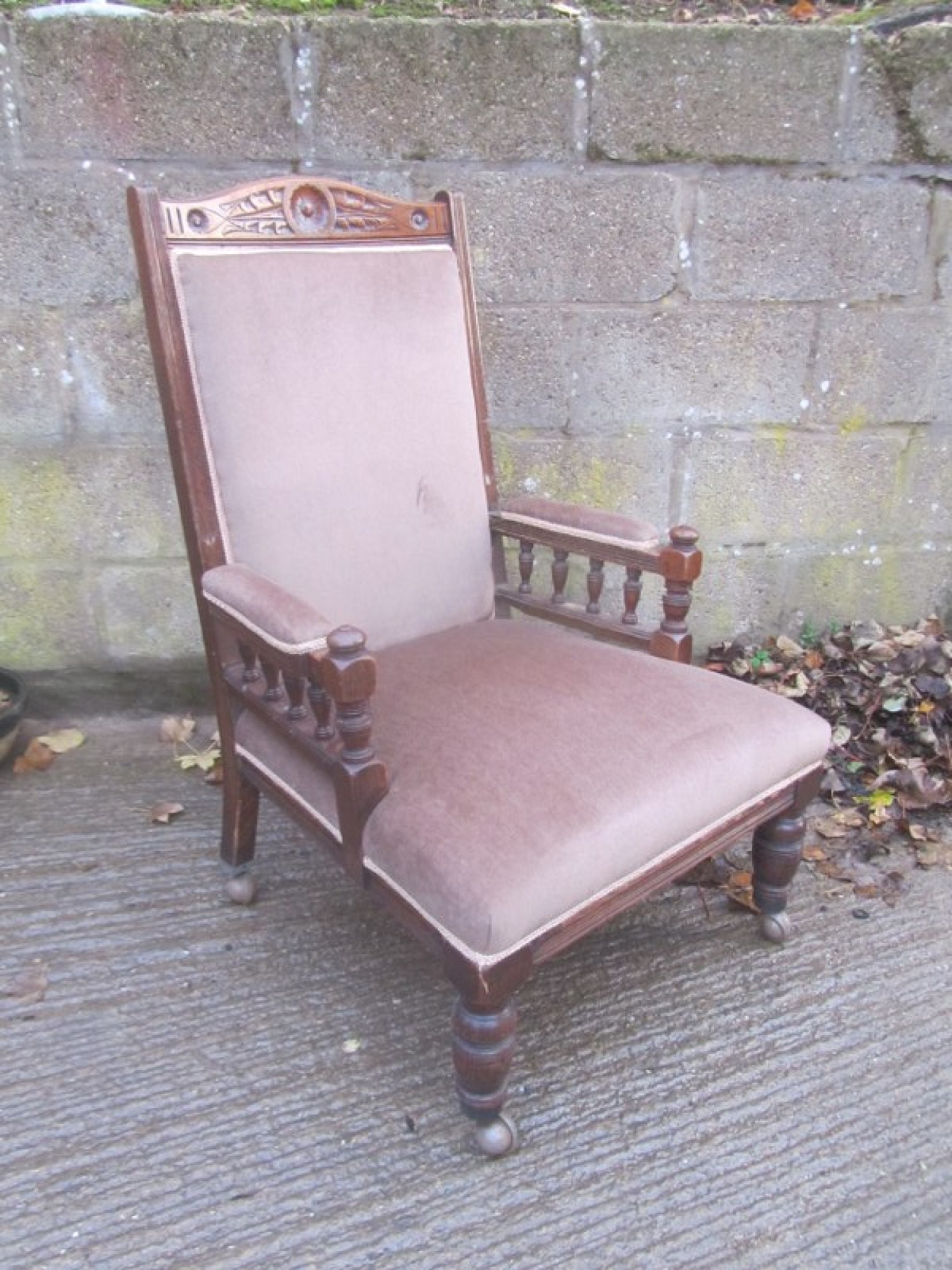 THIS IS A CHAIR FOR THE LIVING ROOM, BEDROOM OR ANYWHERE IN THE HOME. THE FRAME IS IN SOLID OAK, WITH CARVED DETAIL. ON SMALL CASTORS, NOT ORIGINAL. THE BACK REST AND SEAT ARE PADDED AND COVERED IN MATERIAL, SOME LIGHT MARKS.