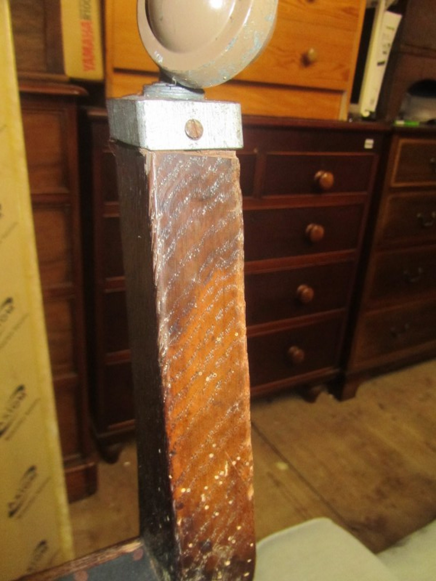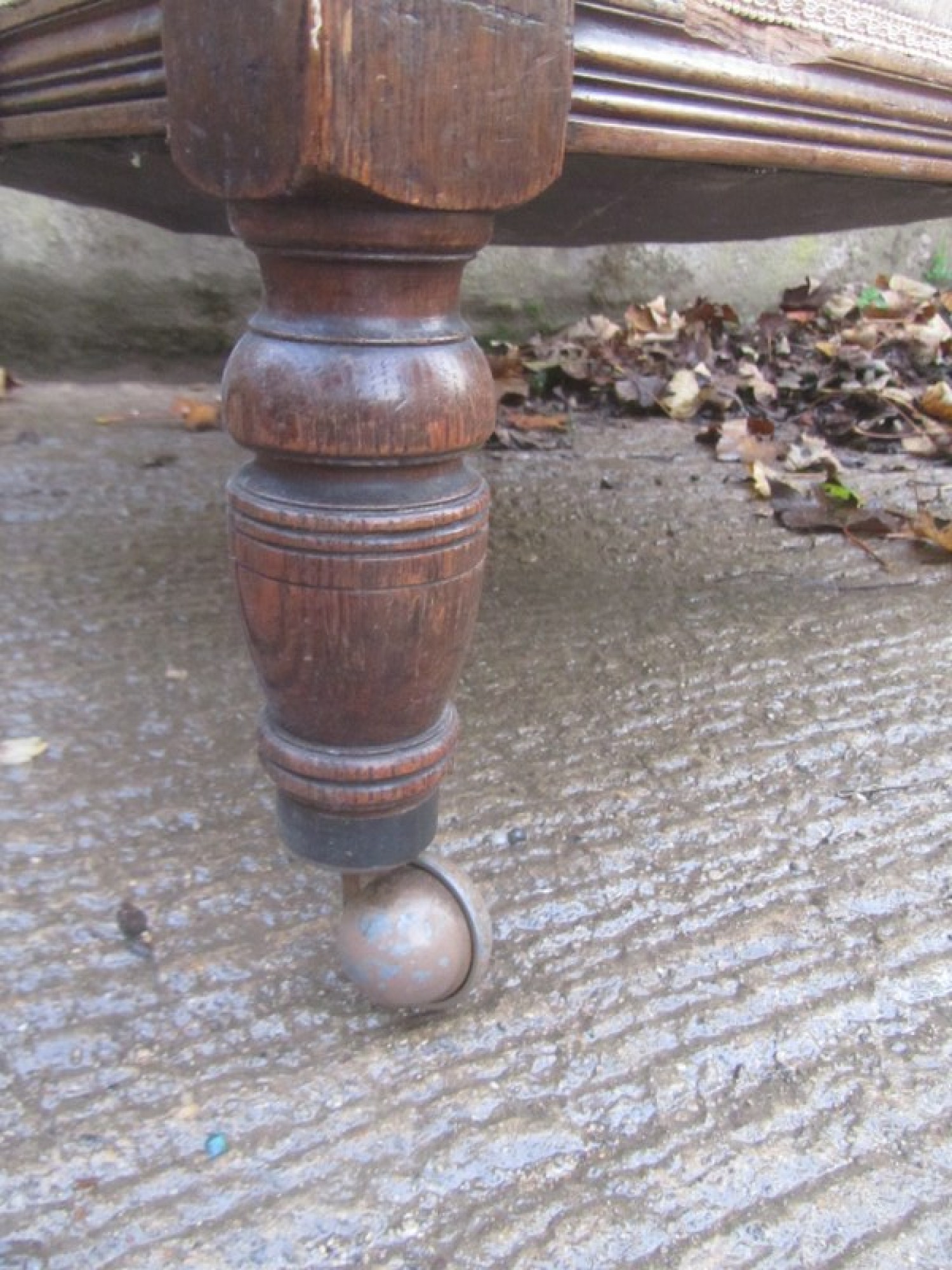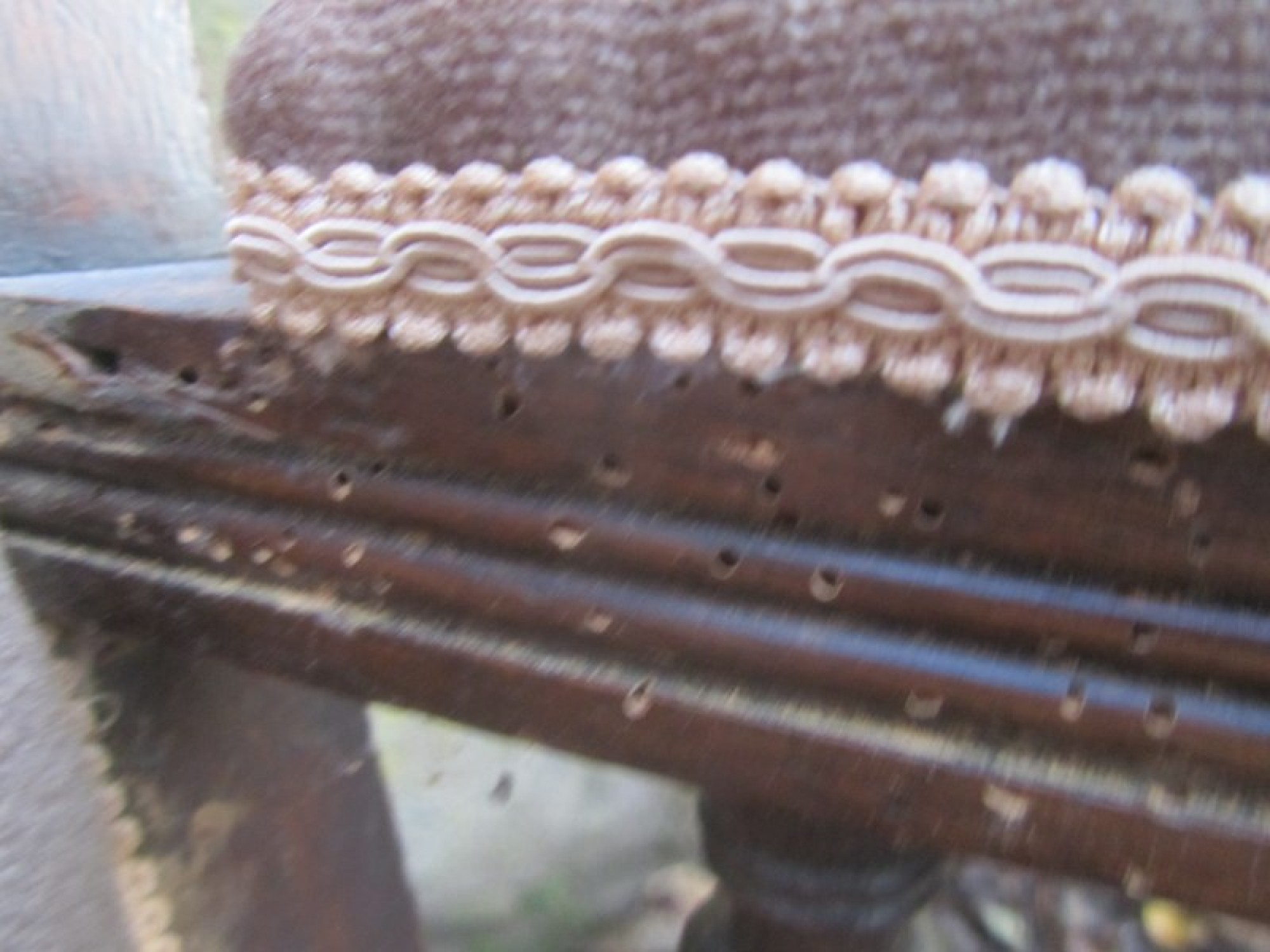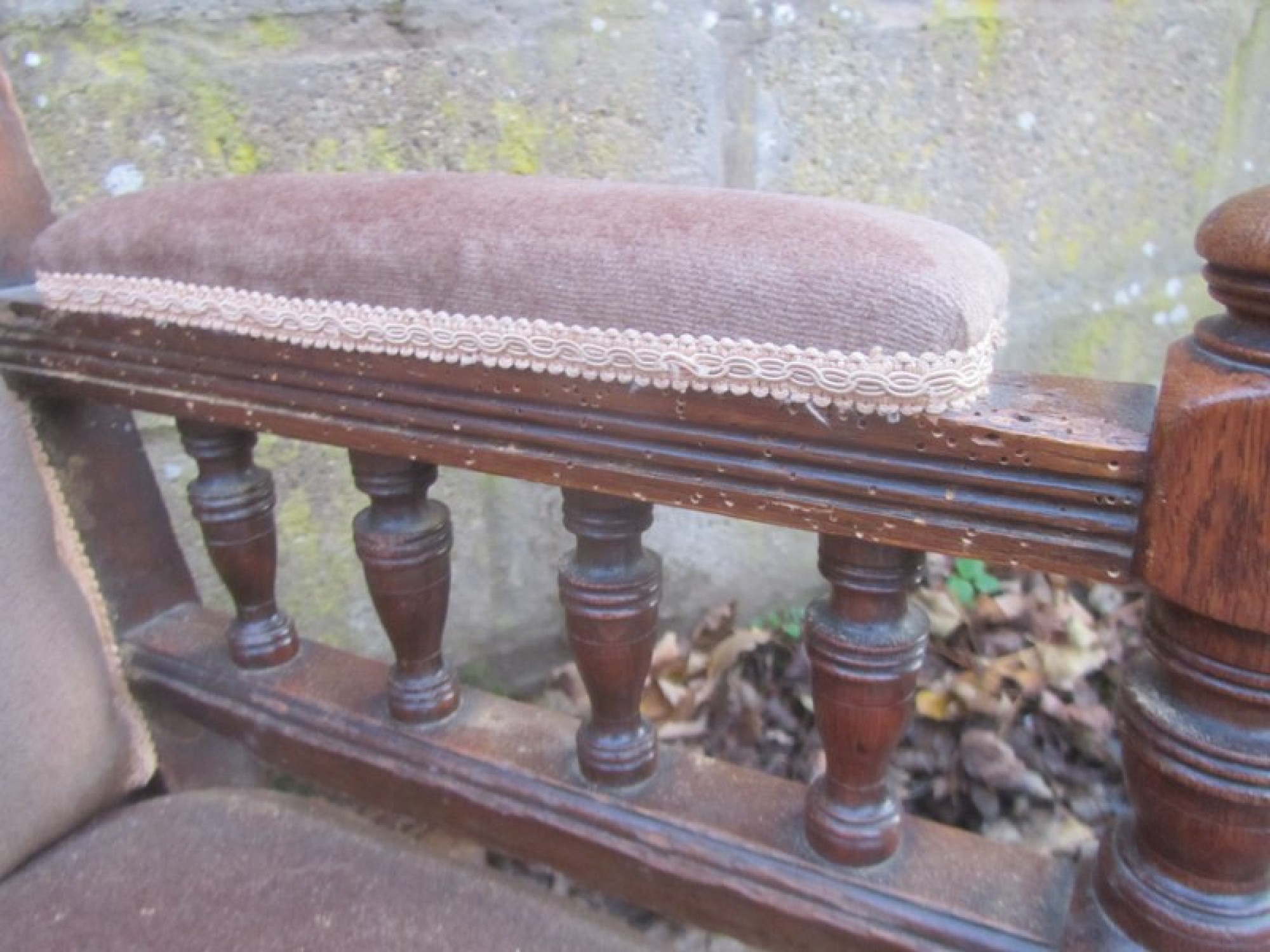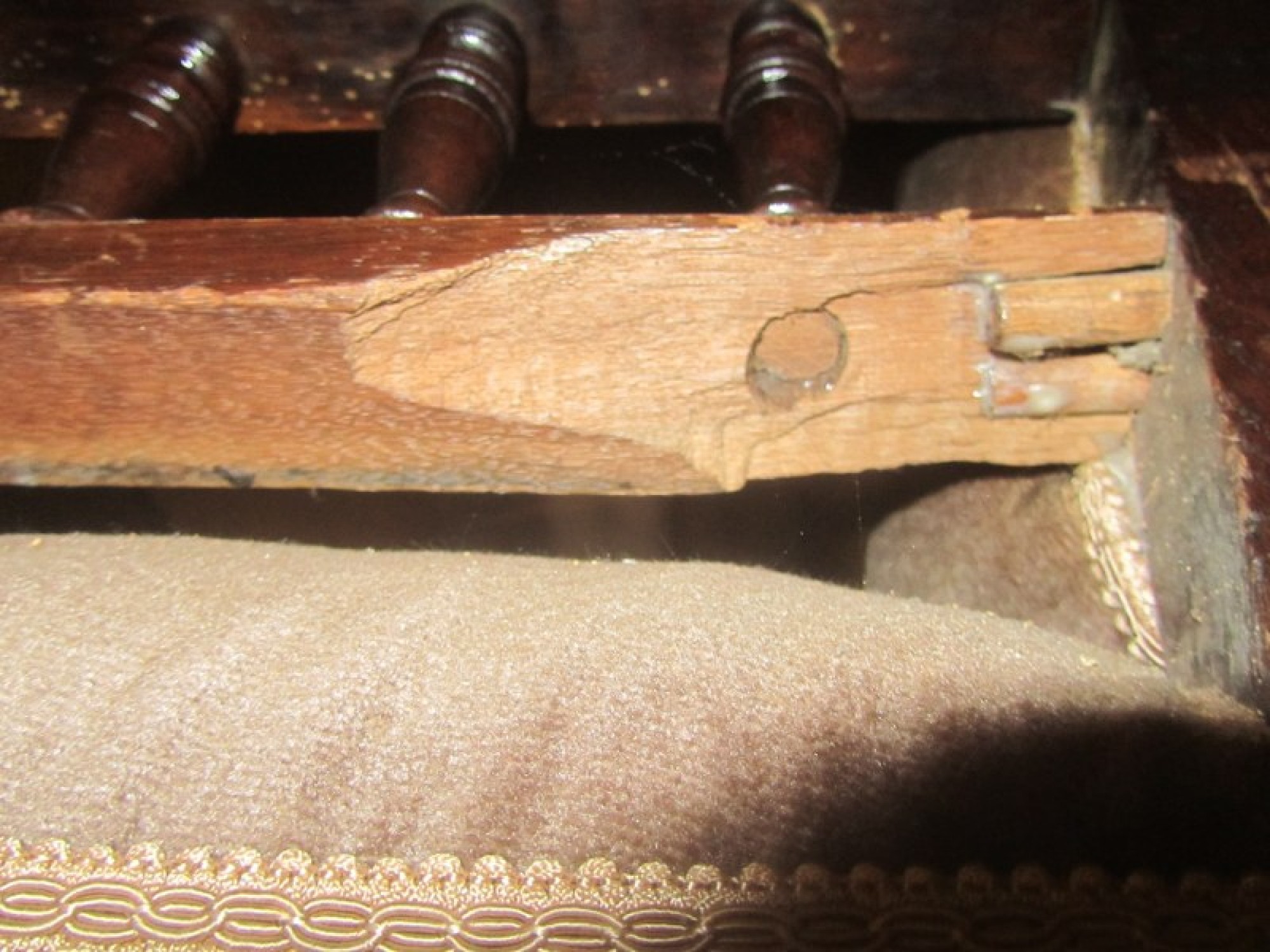 THERE IS DAMAGE TO ONE ARMREST. ONE LEG AND ONE ARM REST HAVE SUFFERED WITH WOOD WORM IN THE PAST, IT IS PROBABLY LONG DEAD! IT HAS BEEN TREATED BUT I WOULD RECOMMEND TREATING IT AGAIN TO BE SURE. IN NEED OF REPAIR.