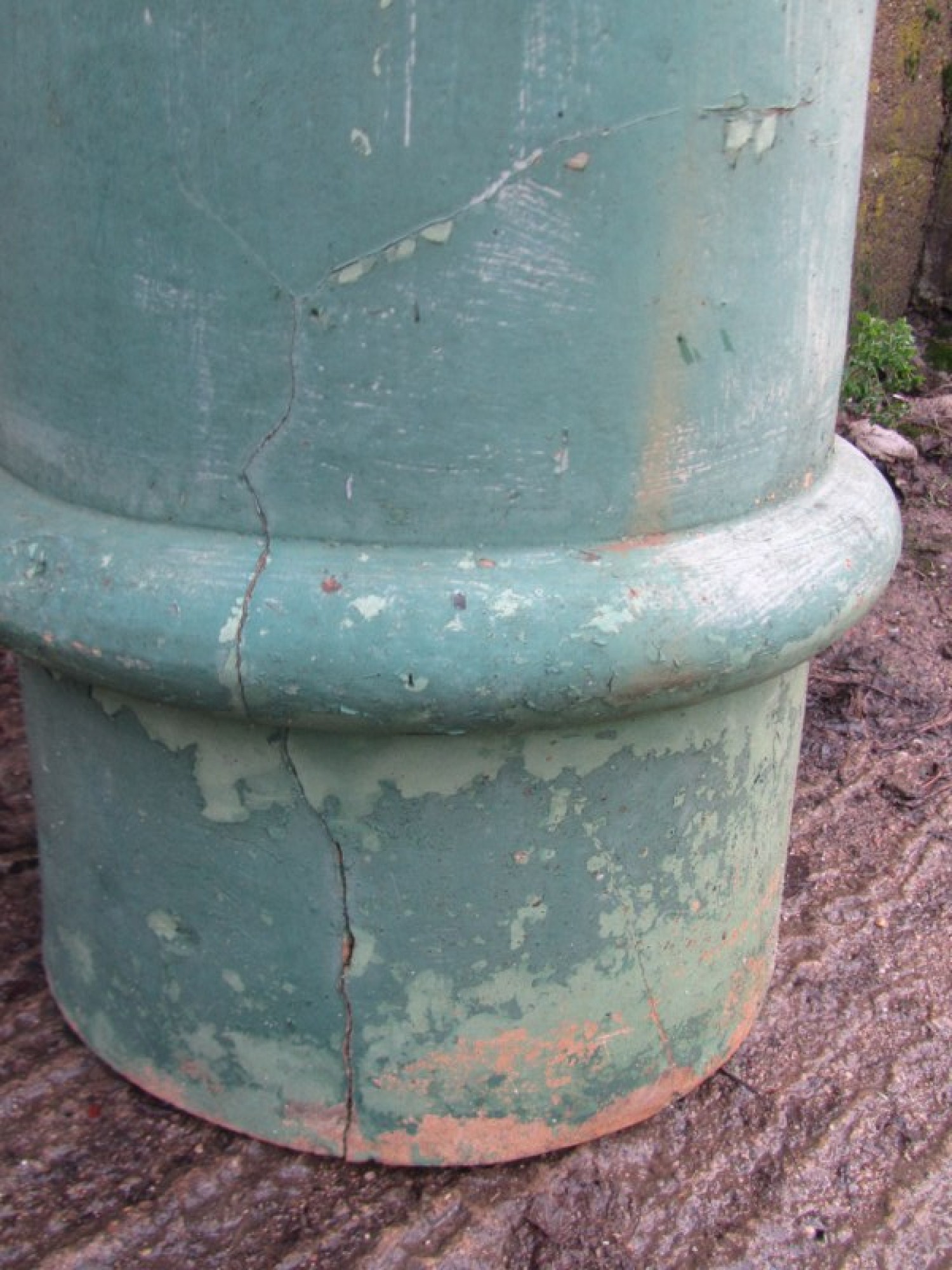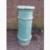 AN ANTIQUE CHIMNEY POT, BEYOND USE AS A CHIMNEY, BUT GREAT AS A GARDEN FEATURE, IT HAS BEEN USED AS A PLANTER IN THE GARDEN. SOME CHIPS AND WEAR, PAINTED GREEN. CRACKED BUT GLUED BACK TOGETHER.
