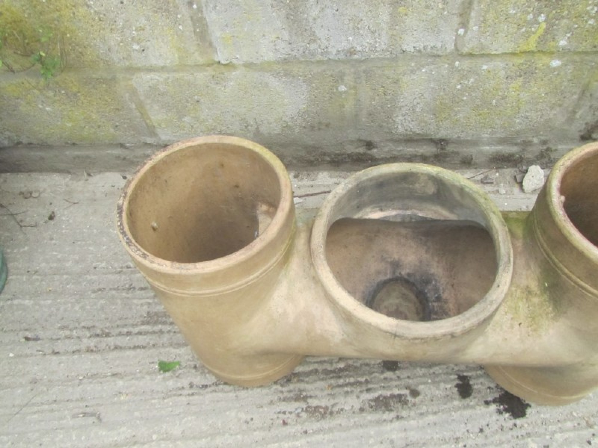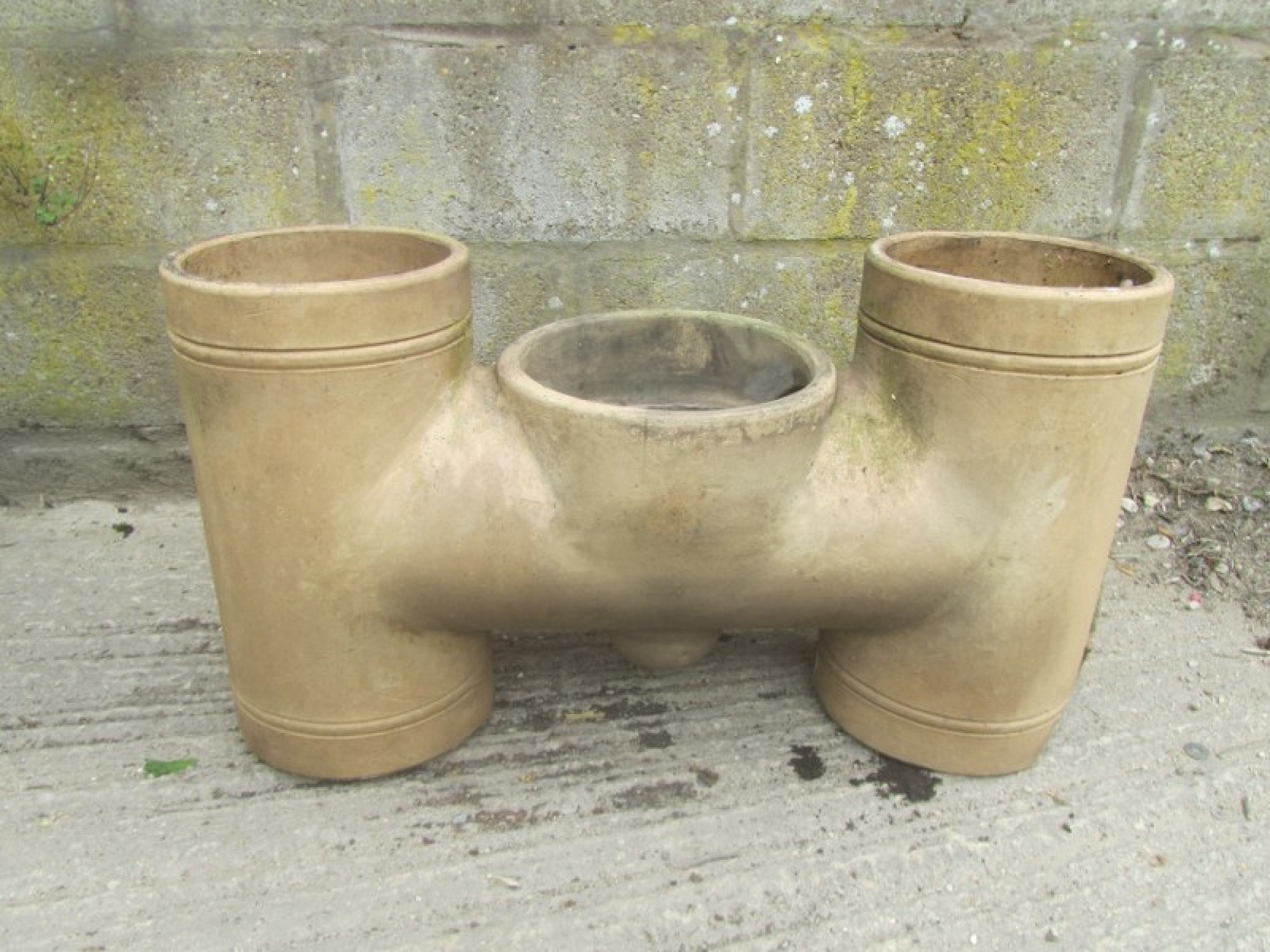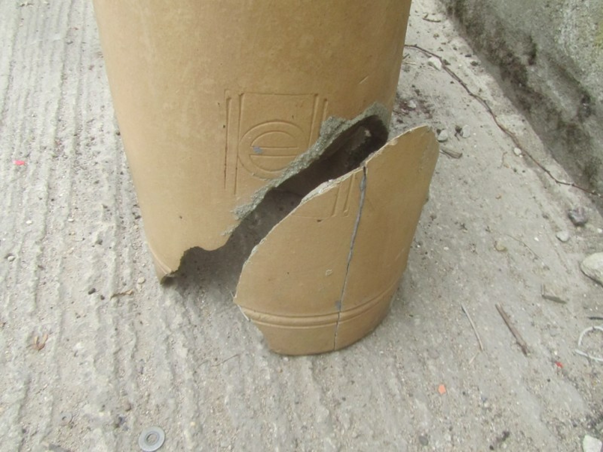A LARGE CHIMNEY POT, A LARGE PIECE IS DAMAGED AND PARTLY MISSING, SOME CHIPS/CRACKS. BEYOND USE AS A CHIMNEY, BUT GREAT AS A GARDEN FEATURE, IT HAS BEEN USED AS A PLANTER IN THE GARDEN.