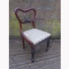 AN ANTIQUE CHAIR FROM AROUND THE 1880s. THERE IS AN ELEGANT SHAPED BACK REST. THE FRAME IS OK, FAIRLY STURDY BUT A DELICATE CHAIR. IDEAL FOR ANYWHERE IN THE HOME, COULD BE USED AS HALL, DINING OR BEDROOM CHAIR. HEIGHT TO SEAT IS 45cm. OLD REPAIRS TO THE FRAME. THE MATERIAL IS STAINED.
